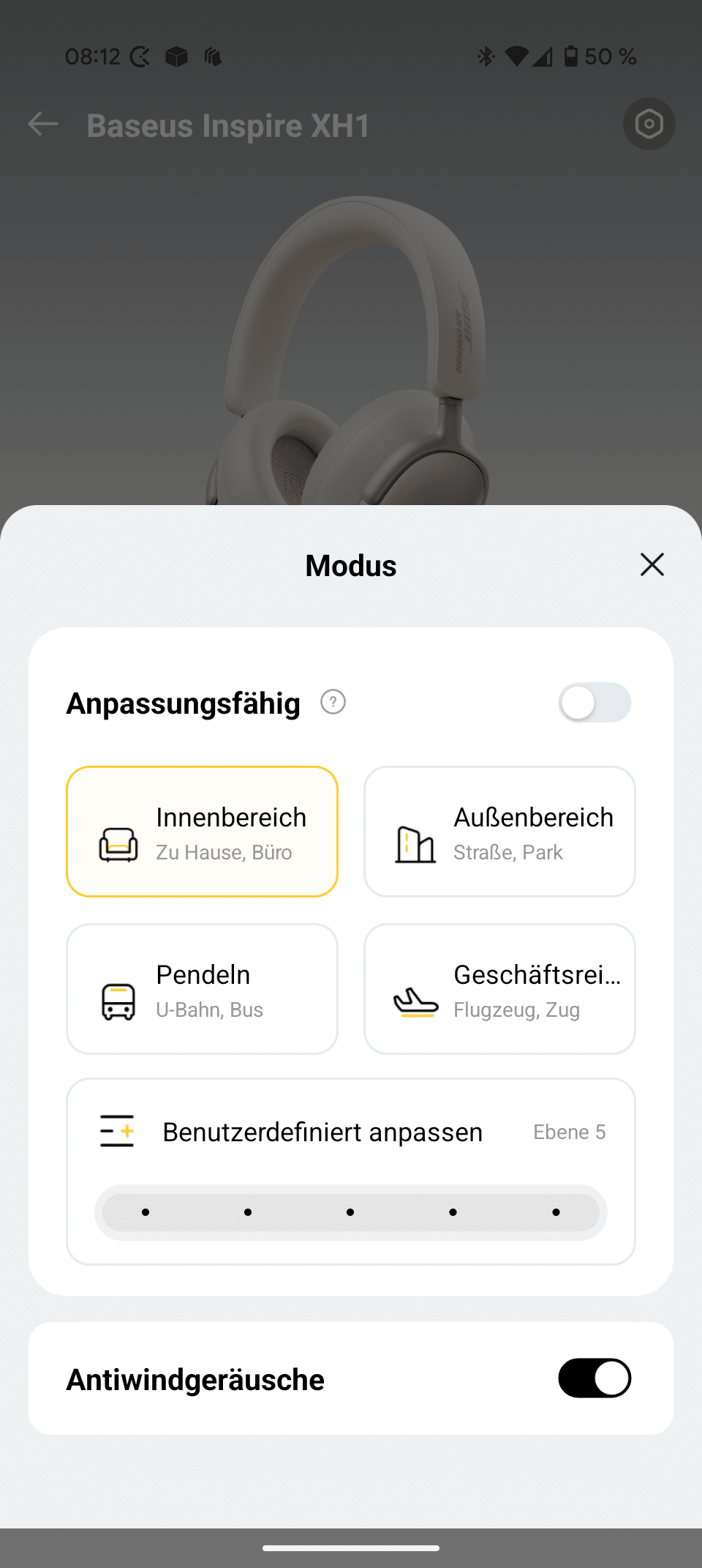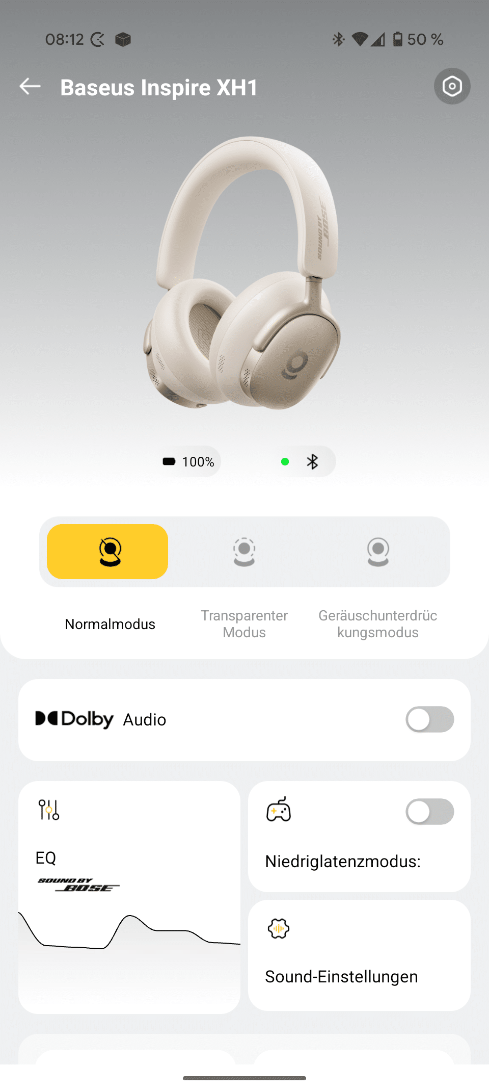 Besonders komfortabel ist die tiefe Integration mit der Baseus-App: Hier lassen sich nicht nur Klangmodi und ANC-Stufen wählen, sondern auch individuelle Einstellungen vornehmen. Der integrierte 8-Band-Equalizer hebt den Inspire XH1 deutlich von der Konkurrenz ab, da sich das Klangbild umfassend anpassen lässt – auch eigene Profile sind schnell erstellt.