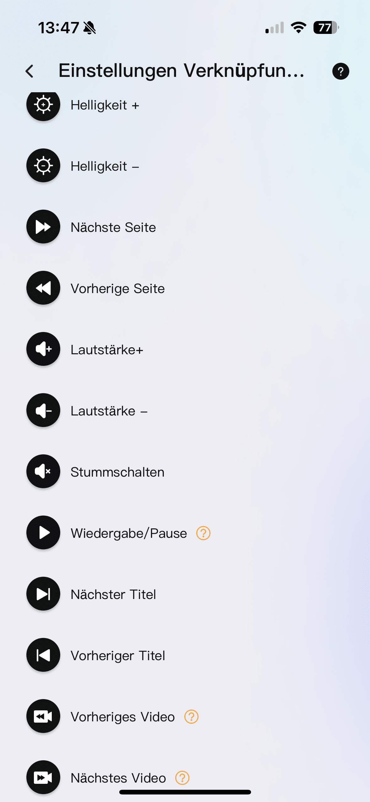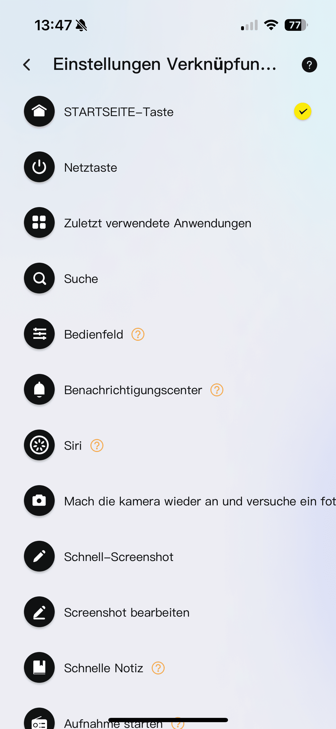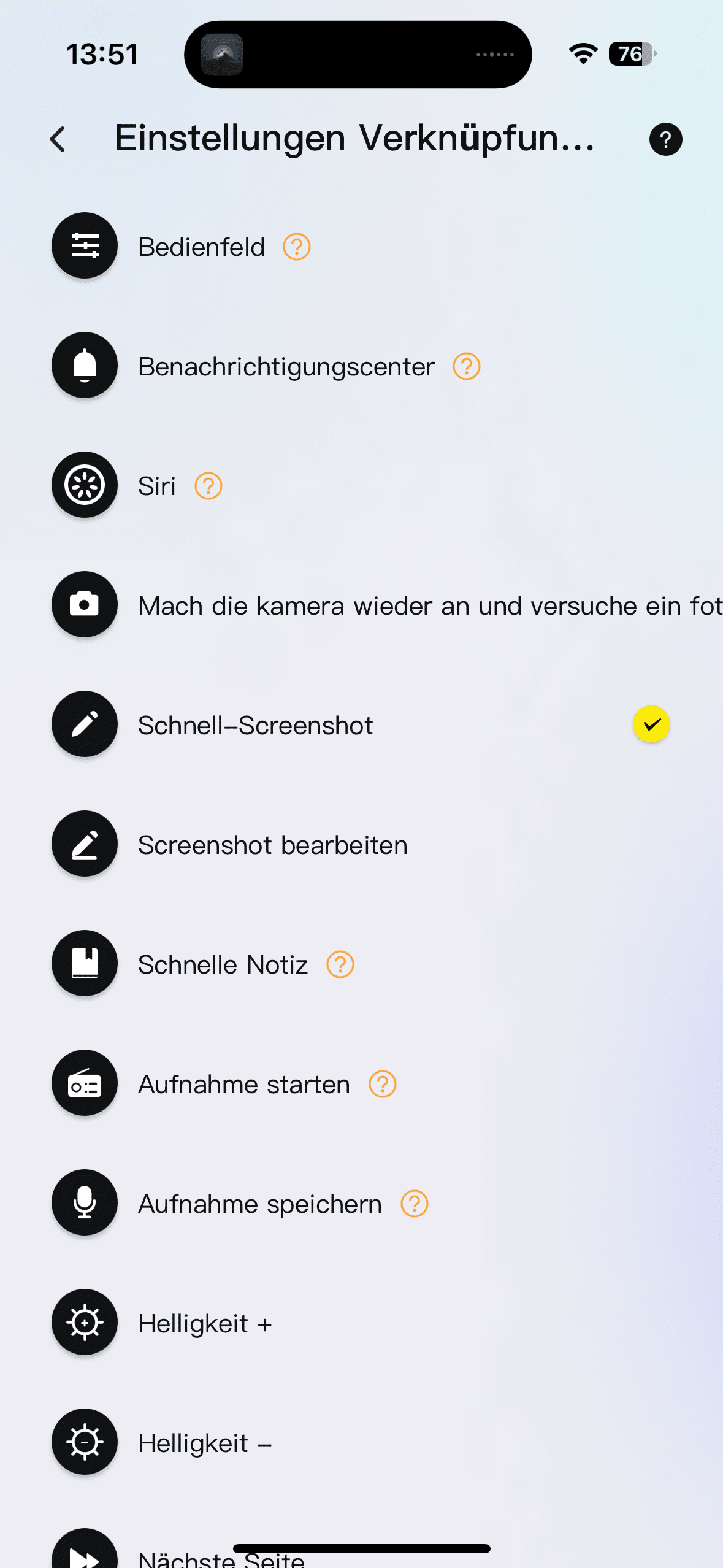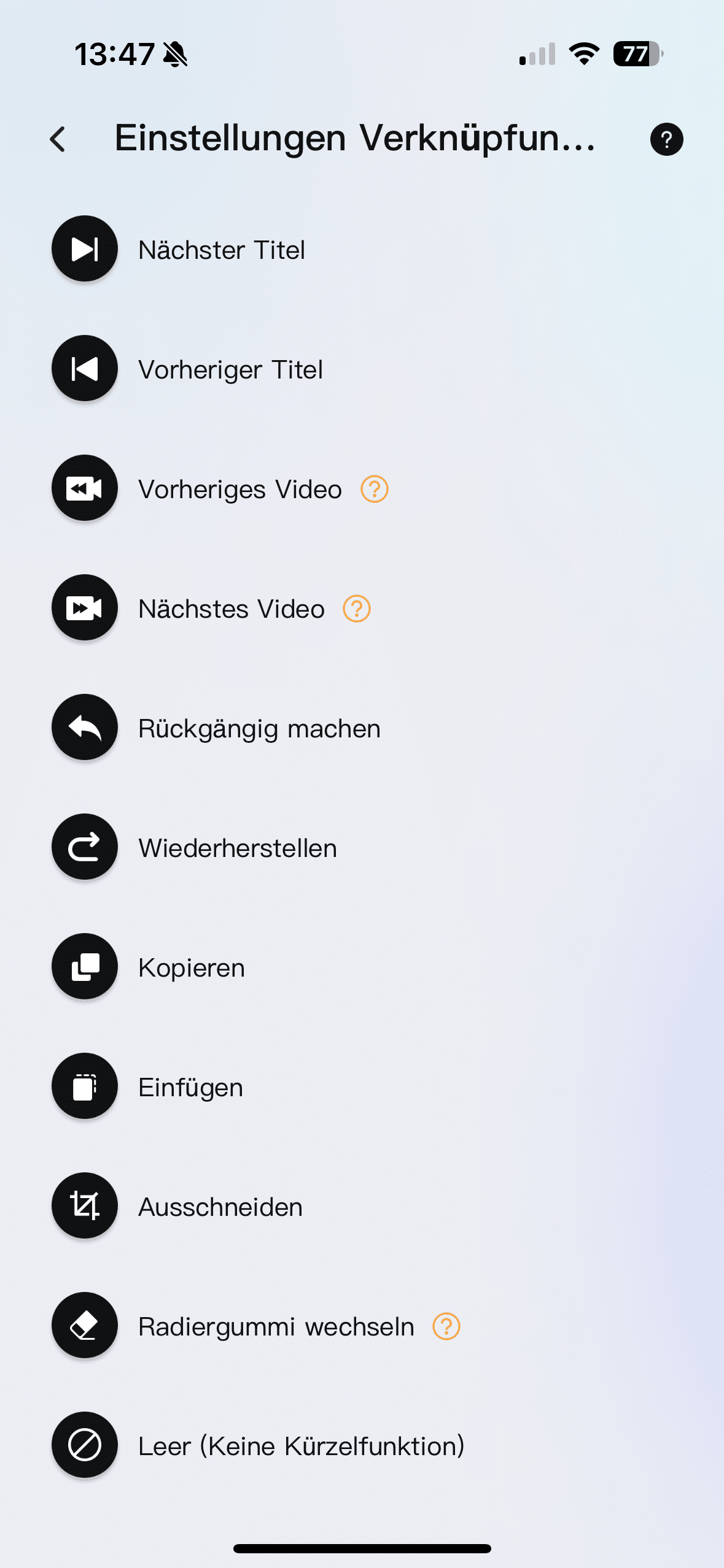 | Doppelklick | Zugriff auf benutzerdefinierte Shortcuts wie „rückgängig machen“ oder „Foto“ (Shortcuts werden in der App festgelegt) |