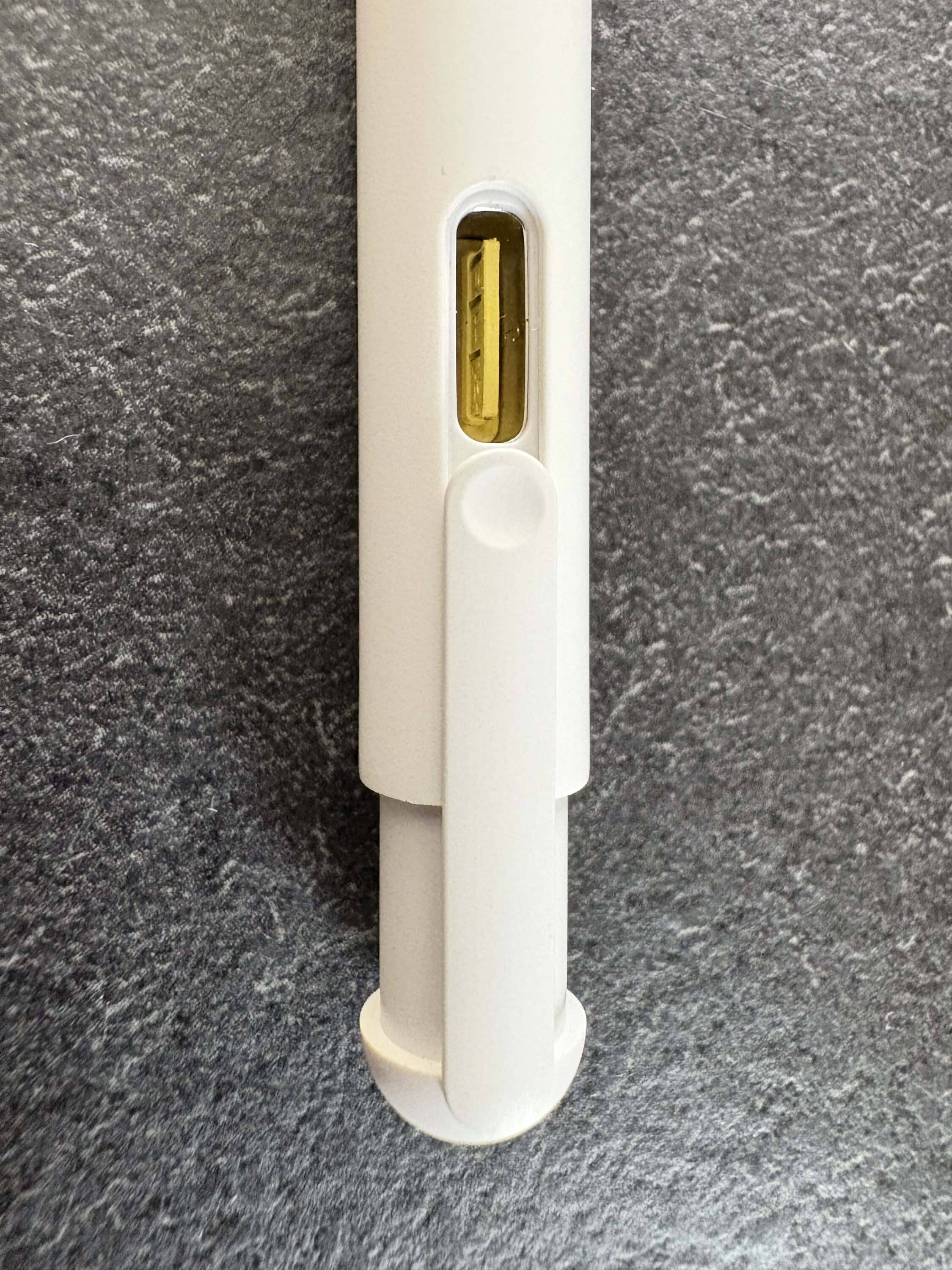 Das Design des PS4 ist auf den ersten Blick minimalistisch und elegant. Mit seinem schlichten Weiß und der matten Oberfläche liegt er angenehm in der Hand und erinnert in seinem Look & Feel ganz klar an Apples hauseigenen Stylus. Besonders praktisch ist der versteckte USB-C-Ladeanschluss, der durch eine integrierte Staubschutzkappe geschützt ist. Um an den USB-Port zu gelangen, müsst ihr einfach nur die Abdeckung zur Seite schieben.