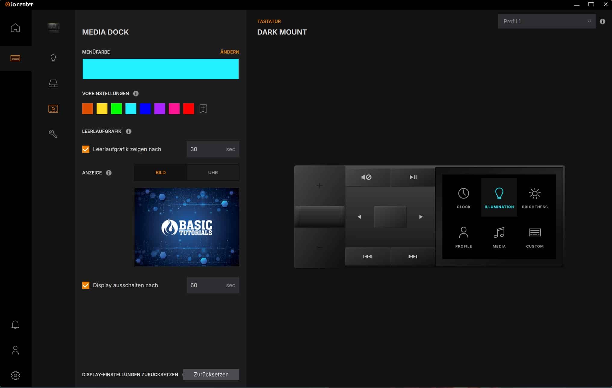 Unter dem Punkt „Media Dock“ lässt sich das Display des Docks mit einem eigenen Bild versehen, die Menüfarbe anpassen und der Bildschirm-Timeout justieren. Zu guter Letzt könnt ihr in den weiteren Einstellungen unter anderem Firmware-Updates durchführen, sowie verschiedene Tastenkombinationen oder die Windows-Taste deaktivieren.