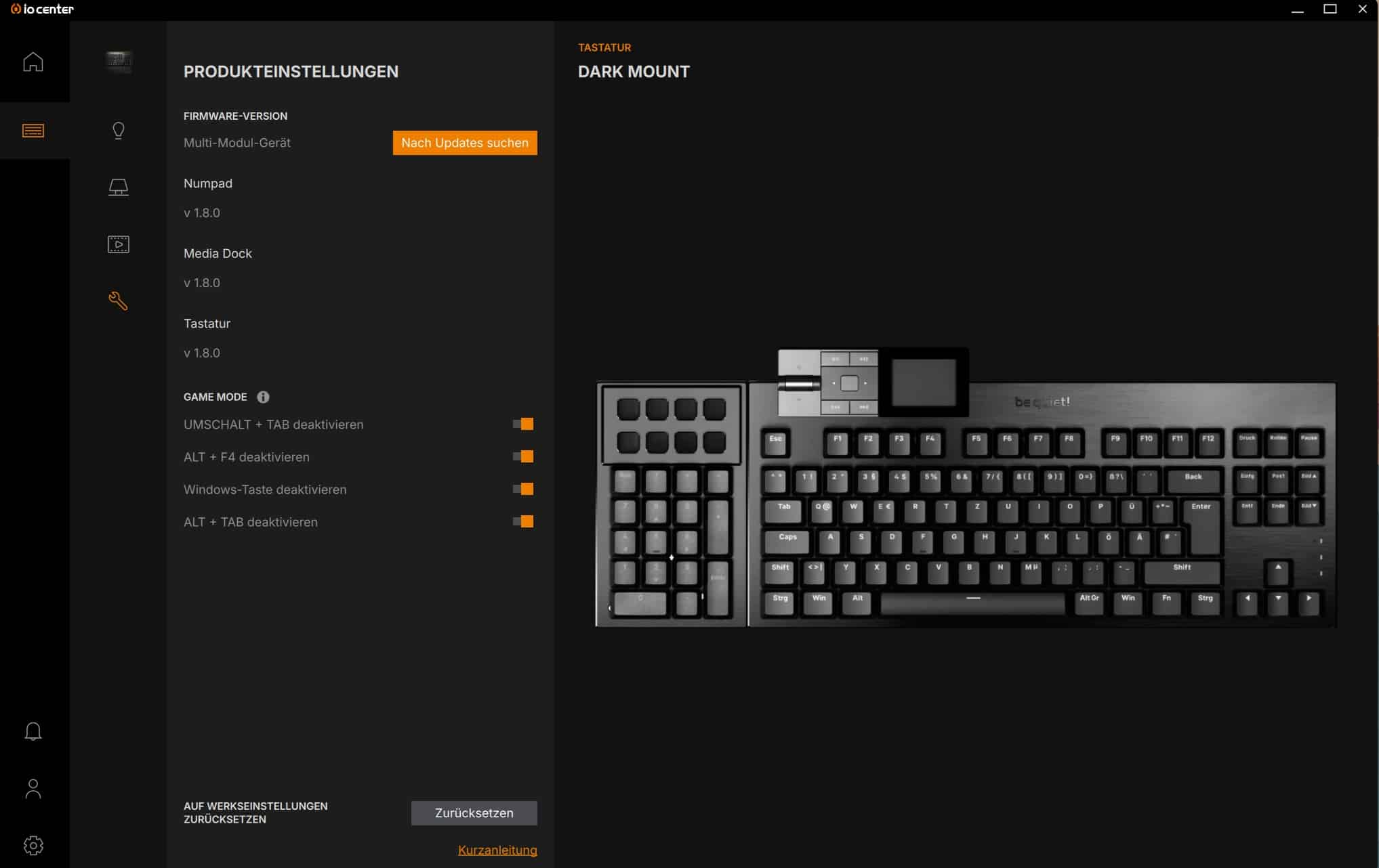 Für die ersten eigenen Peripheriegeräte wie die be quiet! Dark Mount hat der Hersteller eine brandneue Begleit-App geschaffen, die auf den Namen IO Center hört. Die Besonderheit: Wer keinen Bock hat, sich die Software herunterzuladen, kann über IO Center | Web auch sämtliche Einstellungen über die Website vornehmen.