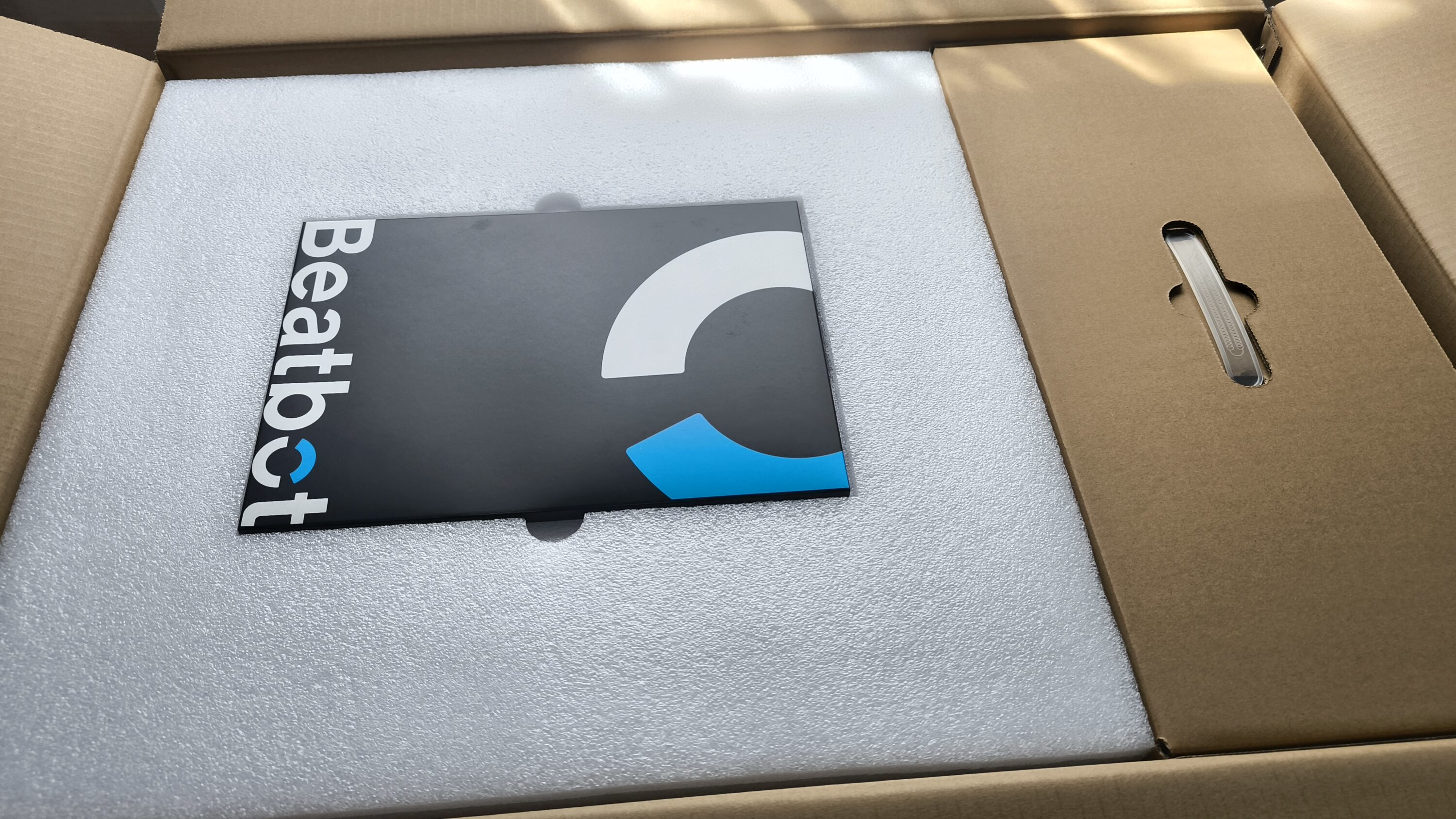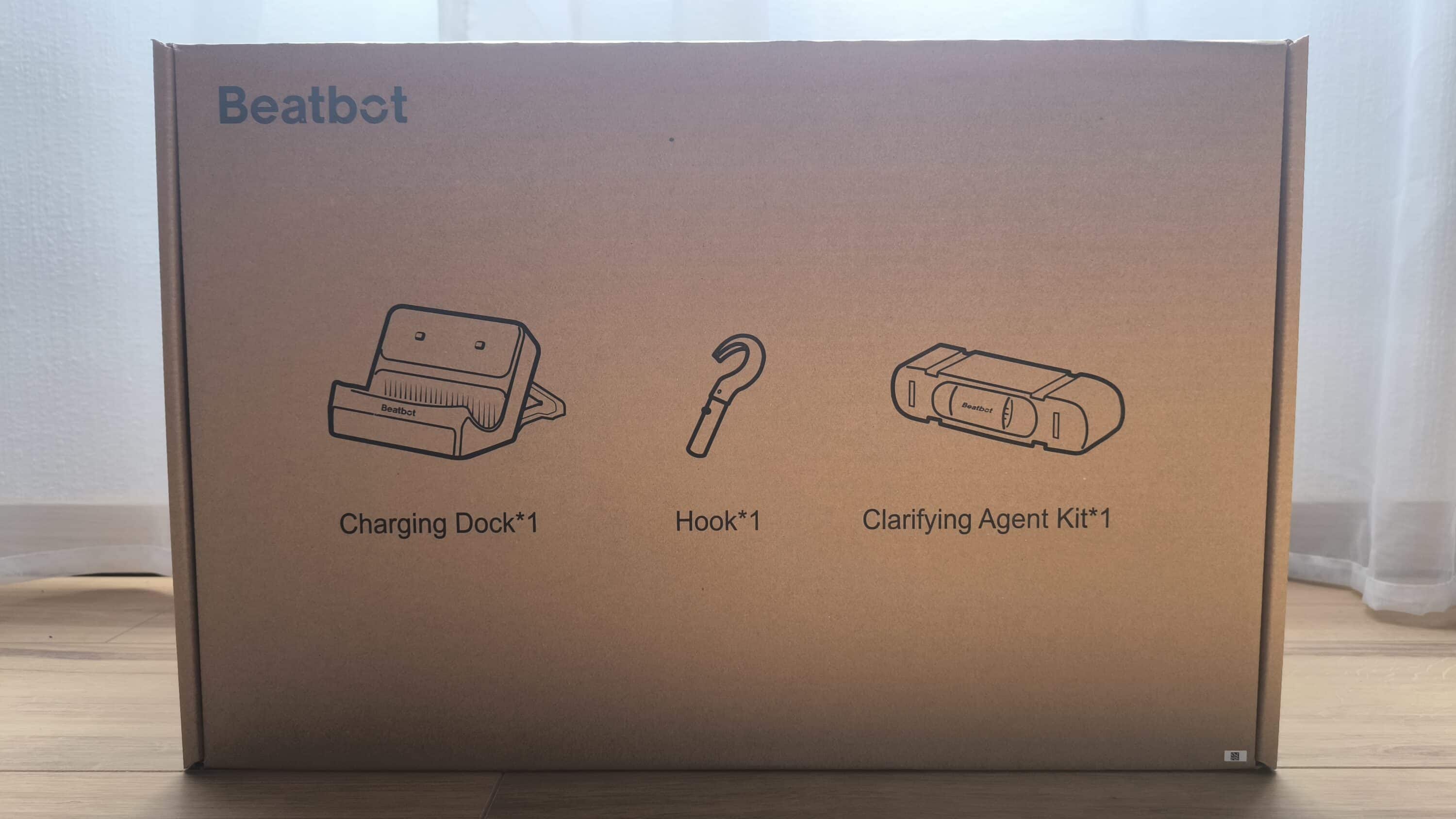 Der Lieferumfang des Beatbot AquaSense 2 Pro ist in zwei Pakete unterteilt. Im übergeordneten Karton befinden sich neben dem Poolroboter selbst auch ein Umschlag mit verschiedenen Unterlagen, darunter die Bedienungsanleitung. Beim erstmaligen Öffnen des Pakets fällt zugleich die Schnellstart-Anleitung ins Auge, die sich über die gesamte Fläche zieht. Das Zubehör ist im kleineren Karton versteckt und besteht aus einer Ladestation, einem Pool-Haken und einem Klärmittel-Set.