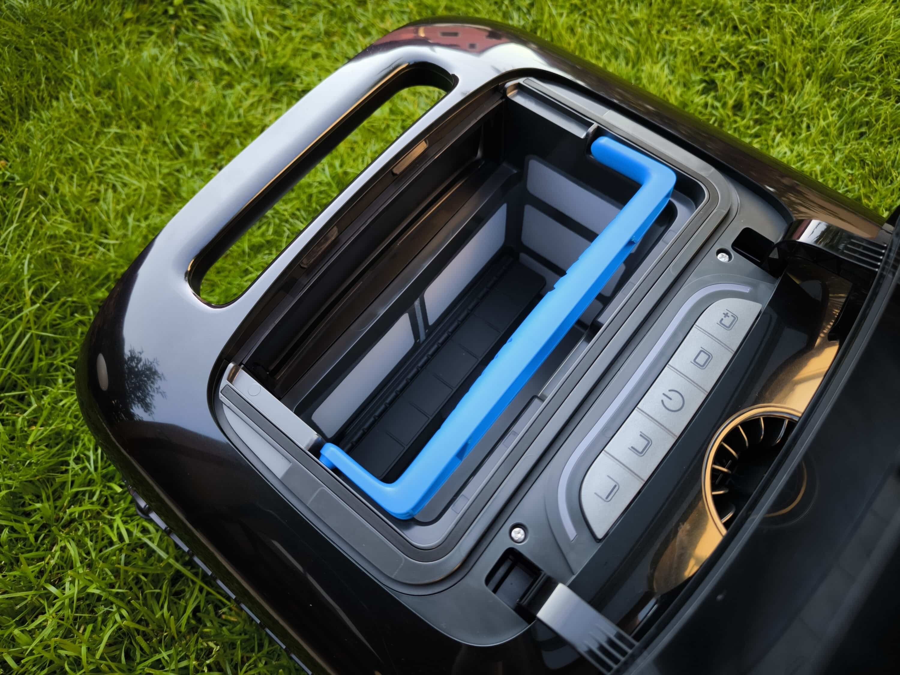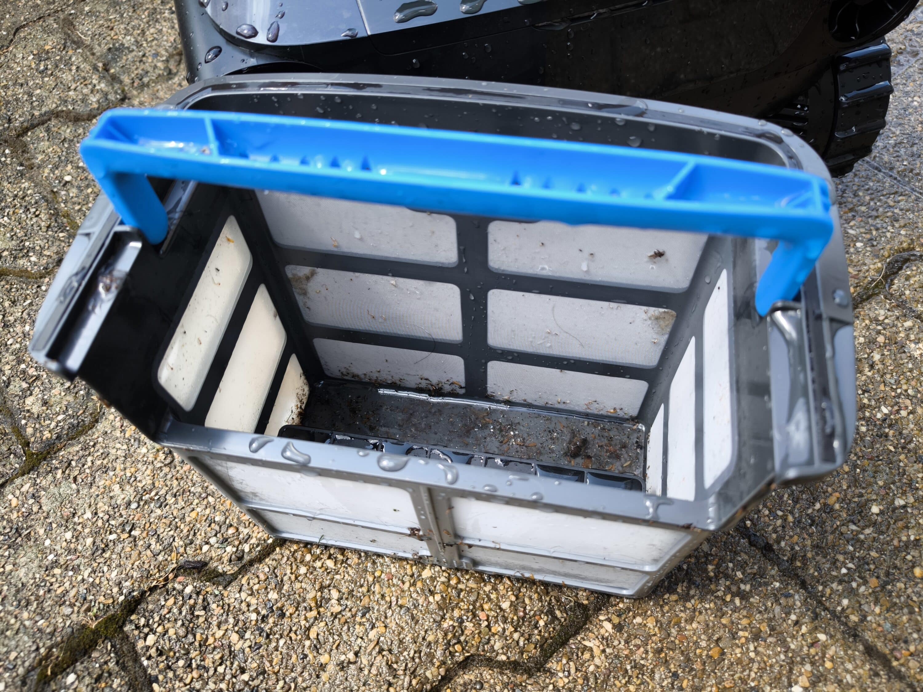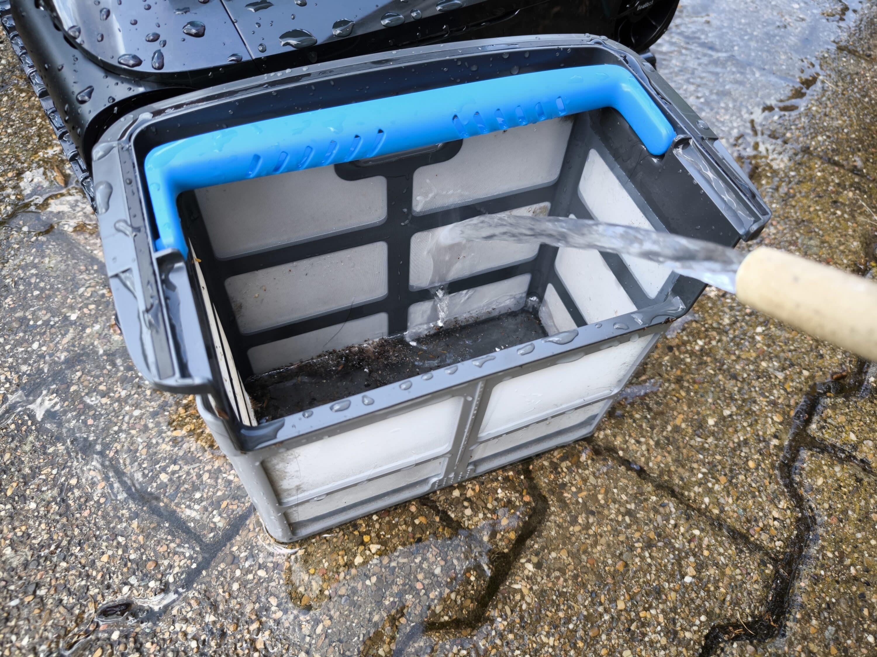 Wie funktioniert also die Reinigung des Poolroboters im Detail? Zunächst wird der Gehäusedeckel durch Drücken des Druckschalters geöffnet. Anschließend lässt sich der Doppelkorb am blauen Griff bequem entnehmen und mit dem Gartenschlauch ausspülen – idealerweise von innen und außen. Zum Abschluss wird der Filter wieder eingesetzt, der Griff eingeklappt und der Deckel akkurat verschlossen. Das Prozedere ist also in wenigen Schritten erledigt und nimmt selbst bei größeren Verschmutzungen nur wenige Minuten in Anspruch.