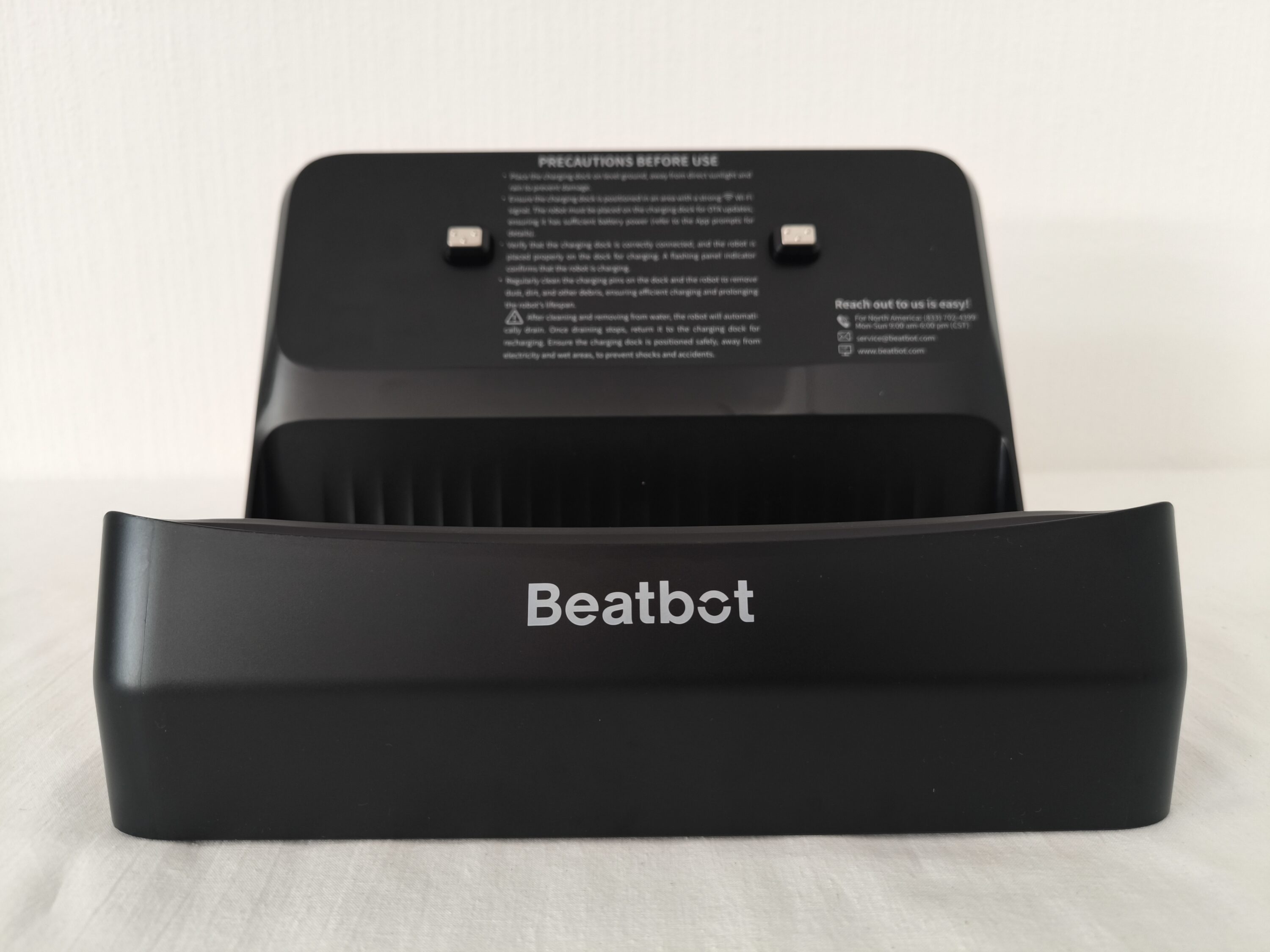 Wie eingangs erwähnt, wird der Beatbot AquaSense 2 Pro über eine Dockingstation aufgeladen. Dazu wird der Poolroboter schräg hochkant eingesetzt, woraufhin der Ladevorgang automatisch startet. Eine LED-Leiste neben den Bedienelementen gibt außerdem Auskunft über den aktuellen Akkuzustand. Falls der Poolroboter einmal komplett leer sein sollte, würde eine volle Aufladung etwa 4,5 Stunden in Anspruch nehmen.