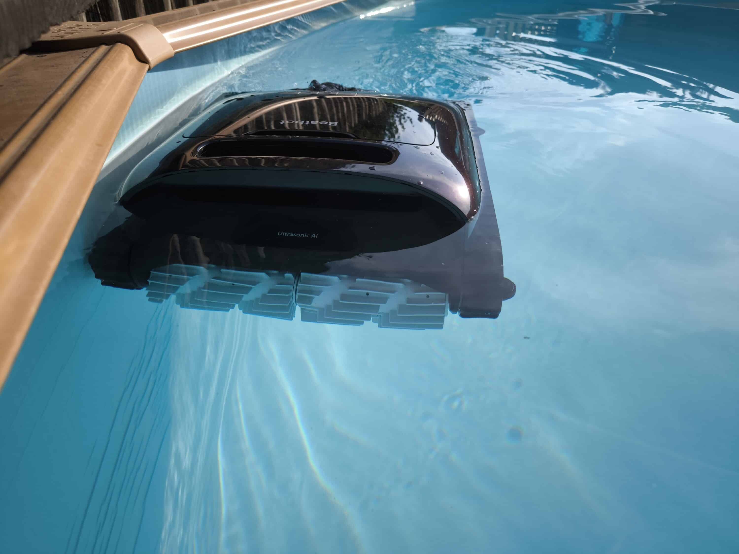 Nach der Reinigung ist vor der Reinigung, daher geht es nun mit etwas Steigung weiter. Im Wandreinigungsgang zeigt der Beatbot AquaSense 2 Pro, was in ihm steckt, und navigiert souverän nach dem N-Muster. Dadurch bleiben glatte, saubere Flächen an der Poolwand zurück, während sich der überwiegende Teil der Partikel bereits im Filterkorb des Poolroboters sammelt. Praktisch ist außerdem, dass die Wasserlinie doppelt angesteuert wird. Kurz gesagt fährt der AquaSense 2 Pro für eine zweite Reinigung erneut ins Wasser hinein, kommt dann wieder hoch und säubert die gleiche Stelle ein weiteres Mal.