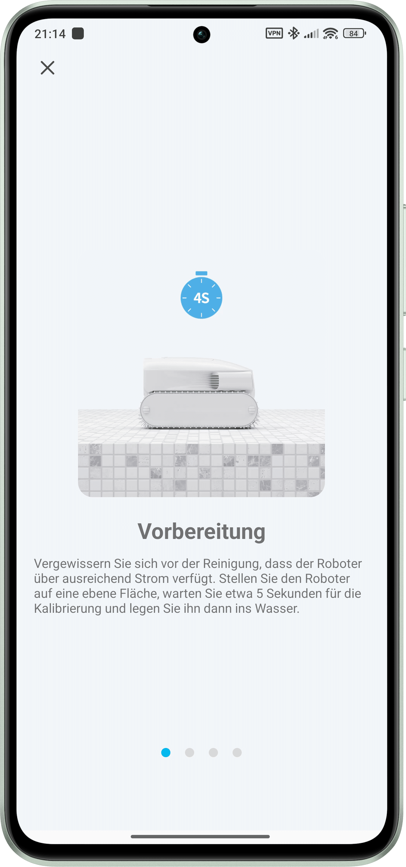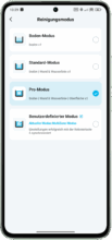 Kaum am Pool angekommen, wird zunächst der Reinigungsmodus ausgewählt. Je nach Auswahl von „Boden”, „Standard”, „Pro” oder „Benutzerdefiniert” unterscheidet sich der anschließende Reinigungsablauf. Auf Basis des Verschmutzungsgrads kann man also entscheiden, ob man die Wände mal auslassen möchte und stattdessen nur den Boden säubert. Optional lässt sich der Poolroboter außerdem als mobile Skimmer-Einheit auf der Wasseroberfläche betreiben. Für eine bessere Reinigung empfiehlt es sich zudem, den Beatbot AquaSense 2 Pro nach der Modus-Auswahl zur optimalen Kalibrierung etwa fünf Sekunden lang gerade stehen zu lassen. Anschließend wird der Klärmittelsatz eingelegt und der Poolroboter ist startklar für seine Säuberungstour.