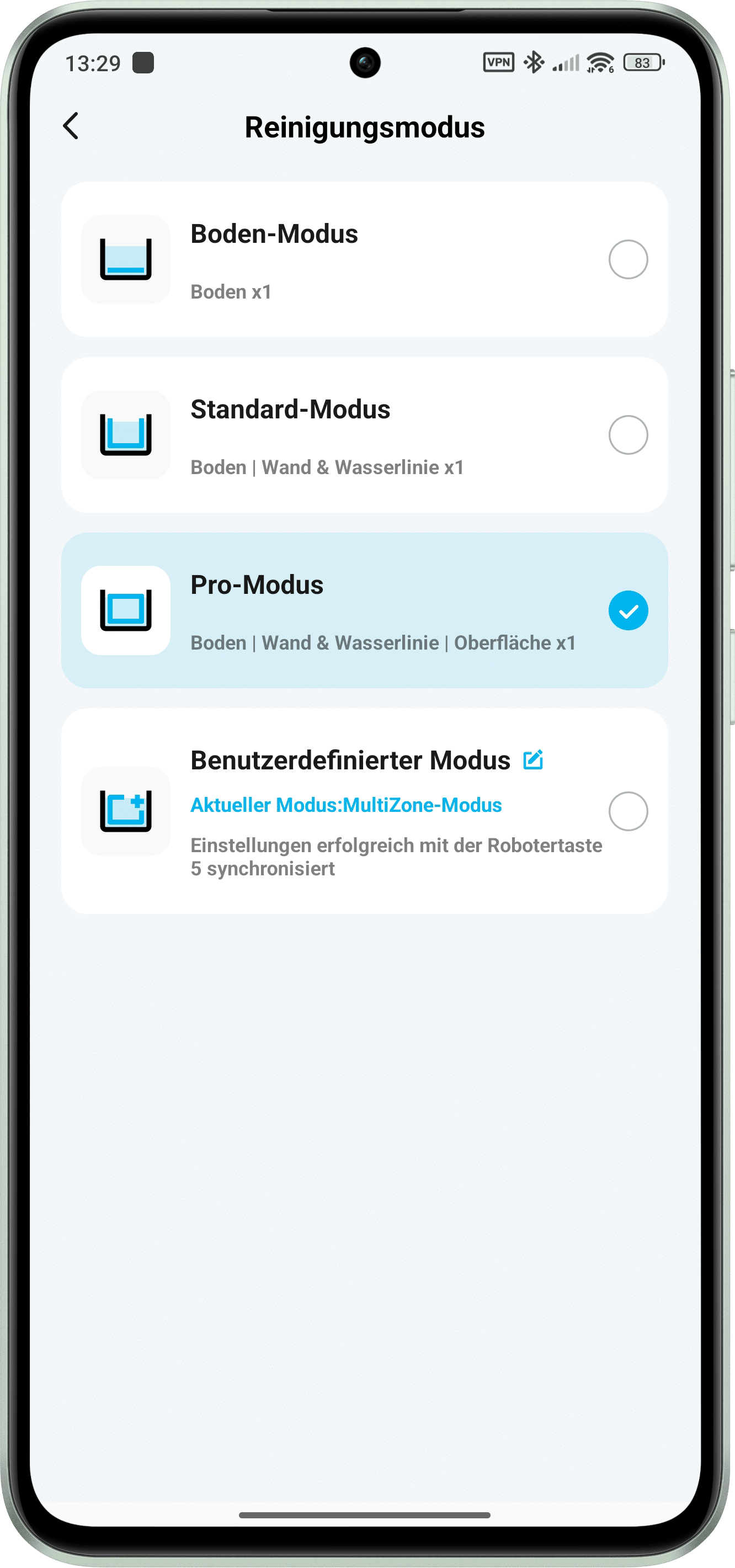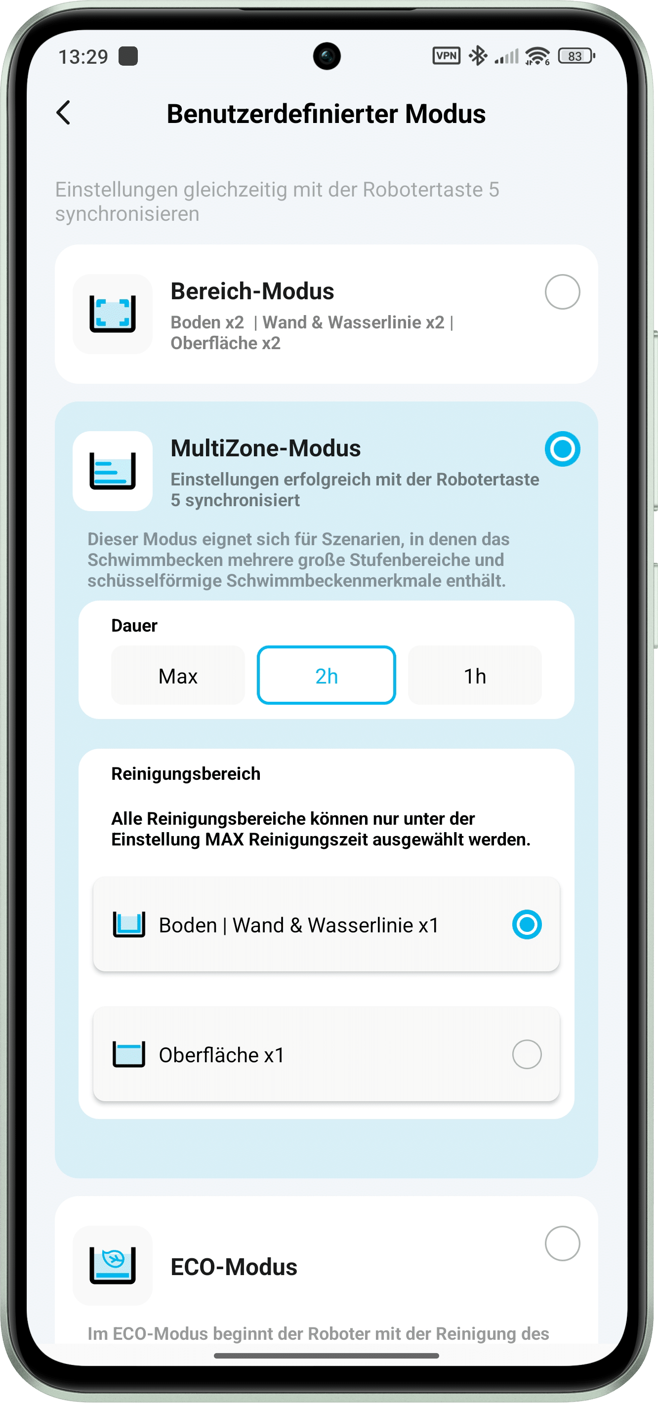 | Reinigende Flächen | Boden, Wand, Wasserlinie, Wasseroberfläche |