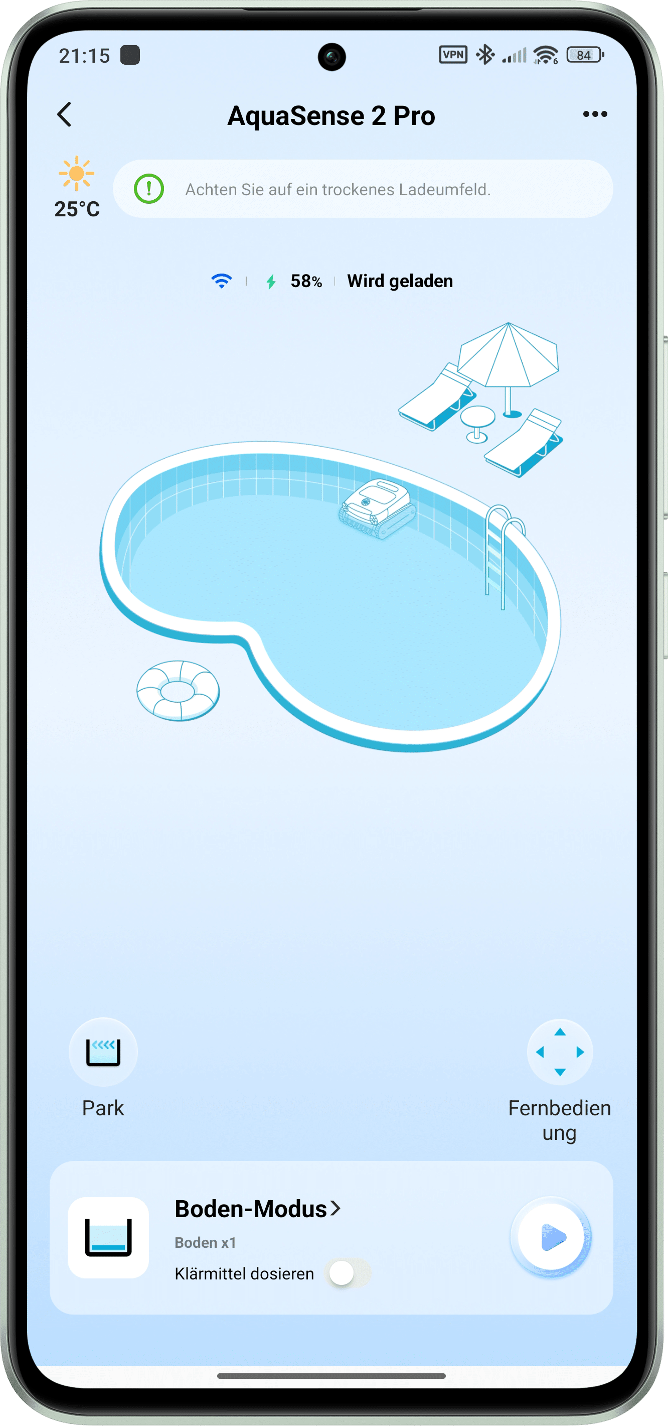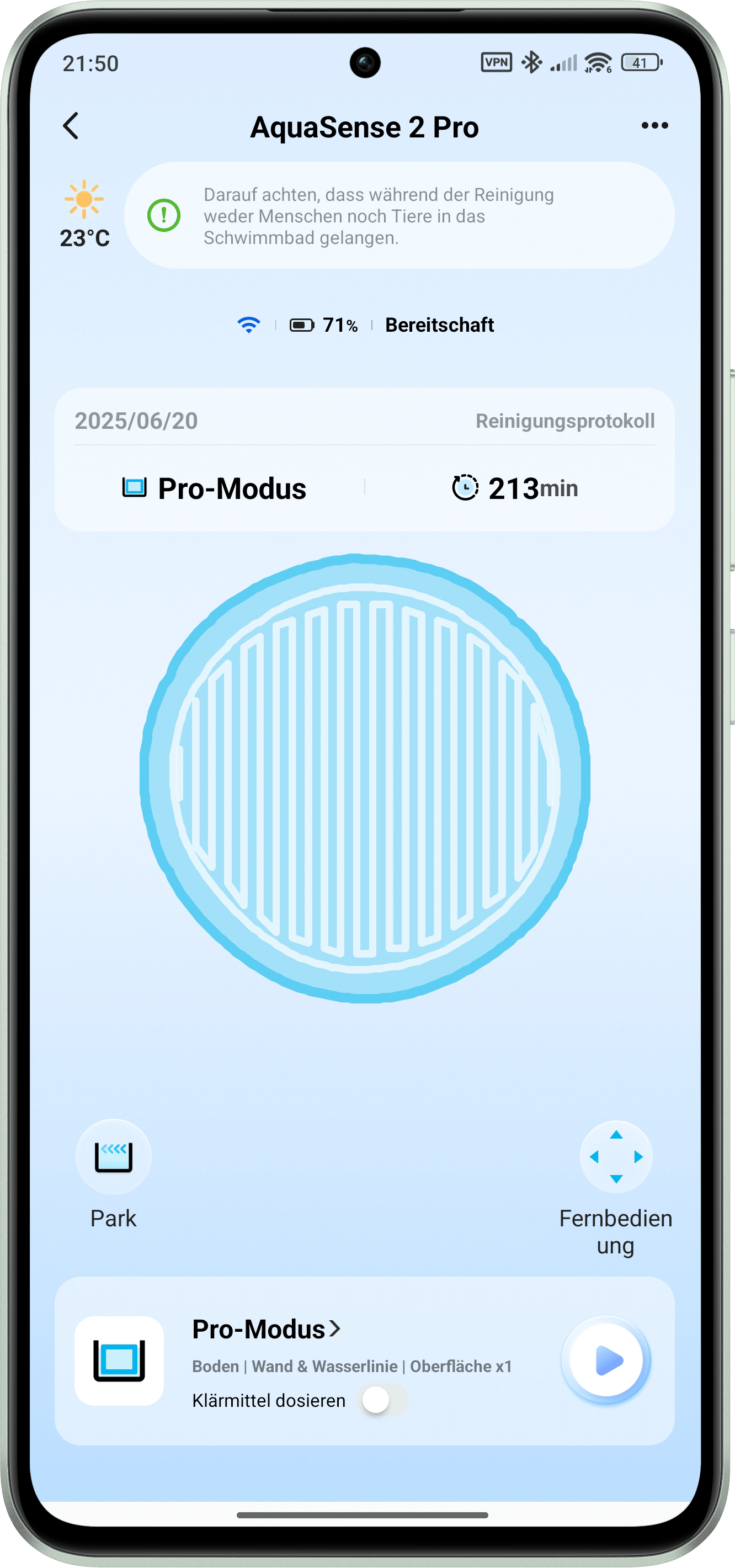 Nach der Kopplung wird der Beatbot AquaSense 2 Pro im Hauptmenü angezeigt. Anschließend folgt eine kurze Einführung zu den wichtigsten Funktionen des Poolroboters, bevor man selbst auf Erkundungstour gehen kann. Punkten kann der Poolroboter mit der Auswahl der Reinigungsmodi, welche simpel und übersichtlich gegliedert sind. Wer möchte, kann auch hier einen einen individuellen Modus nach den eigenen Bedürfnissen konfigurieren. Diese Anpassungen werden anschließend auf den rechten Taster des Poolroboters übertragen. Ein weiterer netter Aspekt ist, dass die App während des Reinigungsvorgangs die aktuelle Wassertemperatur anzeigt. Obendrein lässt sich der Beatbot AquaSense 2 Pro fernsteuern, sofern er sich im Skimmer-Modus an der Wasseroberfläche befindet. So hat man die Möglichkeit, den Poolroboter bei Bedarf per Joystick direkt zu bestimmten Schmutzpartikeln zu leiten. Spontan parken geht auch: Dazu gibt es einen separaten Taster in der App.