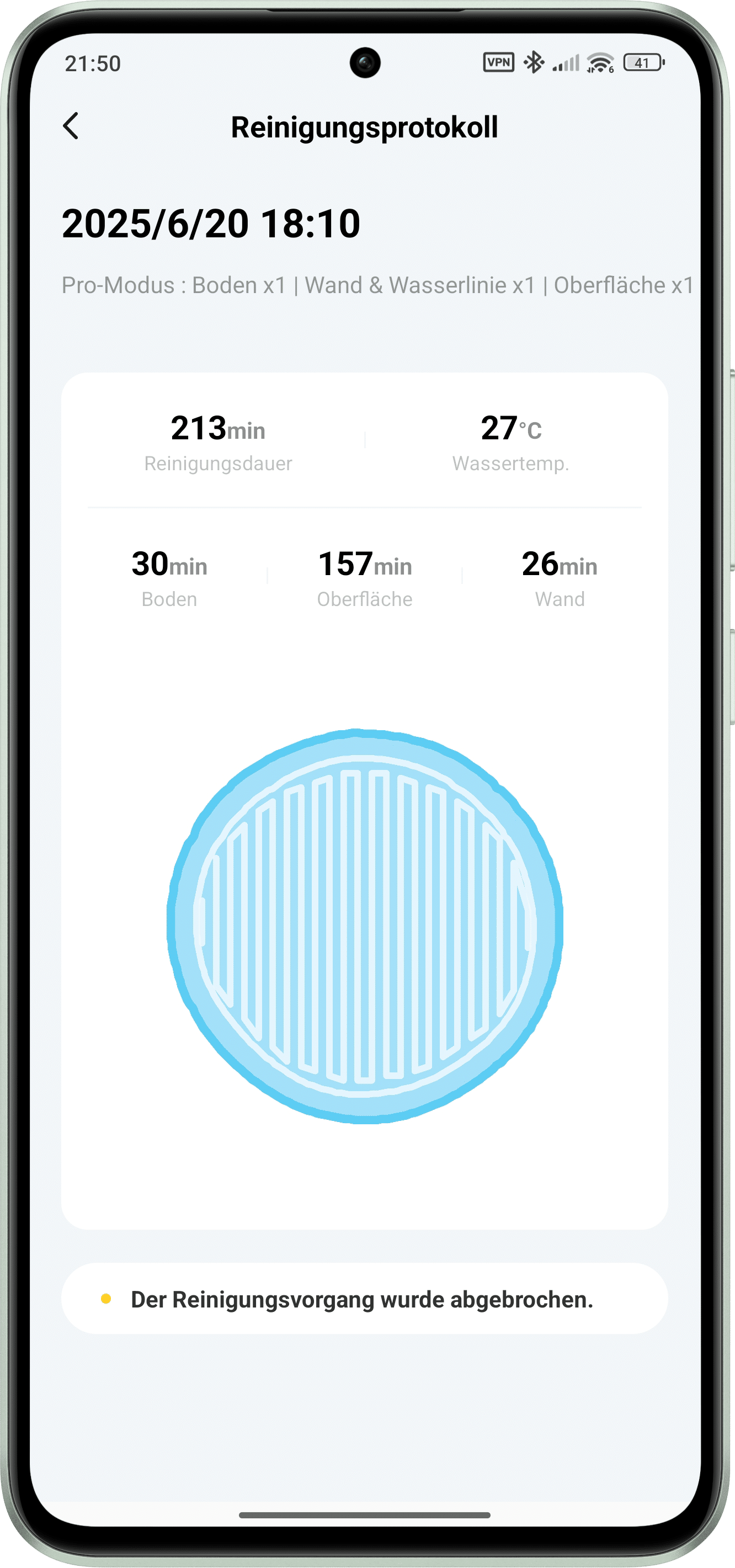 Mithilfe des Reinigungsprotokolls lassen sich außerdem alle vergangenen Säuberungsvorgänge detailliert auflisten, einschließlich der gefahrenen Routen. Auch während eines laufenden Reinigungsvorgangs erhält man über die App detaillierte Auskünfte in Echtzeit. Beendet der Roboter seine Arbeit, erfolgt beispielsweise direkt eine Push-Benachrichtigung aufs Smartphone. Allerdings gilt es zu beachten, dass solche Features nur über Wasser funktionieren, da die Funkverbindung beim Eintauchen für gewöhnlich zusammenbricht. Das bedeutet also auch, dass keine Echtzeit-Synchronisation zum Poolroboter unter Wasser besteht. Losgelöst davon besticht die App durch eine übersichtliche Benutzeroberfläche in Kombination mit zahlreichen sinnvollen Features. Einzig die nach wie vor etwas ungenauen Übersetzungen bieten Raum für Verbesserungen.