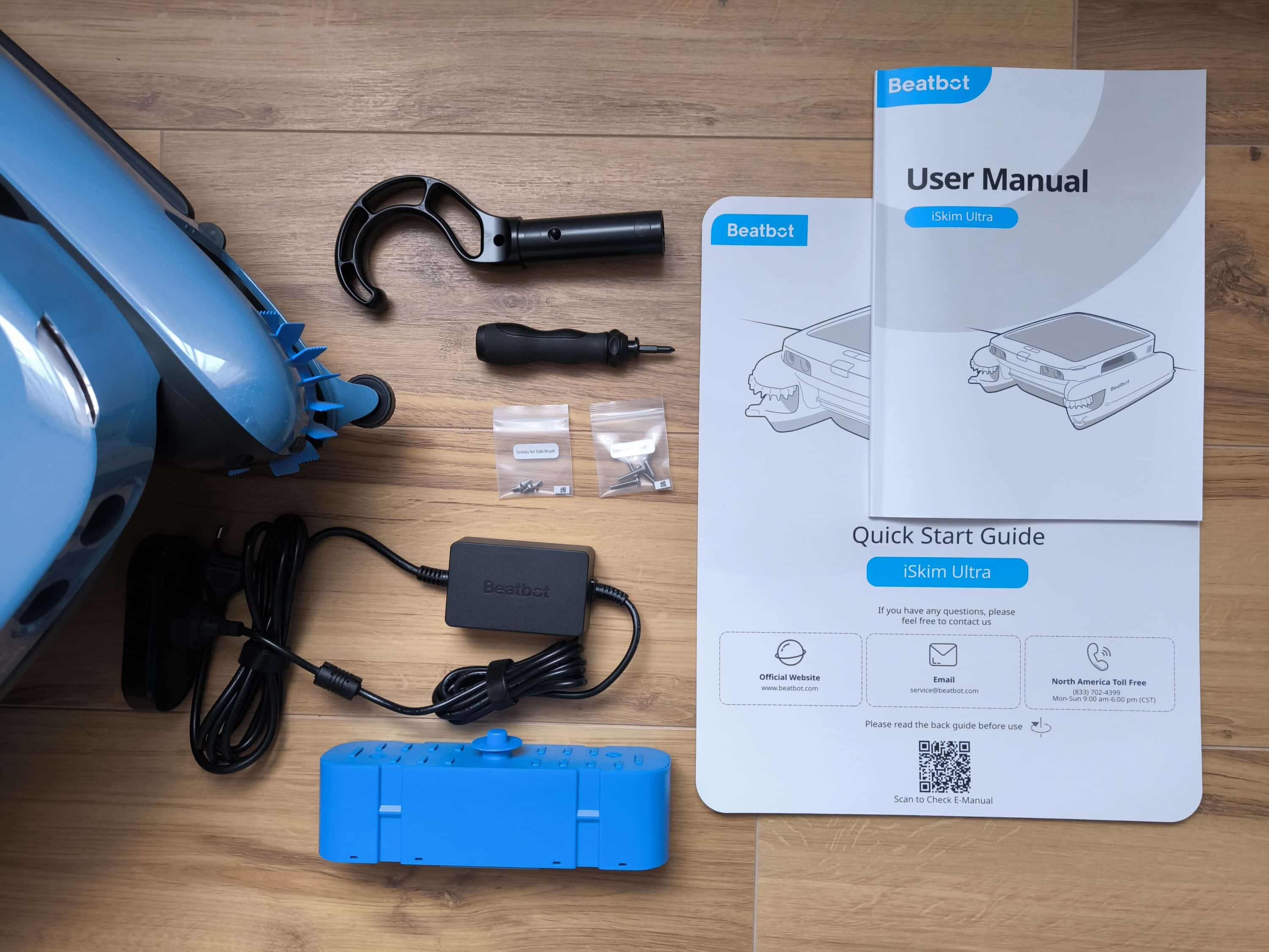 Neben dem Poolroboter Beatbot iSkim Ultra selbst, umfasst der Lieferumfang ein Kit mit Klärmittel sowie ein magnetisches Netzteil. Der Greifhaken zum bequemen Herausholen aus dem Becken ergänzt die Ausstattung. Abgerundet wird das Paket mit dem Zubehör, bestehend aus einem Schraubendreher, Schraubensatz und der Schnellstart-Anleitung bzw. dem Benutzerhandbuch.