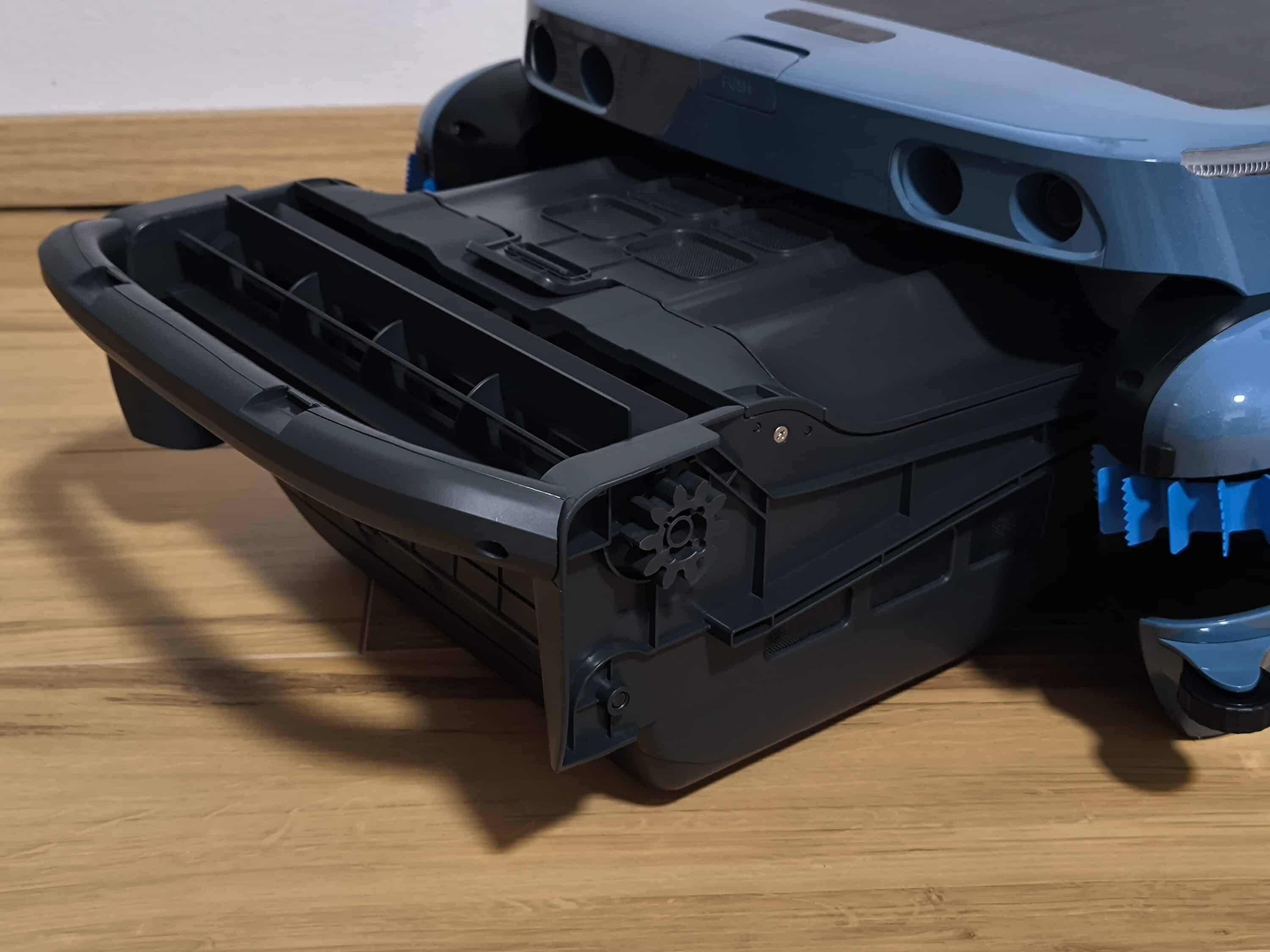 Um dem Problem des potentiellen Verhedderns entgegenzuwirken, sind am Gehäuseboden vier optional ausziehbare Schutzvorrichtungen montiert. Weitere Dämpferstreifen im Seitenbereich des Beatbot iSkim Ultra absorbieren versehentliche Stöße mit dem Beckenrand. Ein wesentlicher Bestandteil des Poolroboters ist zudem der Filterkorb mit einem Fassungsvermögen von 9 Litern. Dieser ist ebenfalls mit einem Tragegriff ausgestattet, an dem der Poolroboter gleichzeitig angehoben werden kann.