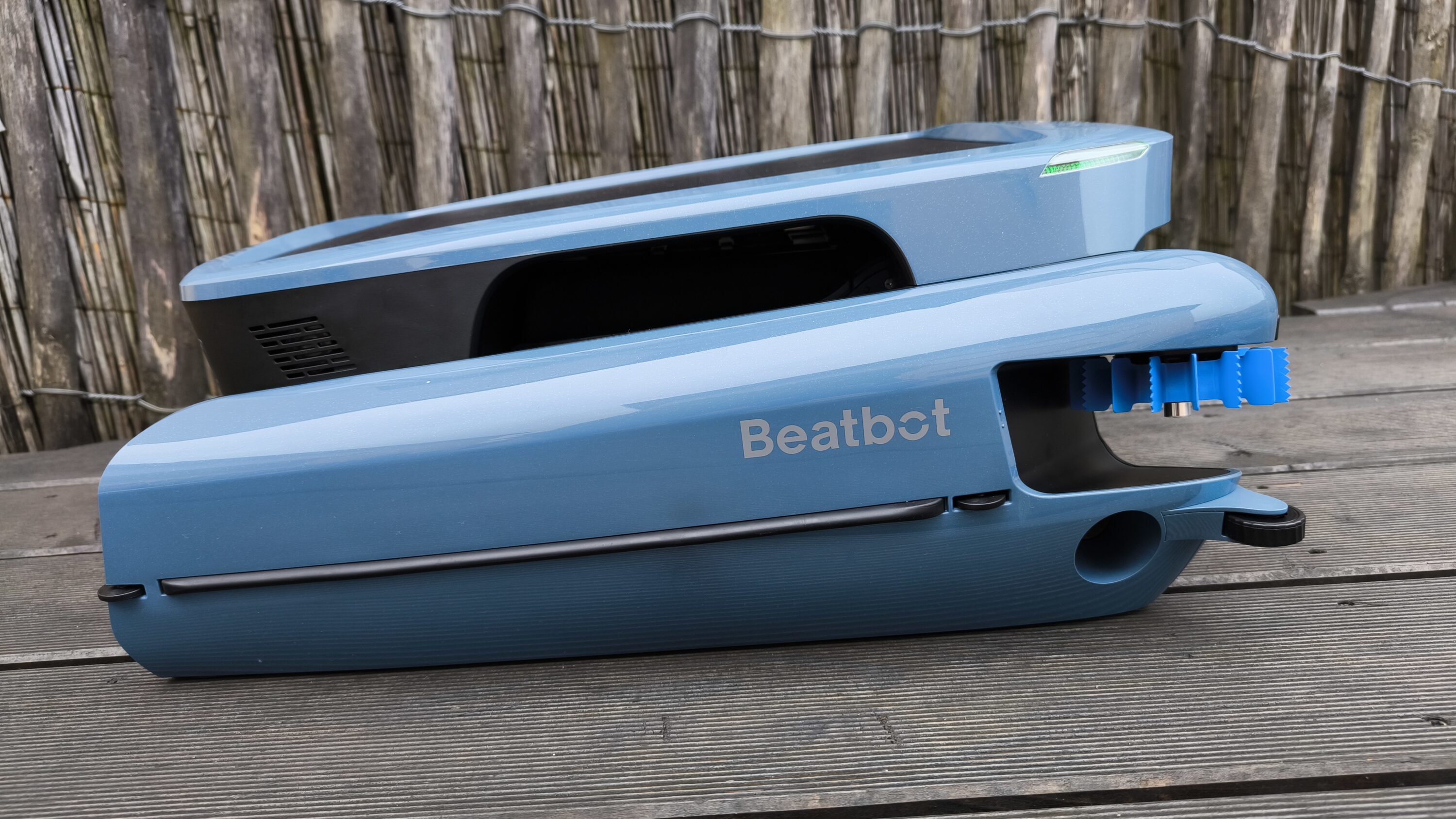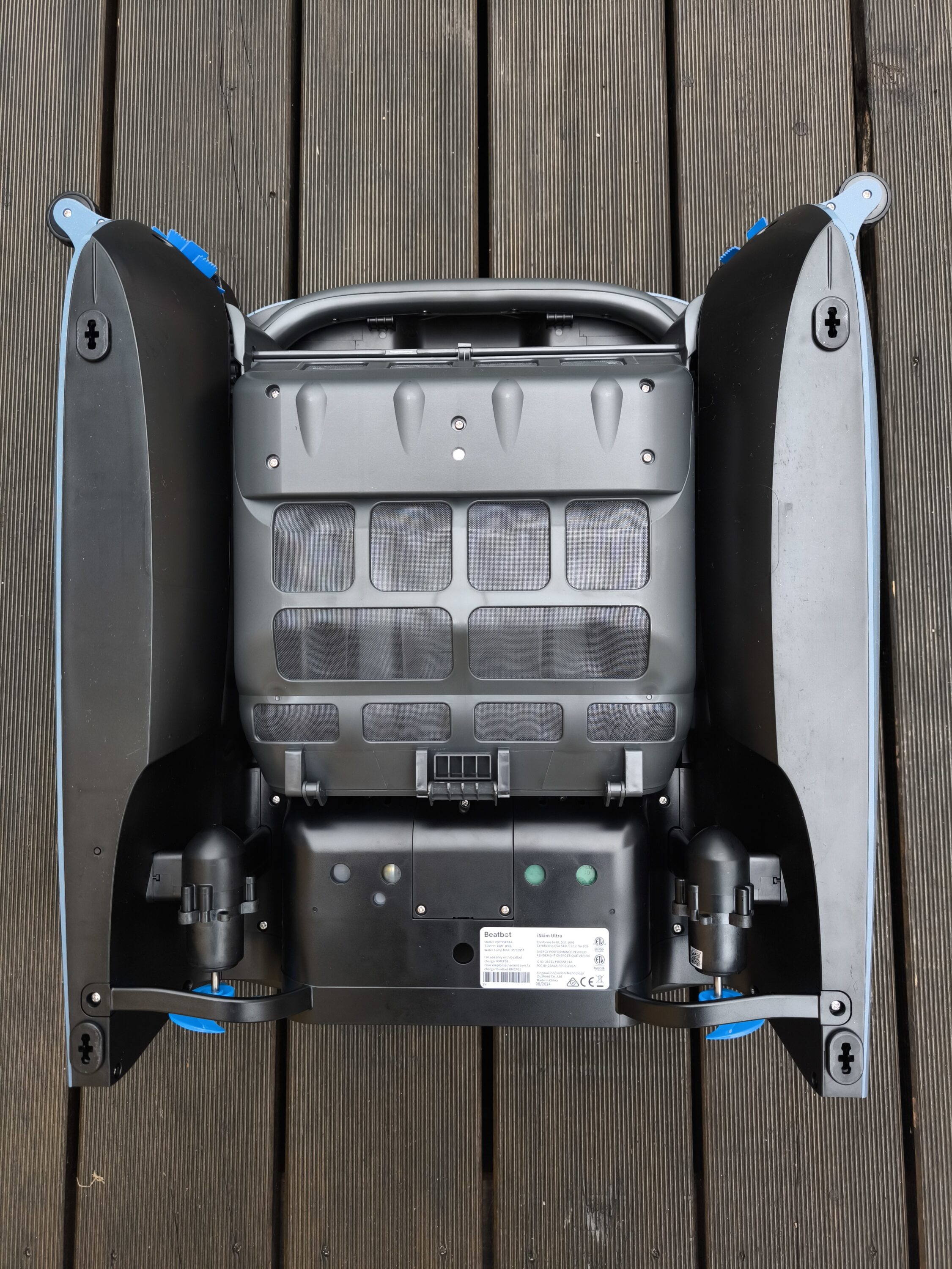 Der Beatbot iSkim Ultra ähnelt mit seinen zwei Rümpfen optisch einem Katamaran. Als Tragdeck dient das großflächige Solarpanel, welches den Poolroboter während des Reinigungsvorgangs stetig wieder auflädt. An der Vorderseite befinden sich vier Ultraschallsensoren, die das Umfeld erfassen und optisch an menschliche Augen erinnern. Während sich unter der Haube eine Menge Technik versteckt, setzt Beatbot in Sachen Bedienbarkeit auf nur zwei Schaltflächen im Kopfbereich. Daneben befinden sich auf beiden Flanken die Seitenbürsten und je ein Vorderrad. Dreht man den Roboter um 180 °, kommen die beiden blauen Propeller zum Vorschein, die zur Fortbewegung dienen.