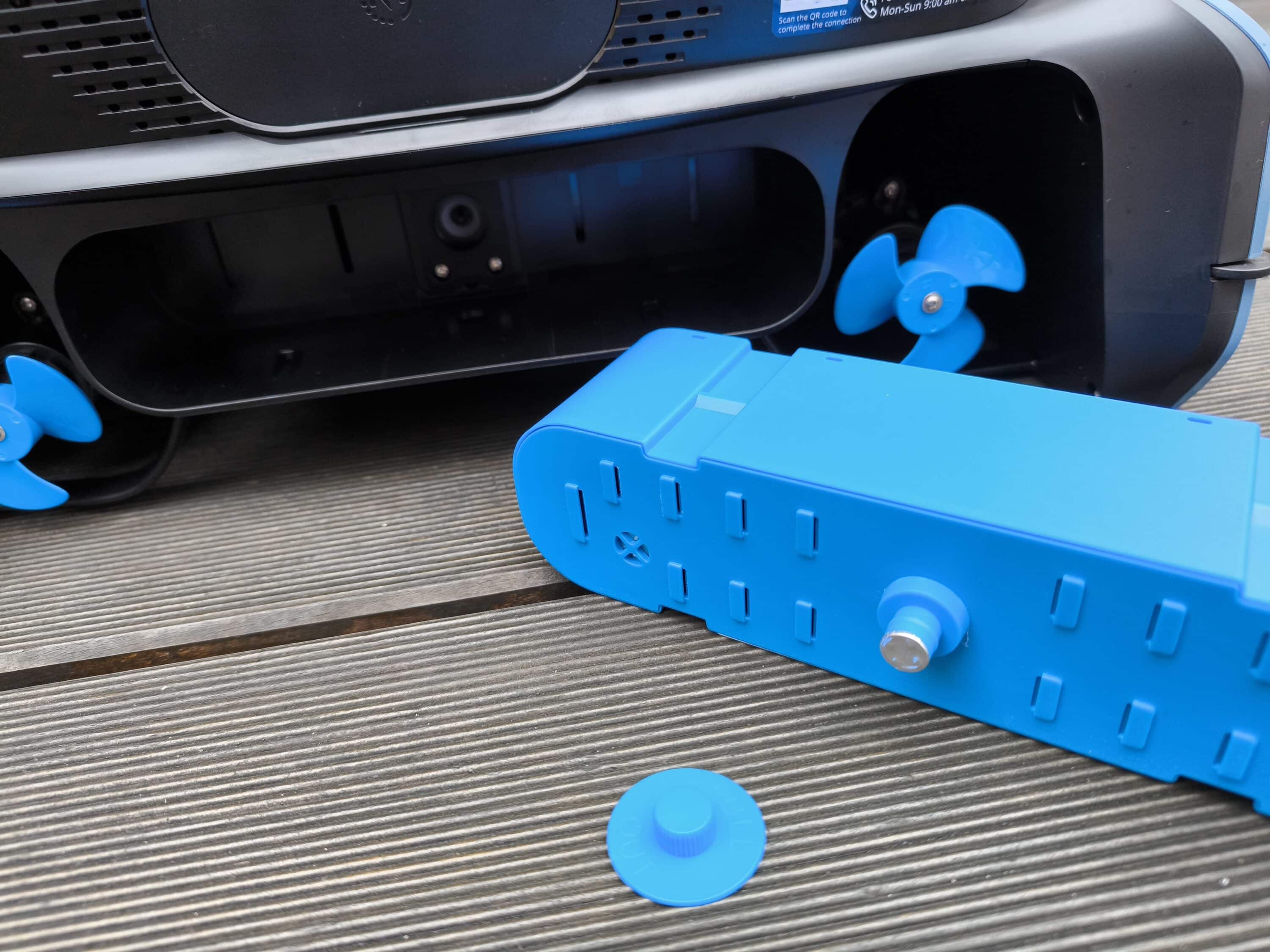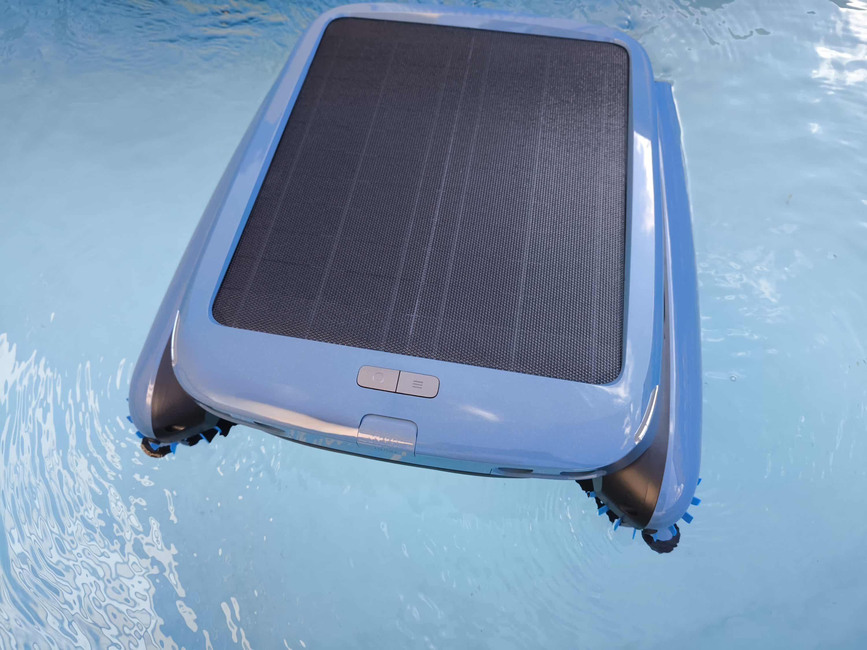 Darüber hinaus verfügt der Beatbot iSkim Ultra über ein eigenes Klärsystem, das vom Hersteller ClearWater™ genannt wird. Vereinfacht gesagt handelt es sich dabei um eine Klärlösung, die sich im blauen Behälter befindet. Im Einsatz sorgt dies für eine bessere Entfernung von Öl- oder Metallrückständen und soll Schaumbildung oder Verfärbungen des Wassers verhindern. Ein Kit reicht bis zu einem Monat und muss daher während einer Saison regelmäßig ersetzt werden. Geladen wird, wie bereits erwähnt, automatisch über ein Solarmodul mit 24 Watt während der Reinigung oder auch über das Magnetladegerät, ebenfalls mit 24 Watt. Speziell das Solarmodul soll dabei eine sehr gute Leistungsaufnahme bieten, wodurch der 10.000 mAh Akku auch bei wenig Tageslicht oder bewölktem Wetter geladen wird.
