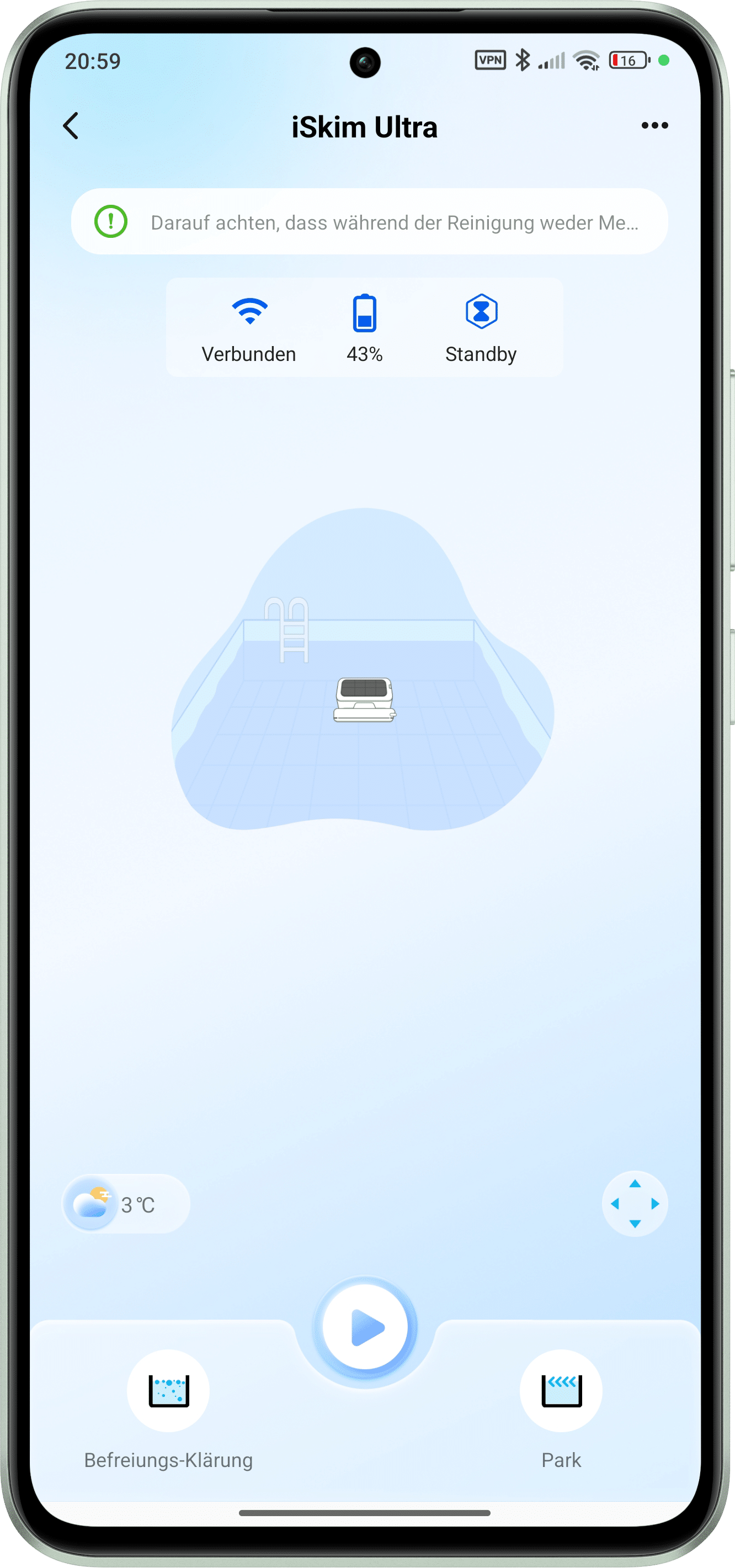 Nach der Einrichtung hat man Zugriff auf den Poolroboter und kann ihn von dort aus steuern. Neben dem Start bzw. Stopp des Reinigungsvorgangs per Knopfdruck und dem Zuschalten von Klärmittel lässt sich der Beatbot iSkim Ultra auch bequem an den Beckenrand fahren und dort parken. Wer möchte, kann sogar selbst Hand anlegen und den Beatbot iSkim Ultra über ein Steuerpad manövrieren. Die manuelle Lenkung funktioniert im Test dabei recht gut und ist einen Tick direkter als beim Aiper Surfer S1 (unser Test). Ergänzt wird der Funktionsumfang durch die üblichen Features, wie man sie bereits von einem Reinigungsroboter kennt. Neben der Ansicht der Reinigungshistorie, dem Planen einzelner Aufgaben oder auch dem zeitgesteuerten Unterbrechen des Reinigungsprozesses ist das Übliche vorhanden. Nettes Feature: In der App wird während der Reinigung live die Wassertemperatur angezeigt.