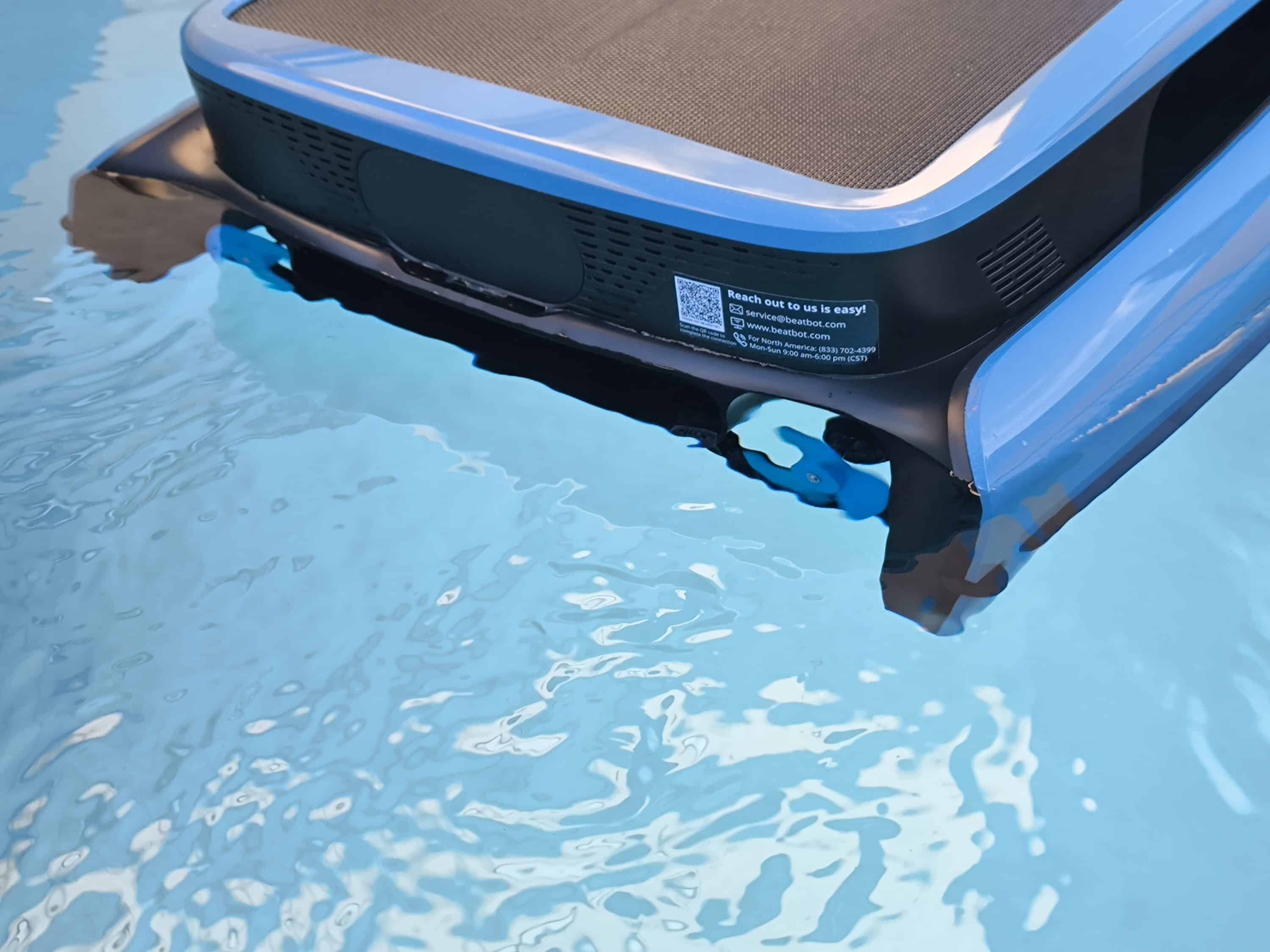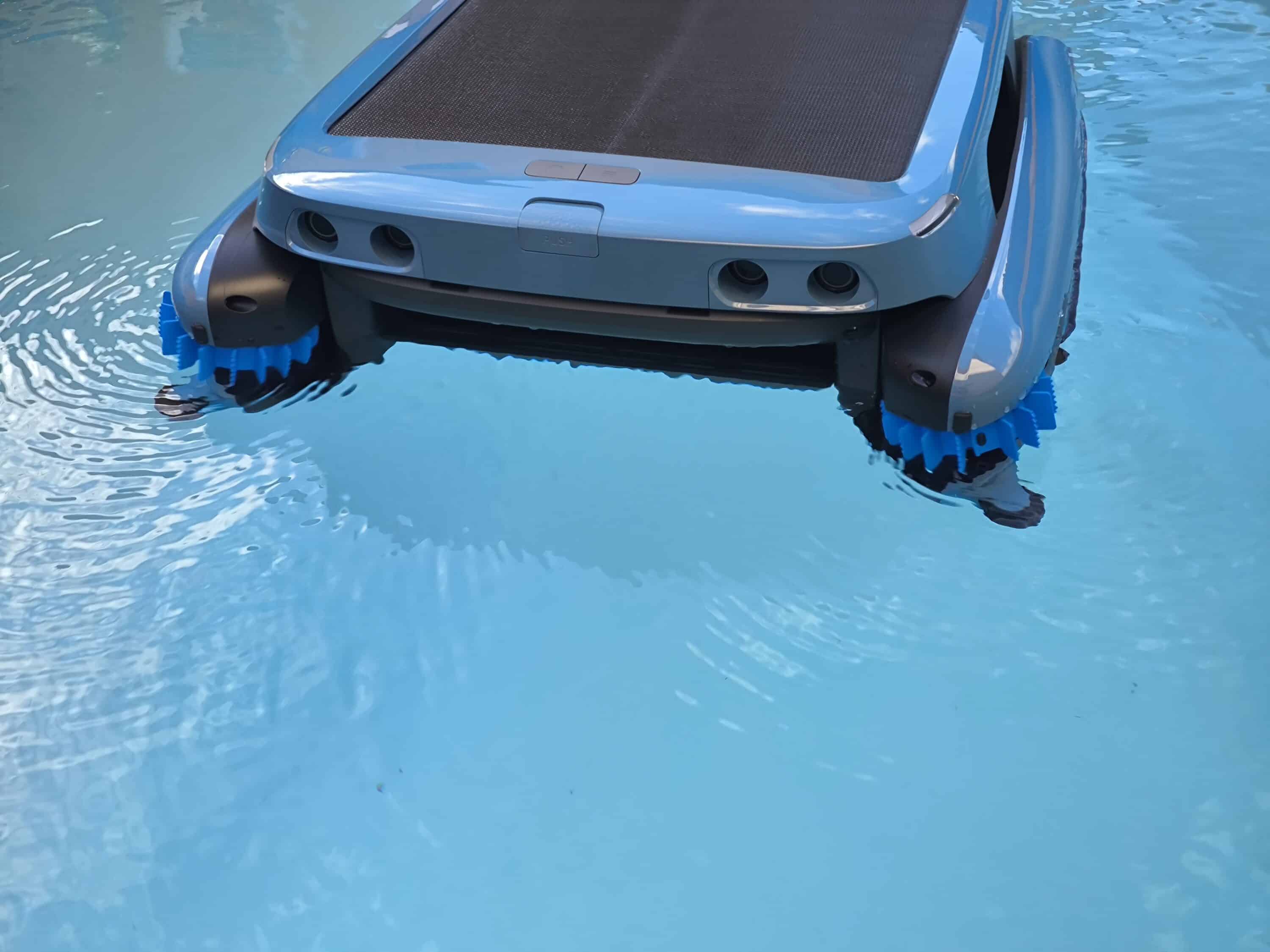 Kaum ins Wasser gesetzt, beginnt der Beatbot iSkim Ultra automatisch mit der Reinigung. Zielstrebig und souverän fährt der Poolroboter S-förmig im runden Pool herum und bremst kurz vor dem Beckenrand wieder ab bzw. wendet selbständig. Verglichen mit dem AIPER Surfer S1 ist vor allem die Geräuschentwicklung hervorzuheben. Selbst mit der sehr dicken Frontbürste und auch den Doppelseitenbürsten bewegt er sich deutlich ruhiger auf der Wasseroberfläche.