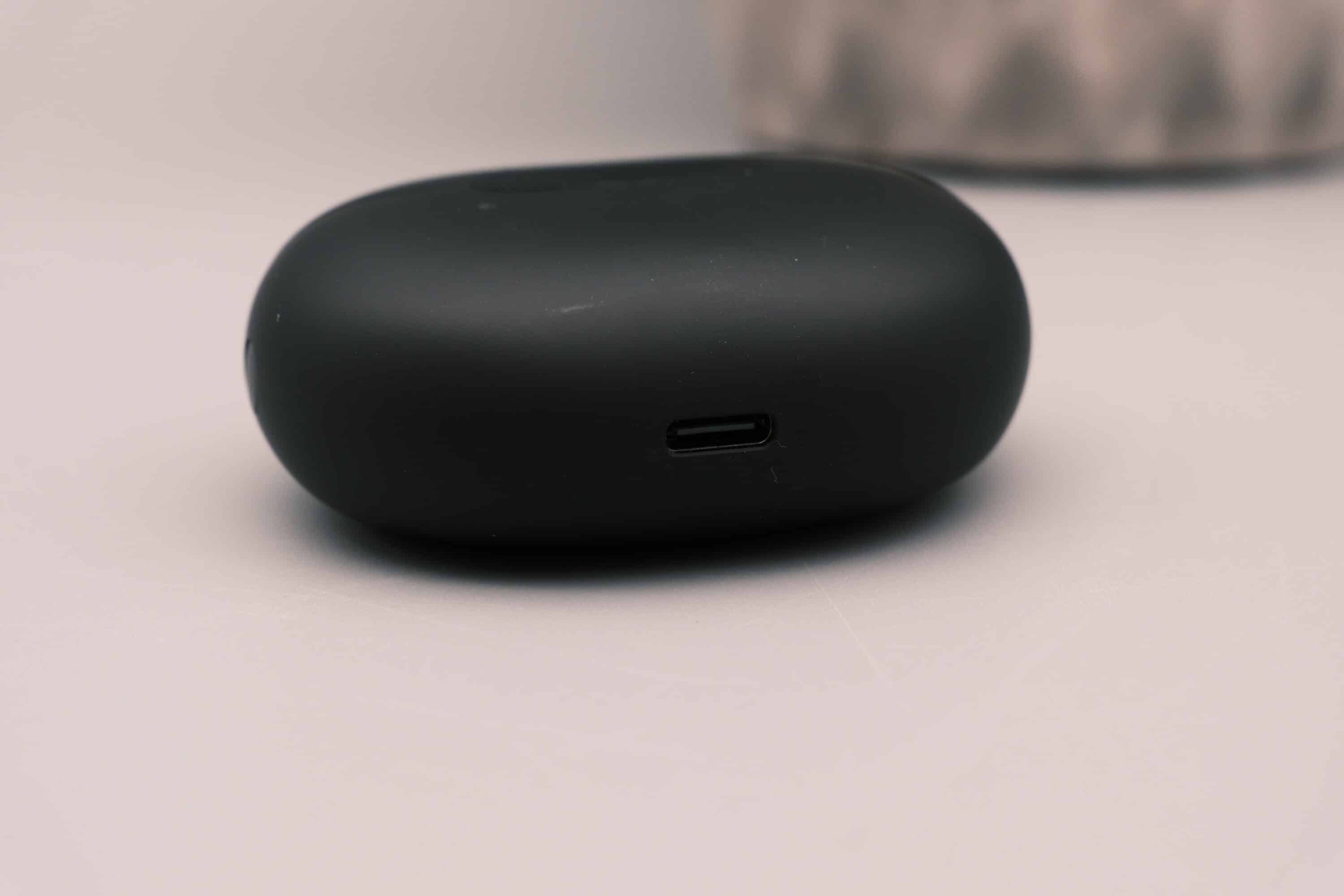 Das ovale Ladecase kommt auf Maße von 43 mm x 25,8 mm x 48,35 mm und ist damit angenehm handlich. Auch das Gewicht fällt mir rund 42 Gramm eher niedrig aus. Leider verbaut beyerdynamic den USB-C-Ladeport an der Unterseite, sodass ein aufrechtes Hinstellen auf Oberflächen nicht möglich ist.