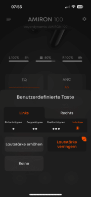 Bedient werden die beyerdynamic Amiron 100 über die berührungsempfindlichen Außenseiten, die durch die abgeflachte Oberfläche sehr komfortabel zu ertasten sind. Die Bedienung arbeitet dabei sehr schnell und präzise, was Fehleingaben nahezu ausschließt. Auch das Bedienkonzept wirkt gut durchdacht und lässt sich innerhalb der beyerdynamic-App zudem individualisieren.