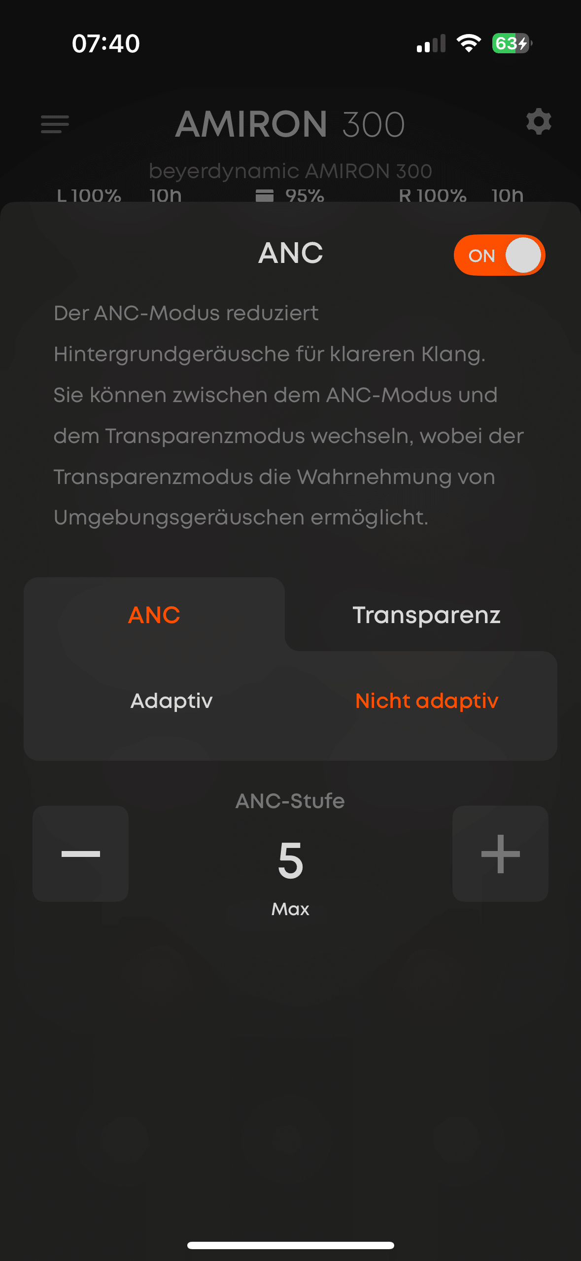 Hier habt ihr in der Begleit-App die Wahl, zwischen einer adaptiven ANC zu wählen, wobei dann die Intensität automatisch an die Umgebungsgeräusche angepasst wird, oder die Geräuschunterdrückung in fünf Stufen selbst zu regulieren.