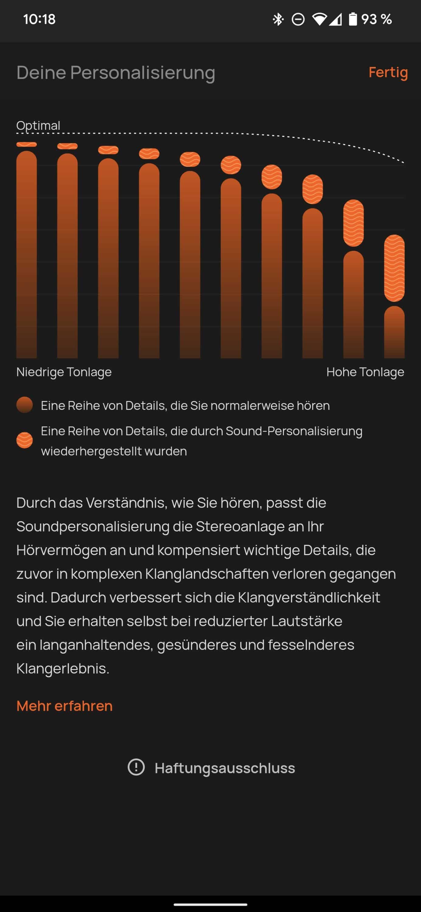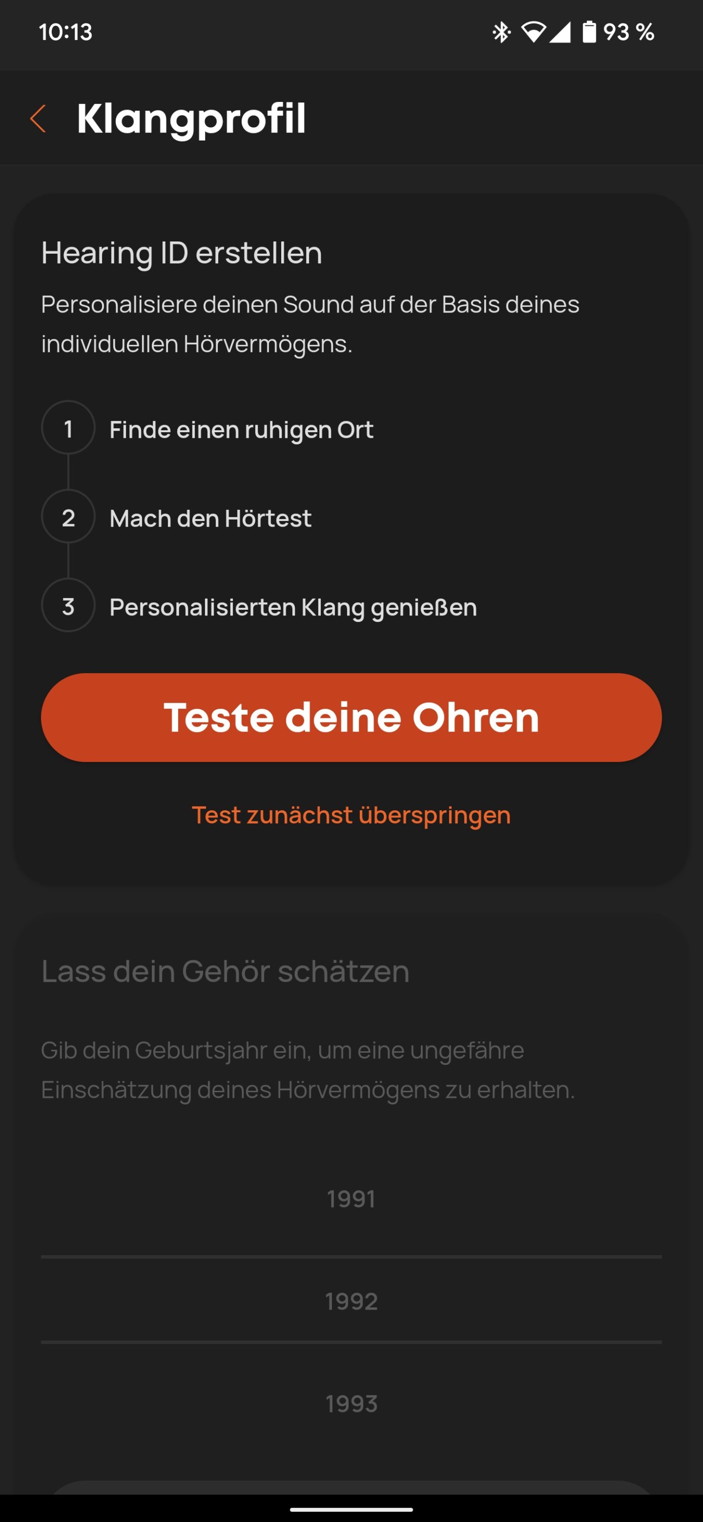 Hierzu gilt es, im Verlauf mehrerer Frequenzen, einen Piepton aus dem Zirpen von Grillen herauszuhören und auf dem Smartphone zu bestätigen, wann und wie lange du das Piepen hörst. Das Ergebnis ist ein, ganz speziell auf deine Ohren, abgestimmter Klang.