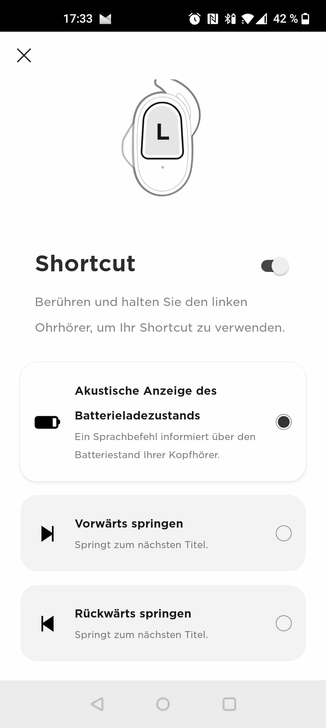 Mit einer doppelten Berührung auf dem rechten Ohrhörer lässt sich die Wiedergabe starten und pausieren, außerdem können so eingehende Anrufe angenommen werden. Dieselbe Geste bewirkt auf der linken Seite eine Änderung des ANC-Levels, für das werksseitig Optionen für 100 %, 50 % und 0 % eingestellt sind. Diese Optionen können allerdings mithilfe der App frei angepasst und abgespeichert werden. Per Tippen und Halten wird rechtsseitig der entsprechende Sprachassistent aktiviert, während auf der linken Seite mit derselben Geste ein individuell konfigurierbarer Shortcut festgelegt werden kann.