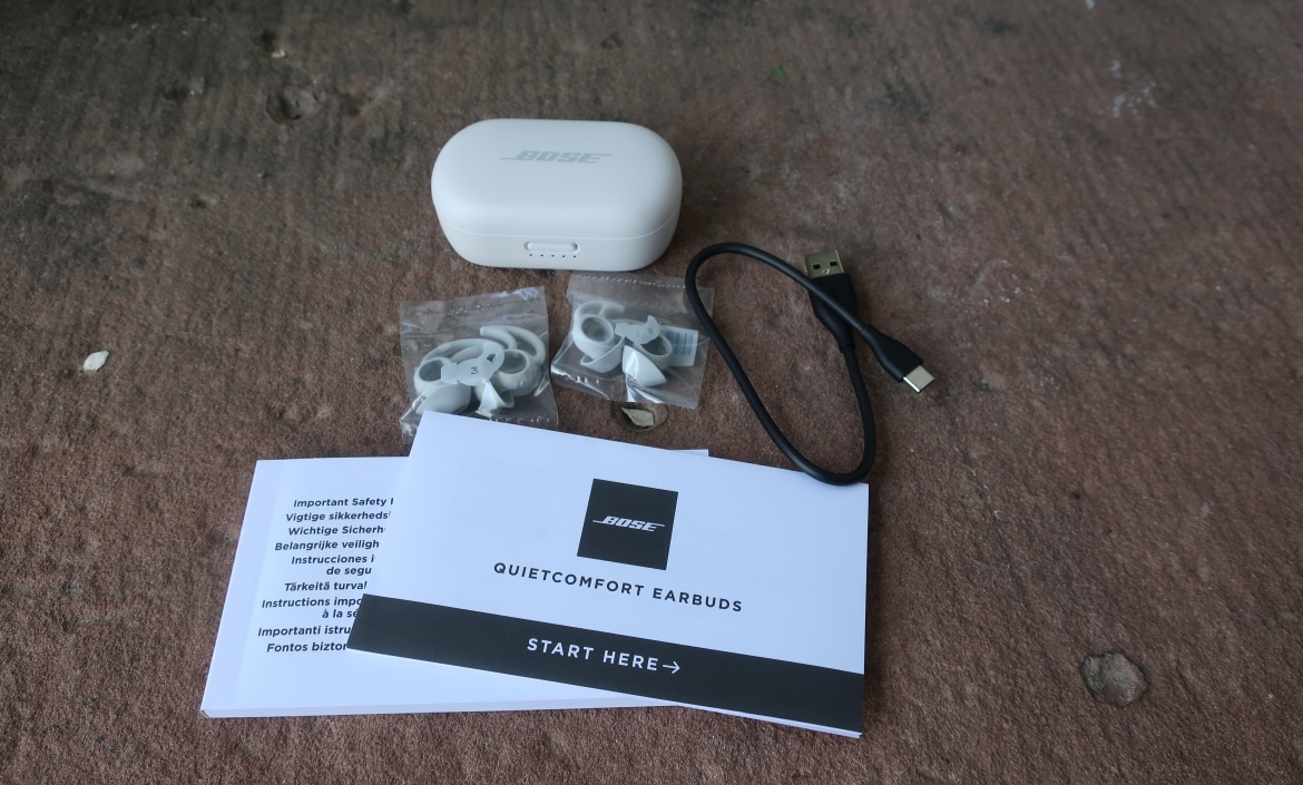 Bose legt dem Paket zwei zusätzliche Paare der patentierten StayHear-Ohreinsätze mit Flügeln bei. Die Größe M ist bereits vorinstalliert, S und L befinden sich in einer kleinen Plastiktüte verpackt ebenfalls im Karton, während ein 30,5 cm langes USB-Typ-A- auf USB-Typ-C-Ladekabel den Lieferumfang abrundet.