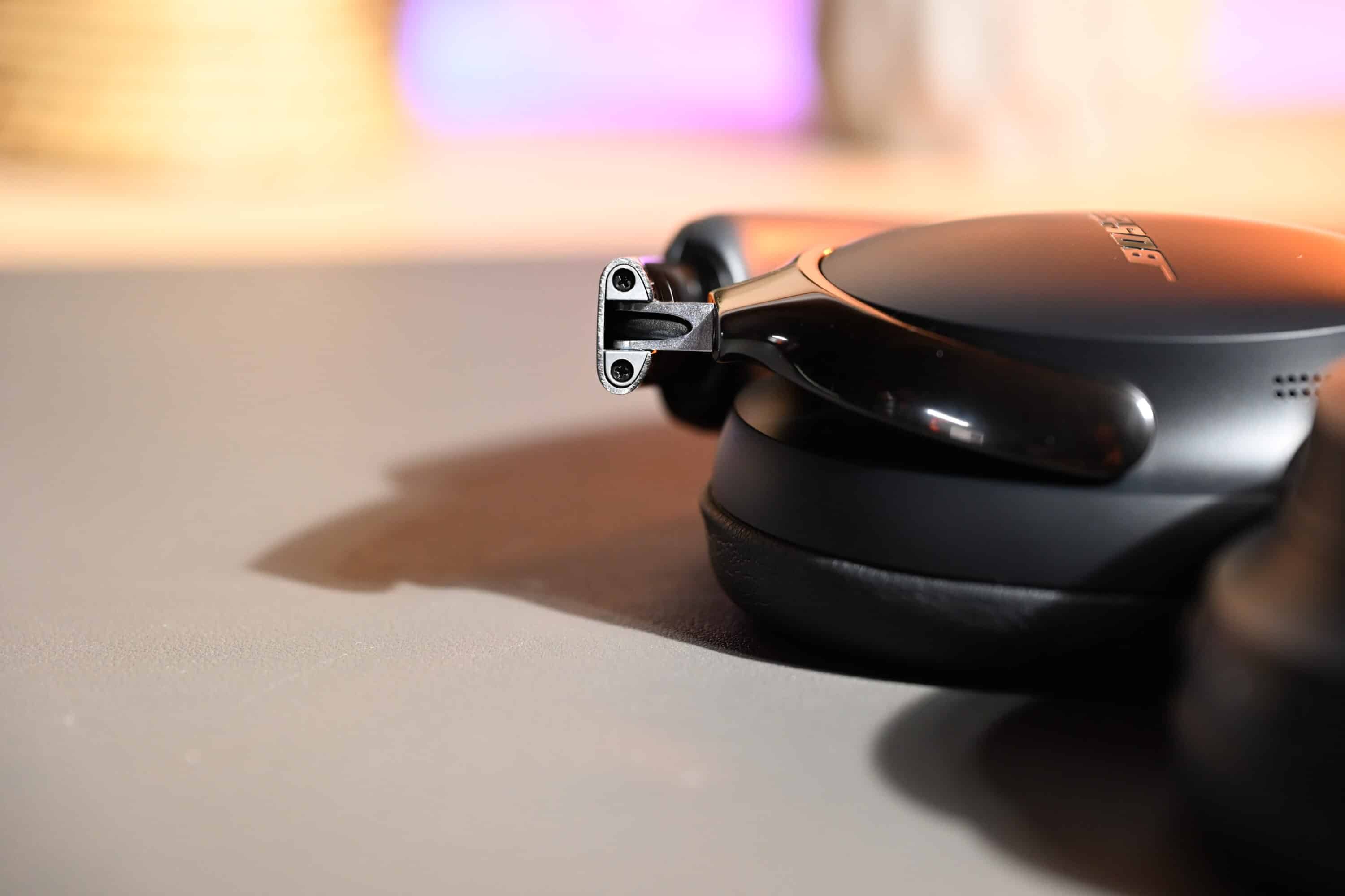 Bei den Details überzeugen saubere Spaltmaße und exzellente Verarbeitung. Ein leichter Metallschimmer auf den Gelenken lockert das Design auf, während der matte Kunststoff Fingerabdrücke kaum zeigt. Die Verarbeitung wirkt insgesamt sehr langlebig und hochwertig, was den hohen Preis von rund 500 Euro rechtfertigt. Kleine ergonomische Feinheiten – wie angedeutete Griffkanten an der Ohrmuschel zur leichteren Bedienung – gefallen dabei ausgesprochen gut.