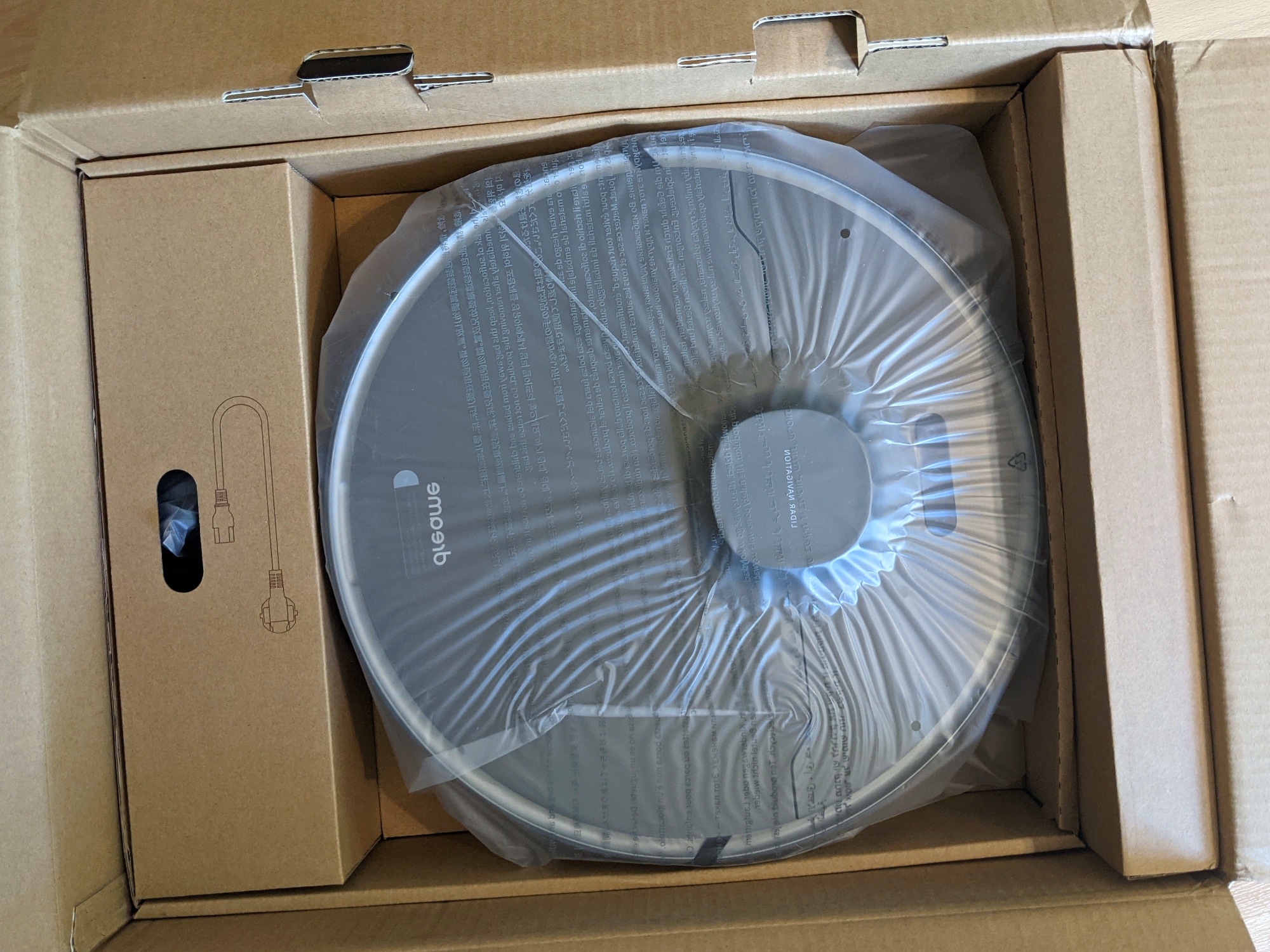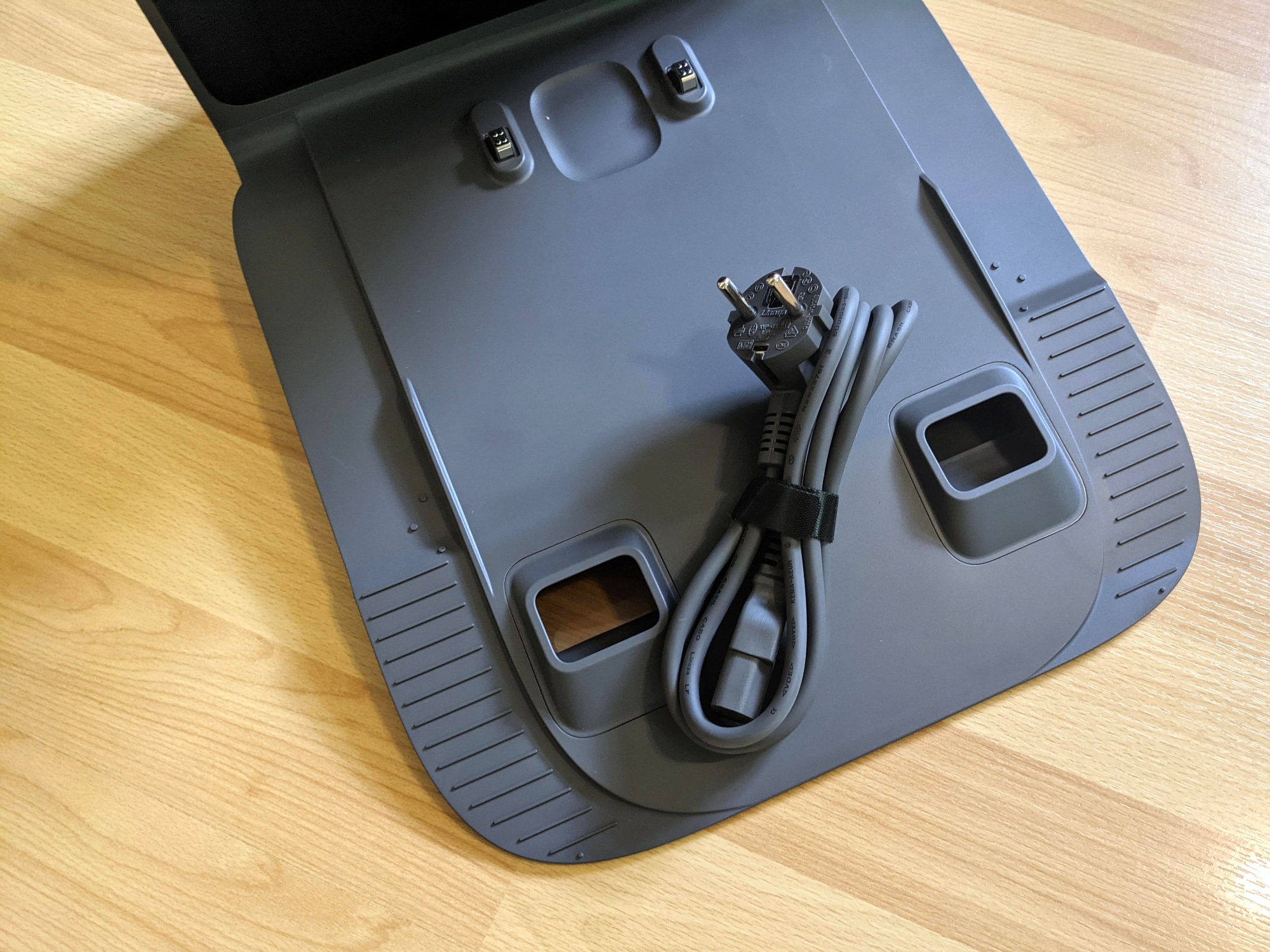 Die Absaug- und Ladestation ist ebenfalls matt grau. Da der Roboter von unten geleert und geladen wird, besitzt die Station eine Rampe, auf die der Roboter nach jeder Reinigung fährt. Lädt er, dann leuchtet zudem eine LED unterhalb des Dreame-Logos. Auch hier setzt man auf eher dezente weiße Beleuchtung. Auf der Rückseite der Reinigungsstation lässt sich zudem das Netzkabel aufwickeln, falls nicht die volle Länge benötigt wird. Dieses wird übrigens angesteckt und ist nicht fest verbaut, womit der Benutzer noch etwas flexibler ist.