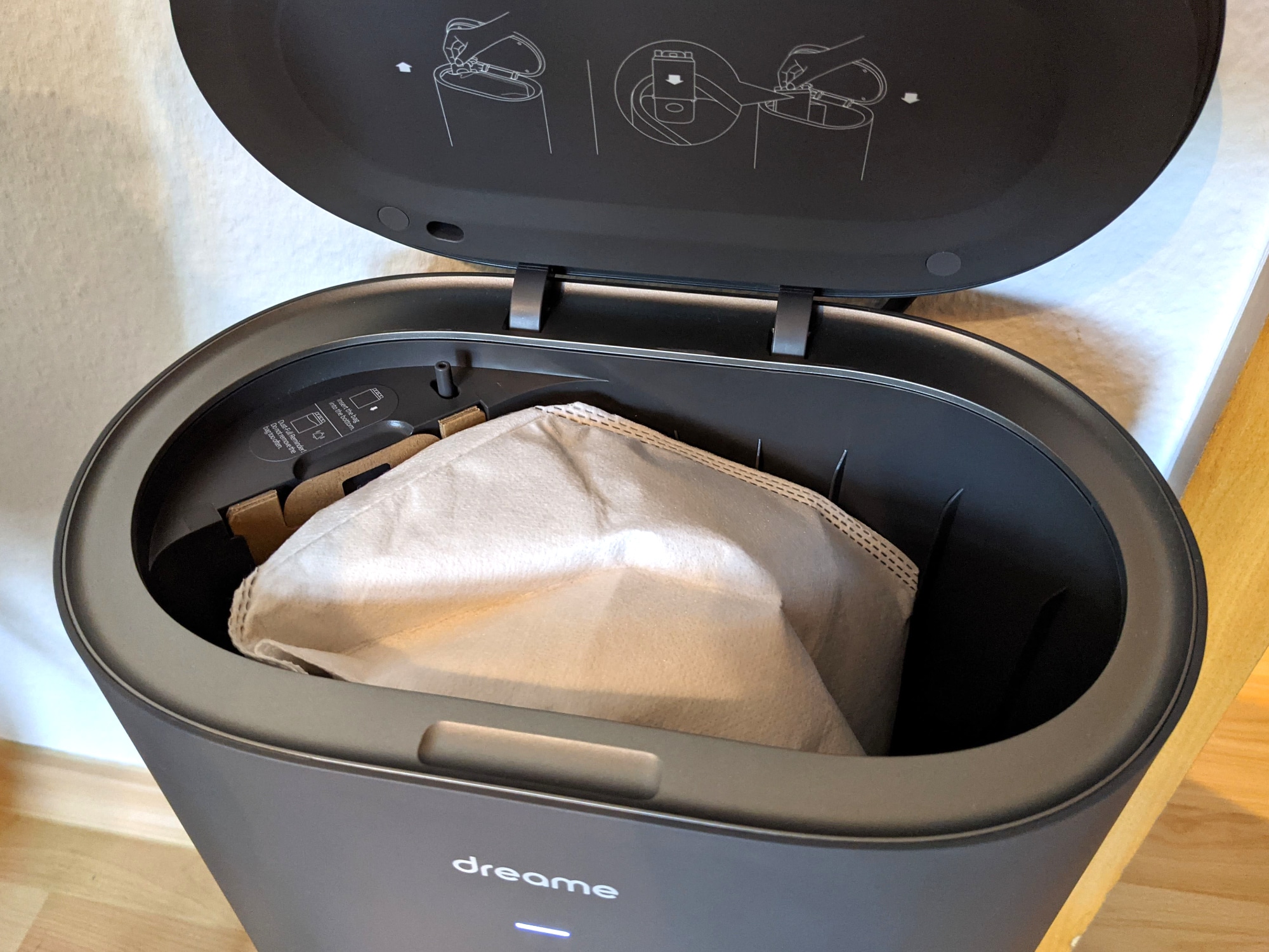 Die Absaugstation dient ebenfalls als Ladestation und erweist sich im Test als sehr praktisch. Während die meisten Roboter Staub und Schmutz bis zu einem Volumen von 400 ml aufnehmen und dann geleert werden müssen, bietet die Absaugstation ein Volumen von 4 l. Der Staubbeutel der Station reicht damit laut Dreame für bis zu 65 Tage. Nach etwas über 3 Wochen im täglichen Einsatz ist dieser noch nicht annähernd voll. Eine Entleerung durch den Nutzer erfolgt damit deutlich seltener. Noch besser hätte uns hier aber ein entleerbarer und damit wiederverwendbarer Behälter statt einem Beutel gefallen.