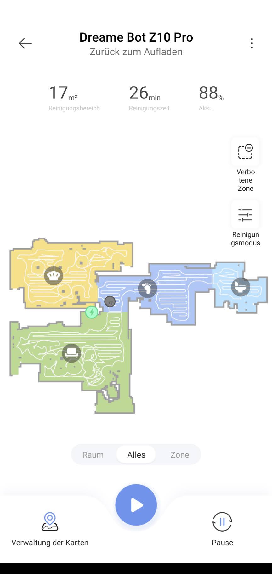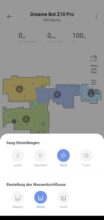 Die Karte eurer Wohnung bildet die Startseite der App. Diese wird während der ersten Reinigung automatisch erstellt, auch mehrere Ebenen sind möglich. Der Roboter scannt dafür die Umgebung und erkennt in den meisten Fällen auch, wenn der Raum gewechselt wird. Die erstellte Karte kann auch selbst bearbeitet werden. So können Räume weiter geteilt werden, falls der Dreame Z10 Pro mehrere zusammengefasst hat oder verbotene Zonen eingerichtet werden. Letztere sind vor allem in Haushalten mit Kindern oder Tieren praktisch, um das Aufsaugen von Spielzeugen bzw. Kleinteilen zu vermeiden, ein weiteres Beispiel wären begehbare Duschen.