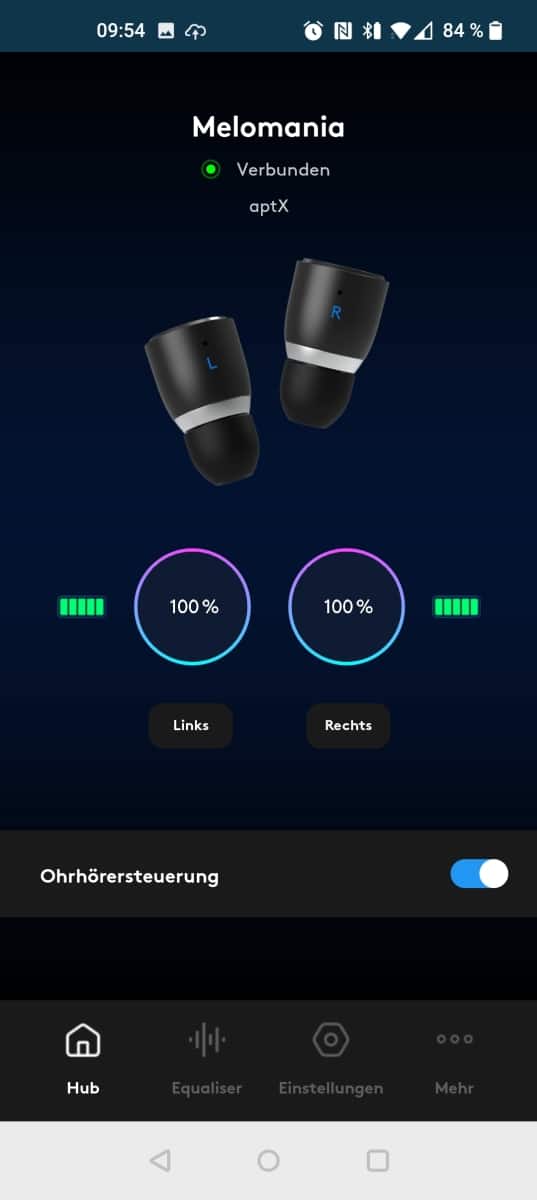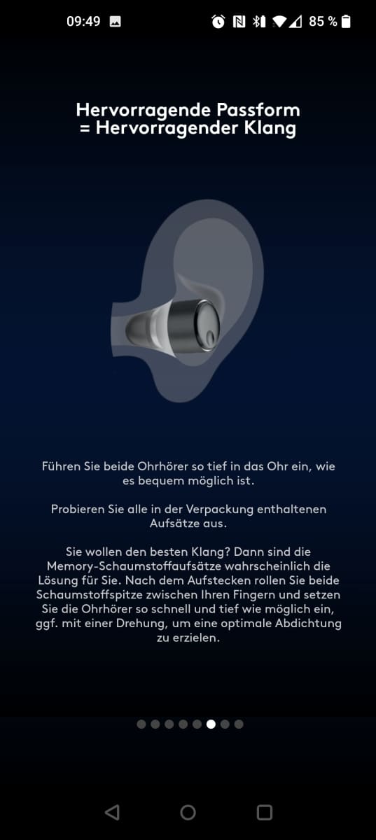 Im Gegensatz zum Vorgänger lassen sich die Earbuds mithilfe einer umfangreichen Begleit-App steuern, die hinsichtlich des Funktionsumfang auf dem der Melomania Touch aus dem Vorjahr aufbaut. Nach der Erstinstallation wartet die App bereits mit einem Firmware-Update für die In-Ears auf, das den Klang minimal verbessert und problemlos binnen weniger Minuten installiert wird. Dabei begrüßt euch die App zunächst mit einem umfangreichen Tutorial, das alle Funktionen der Kopfhörer detailliert erklärt und zusätzliche Tipps zum Erzielen der optimalen Passform liefert.