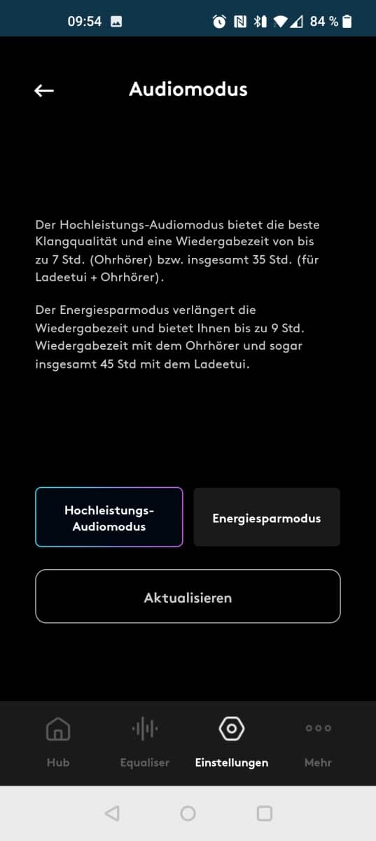 Interessant ist zudem der Hochleistungs-Audiomodus, der in der App aktiviert werden kann. Hierbei wechseln die verbauten Verstärker in den Class A/B Betrieb, was sich in einer noch besseren Klangqualität niederschlagen soll. Der Unterschied fällt allerdings nur minimal aus und rechtfertigt die damit einhergehende Reduktion der Akkulaufzeit kaum.