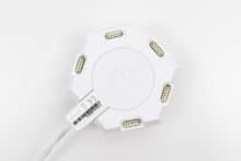 Eine weitere Bedienungsmöglichkeit findet sich am Ladekabelmodul: Per Touchbefehl kann zwischen voreingestellten Farbmodi gewechselt werden. Ferner lassen die Leuchtelemente sich auf diesem Wege ein- und ausschalten. Der Button ist durch eine Linie gekennzeichnet. Wird kurz auf ihn gedrückt, erfolgt ein Moduswechsel. Wird er lange berührt, schalten die Lampen sich aus.