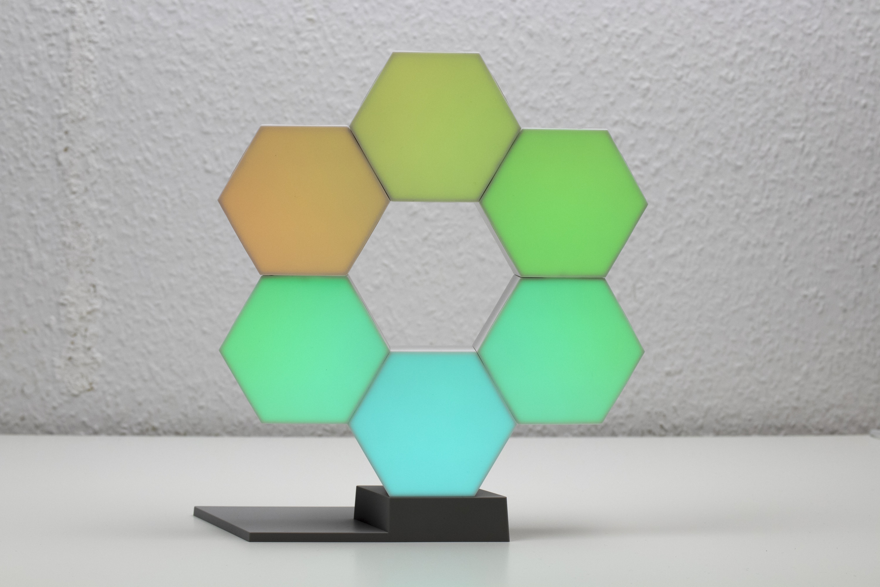 Hinsichtlich der Verarbeitung der Leuchtelemente gibt es wenig zu sagen. Sie wirken stabil und weisen keine offensichtlichen Schwächen auf. Ferner sind sie handlich, lassen sich leicht miteinander verbinden und sind dabei deutlich stabiler als die Module von Nanoleaf. Allerdings ist Cololight auch zum Aufstellen vorgesehen, während Nanoleaf an die Wand geklebt werden sollte. Falls ihr Cololight an eurer Wand anbringen möchtet, benötigt ihr die zusätzlich erhältlichen Wandhalterungen.