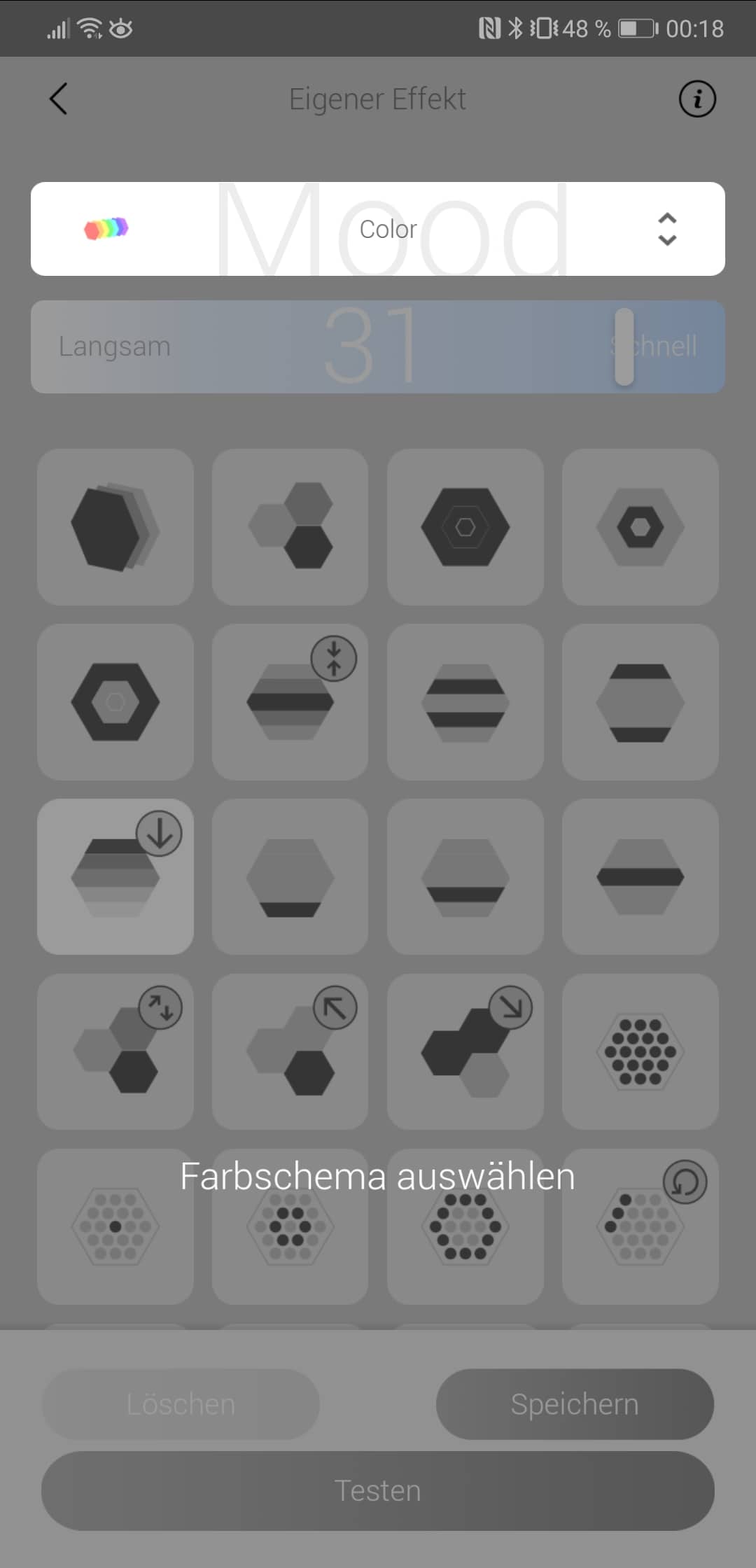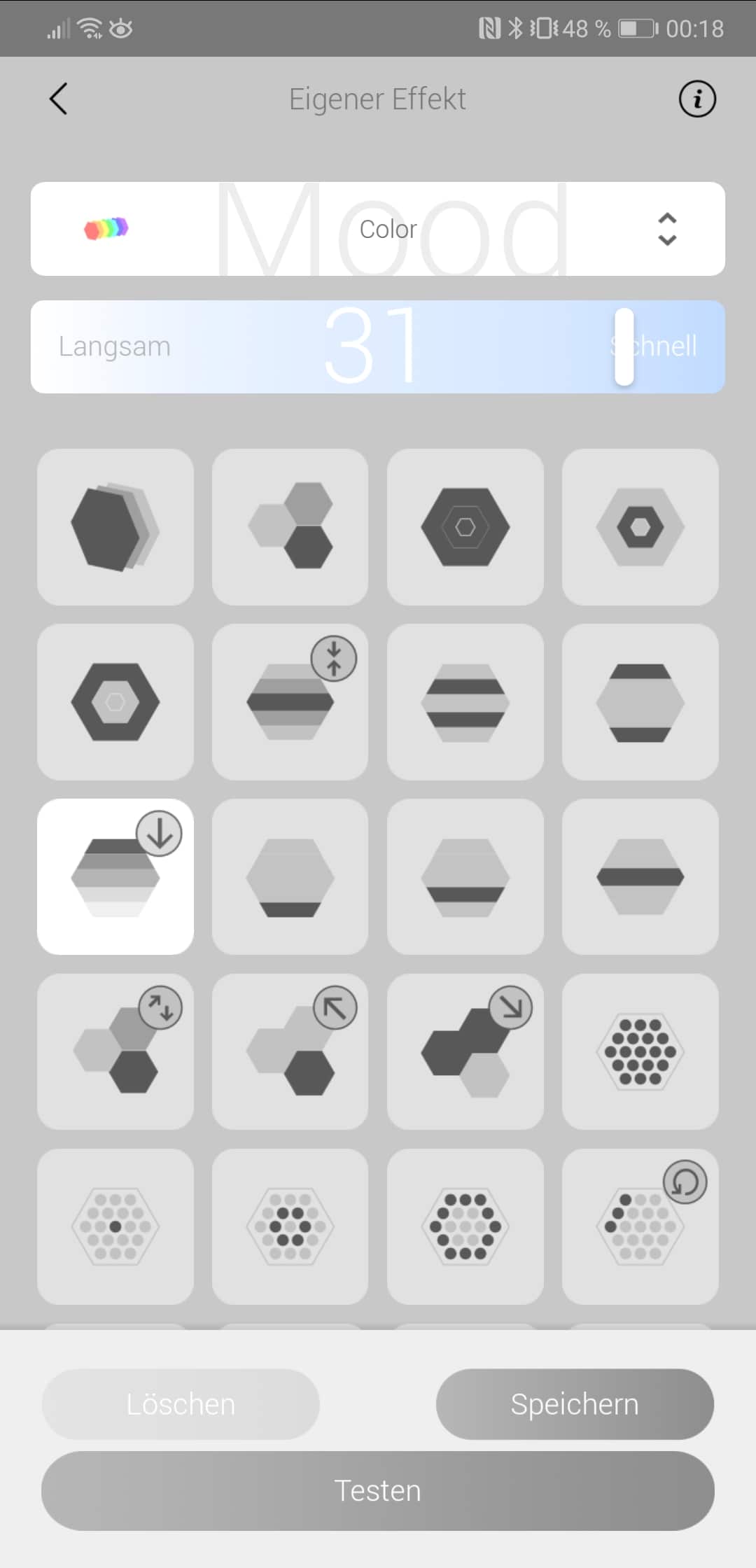 Steht die Verbindung einmal, kann die Lampe per App ein- und ausgeschaltet werden. Ferner können unterschiedlichste Farben und Effekte ausgewählt werden. 24 voreingestellte Effekte können einfach angewählt werden. Darüber hinaus besteht die Möglichkeit, eigene Effekte zu erstellen, was die Darstellungsoptionen noch einmal stark erweitert.