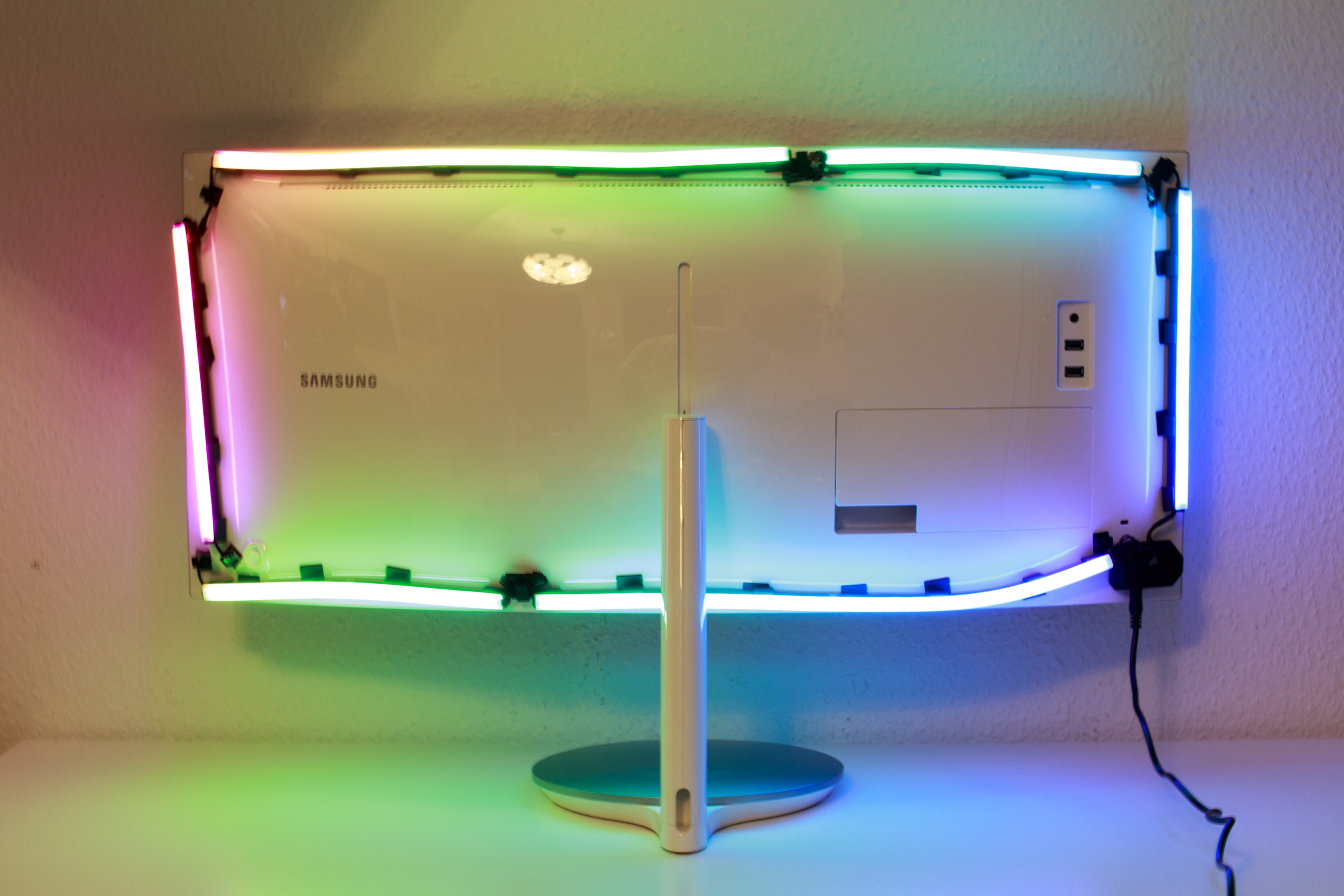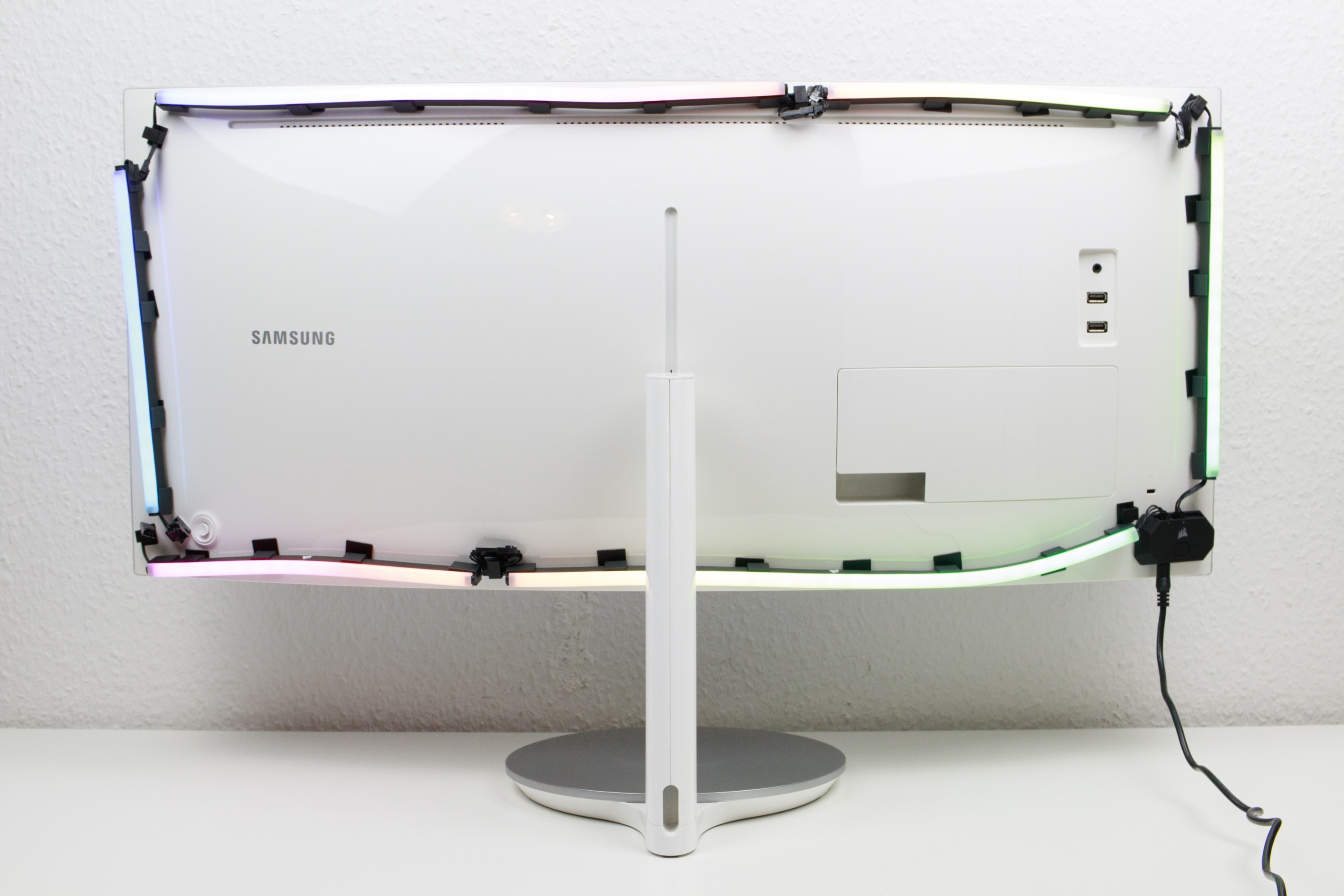 Wir haben erwartet, zwar nicht vor einer Herkulesaufgabe, aber doch vor einem beachtlichen Stück Arbeit zu stehen. Tatsächlich war es dann aber gar nicht sonderlich schwer, die Leuchtstreifen anzubringen. Die Befestigung an einem Monitor ist im Grunde sogar eine relativ simple Angelegenheit. Hierzu müssen lediglich die Metallplättchen in relativ regelmäßigen Abständen, die ungefähr denen der Magnetblöcke zueinander entsprechen, auf die Rückseite des Monitors geklebt werden. Anschließend erleichtert der Magnetismus die Arbeit enorm – die Leuchtstreifen werden mit Hilfe der Magneten an den Metallplättchen befestigt, was im Handumdrehen erledigt ist. Wer über einen stark gebogenen Monitor verfügt, könnte jedoch weit mehr Arbeit haben, da die Leuchtstreifen nur in begrenztem Maße biegbar sind. Letztlich sollte es jedoch auch dann funktionieren. Hilfreich sind hier jedoch auf jeden Fall die Kabelmanagementclips, die für einen festeren Sitz sorgen.