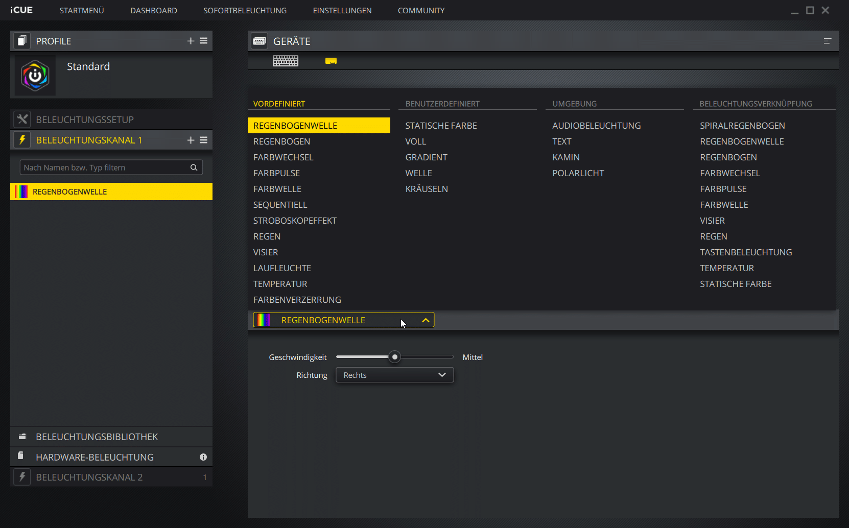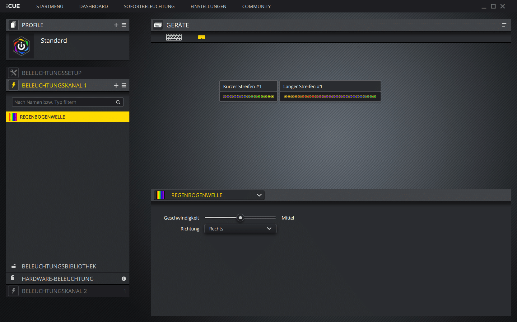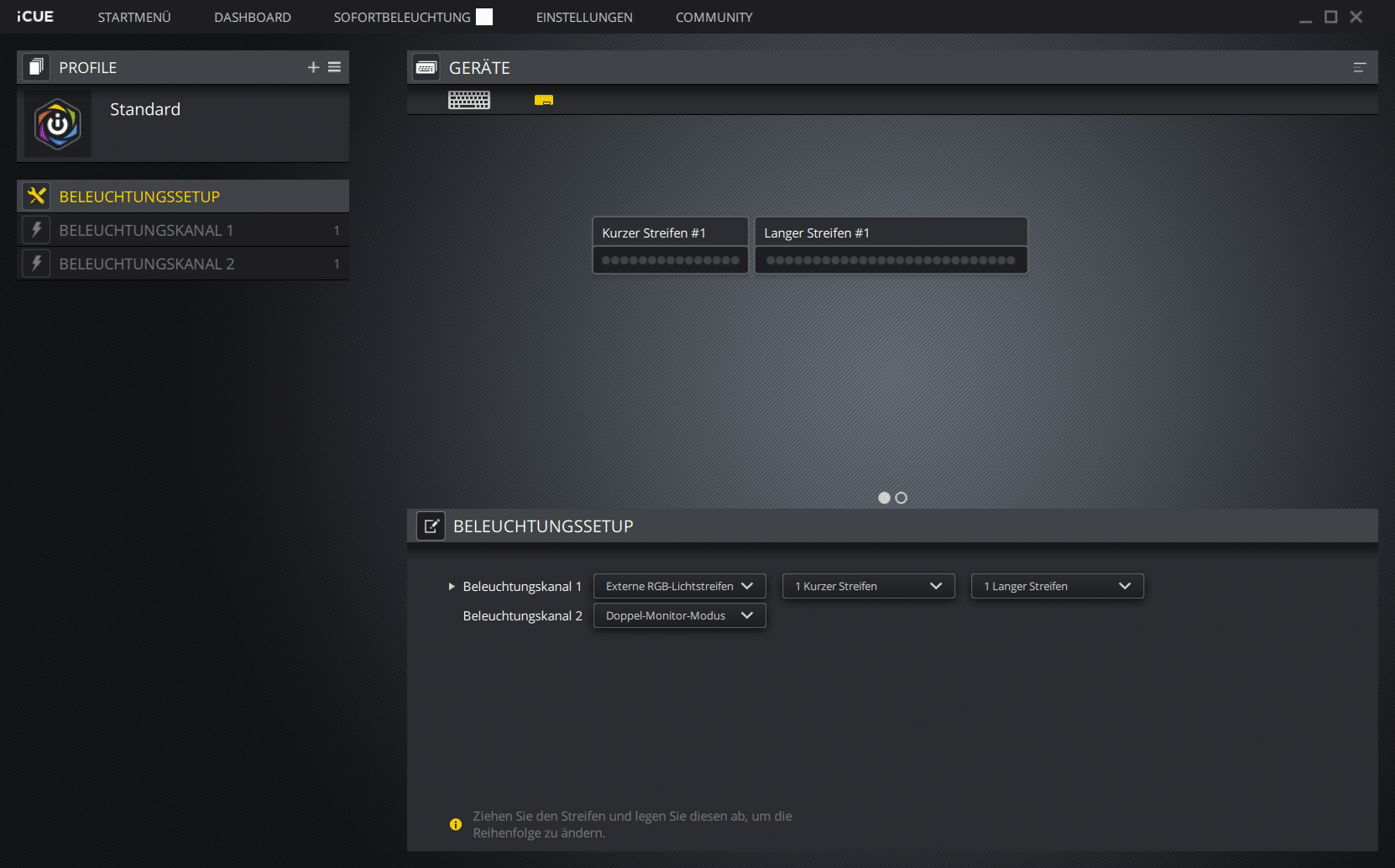 Um die Möglichkeiten, die die Leuchtstreifen bieten, voll ausschöpfen zu können, ist eine kostenlose Software des Herstellers nötig. Mit dieser lässt sich die Beleuchtung an die eigenen Wünsche anpassen. Wir haben die Software als sehr intuitiv bedienbar erfahren. Corsair arbeitet in der Software mit Grafiken, was zur Verständlichkeit beiträgt. Beleuchtungseffekte stehen massenhaft zur Verfügung. Darüber hinaus sind auch benutzerdefinierte Einstellungen möglich. Es kann wie gesagt jede LED einzeln angesteuert werden – nicht nur durch einen mehrfarbigen Effekt über den gesamten Strip. So kann ein langer LED-Strip mit 27 LEDs auch 27 unterschiedliche Beleuchtungseffekte darstellen, wenn das gewünscht ist.