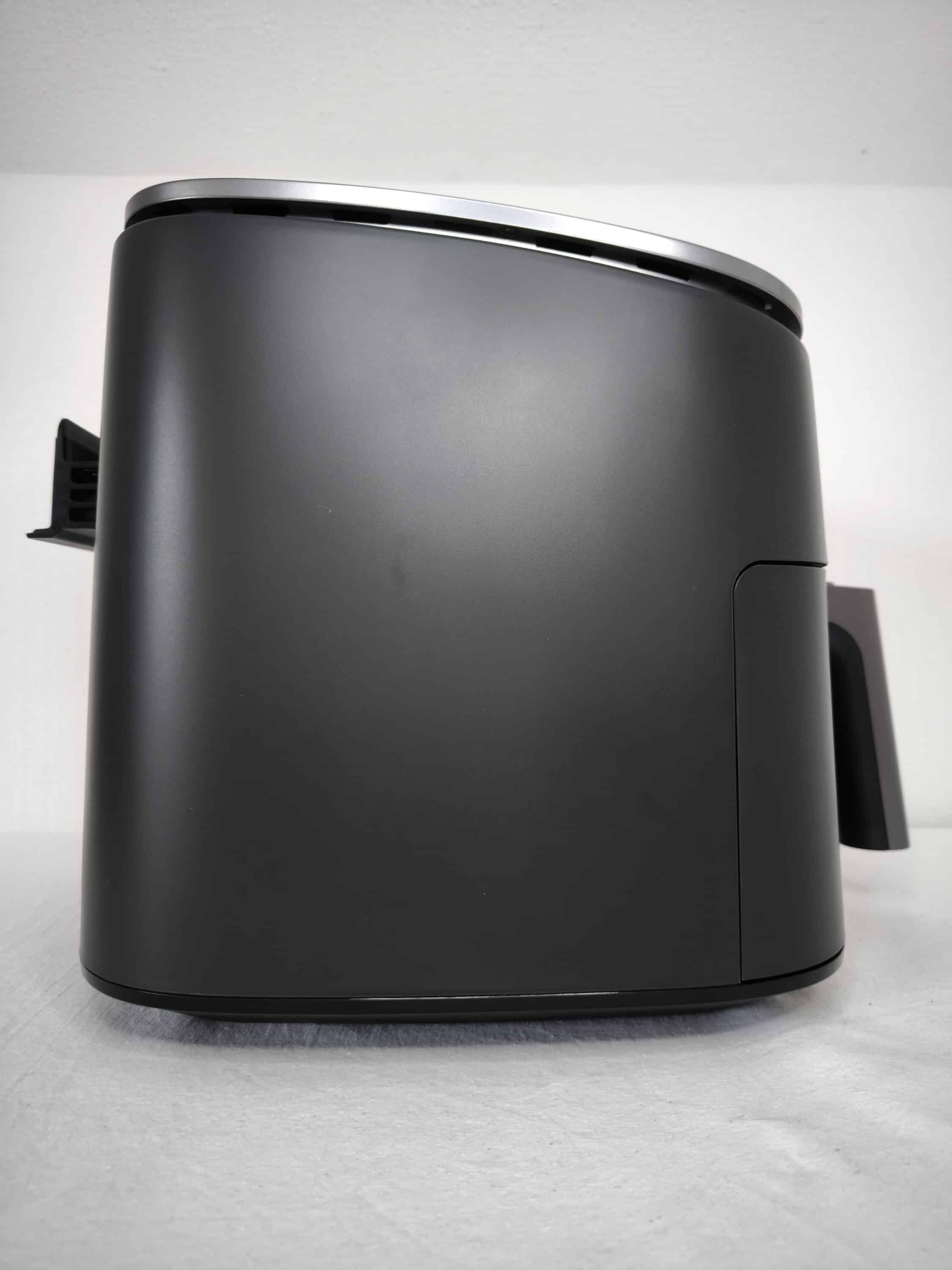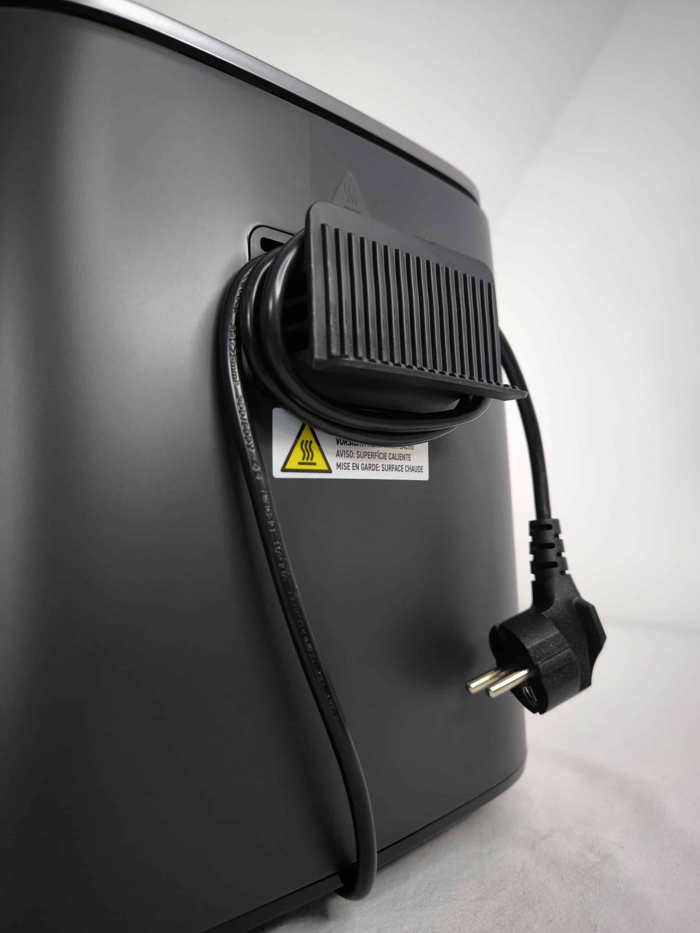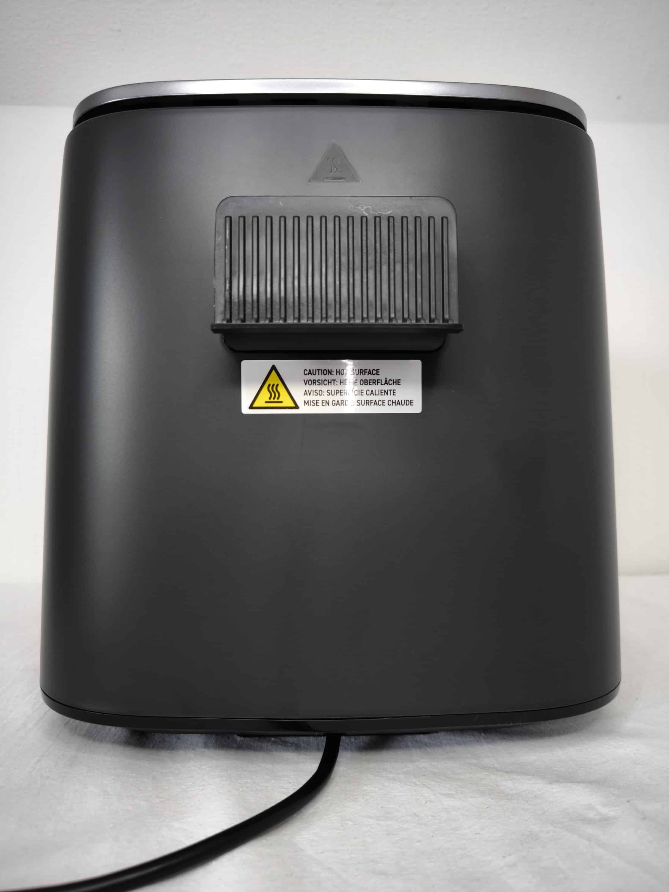 Rein optisch wirkt die COSORI TurboBlaze 6L mit ihrem matt-dunkelgrauen Gehäuse und der Metalloptik an der Kopfseite zurückhaltend und zeitlos. Der Griff hebt sich jedoch farblich mit einem helleren Akzent von der Heißluftfritteuse ab. Apropos Griff: An dessen Oberseite sorgt ein Knopf dafür, dass sich der Korb aus der TurboBlaze 6L herausziehen lässt. Die Seiten des Airfryers sind vollständig glatt, während sich auf der Rückseite eine Halterung zum Einfädeln des Netzteils befindet.