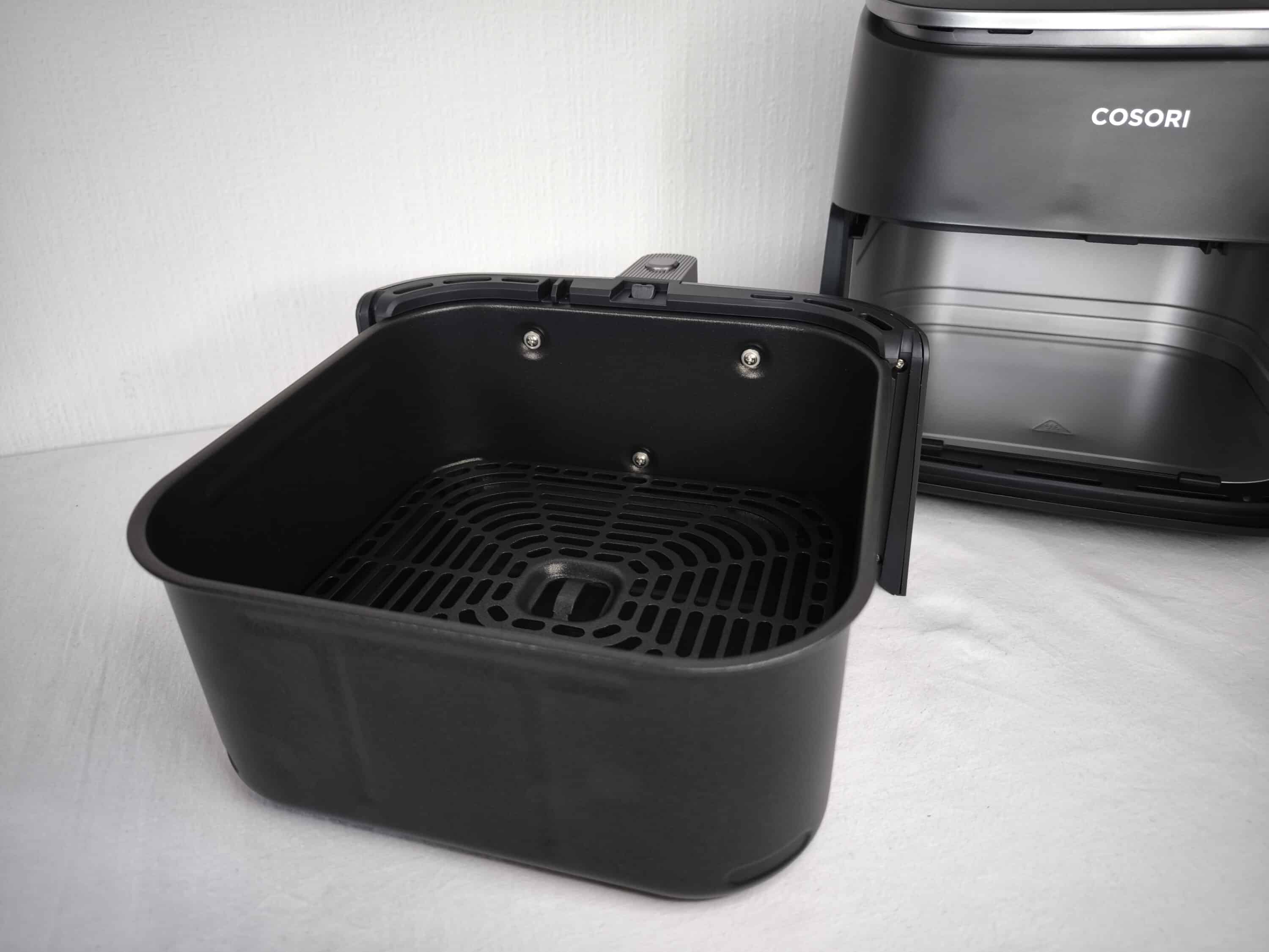 Was die Bedienung betrifft, so ist diese ausgesprochen simpel. Der Frittierkorb lässt sich problemlos aus der COSORI TurboBlaze 6L herausnehmen und auch wieder einschieben. Dabei rastet er beim Einsetzen auch hörbar ein. In beiden Fällen genügt ein Druck auf den Griffknopf, um die Arretierung zu lösen. Obendrein ist sowohl der Korb wie auch die Röstplatte, welche aus antihaftbeschichtetem Aluminium besteht, spülmaschinentauglich. Damit Letztere in der Schublade auch nicht verrutscht, befindet sich an der Unterseite auf jeder Seite ein Silikonstreifen.