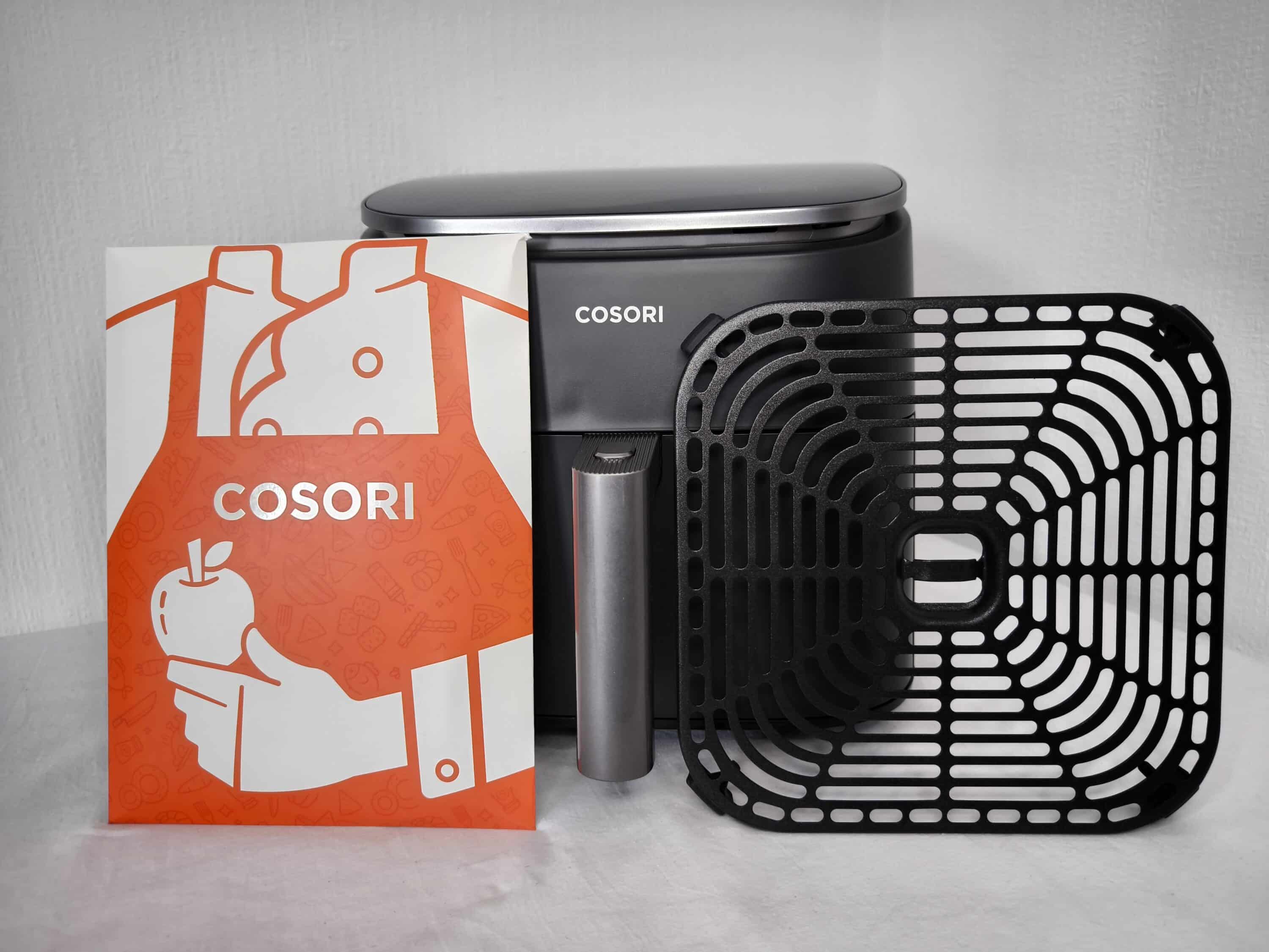 Der Lieferumfang der COSORI TurboBlaze 6L umfasst neben der Heißluftfritteuse selbst eine Röstplatte. Als weiteres Zubehör liegen die Bedienungsanleitung und ein Büchlein mit abwechslungsreichen Rezepten bei.