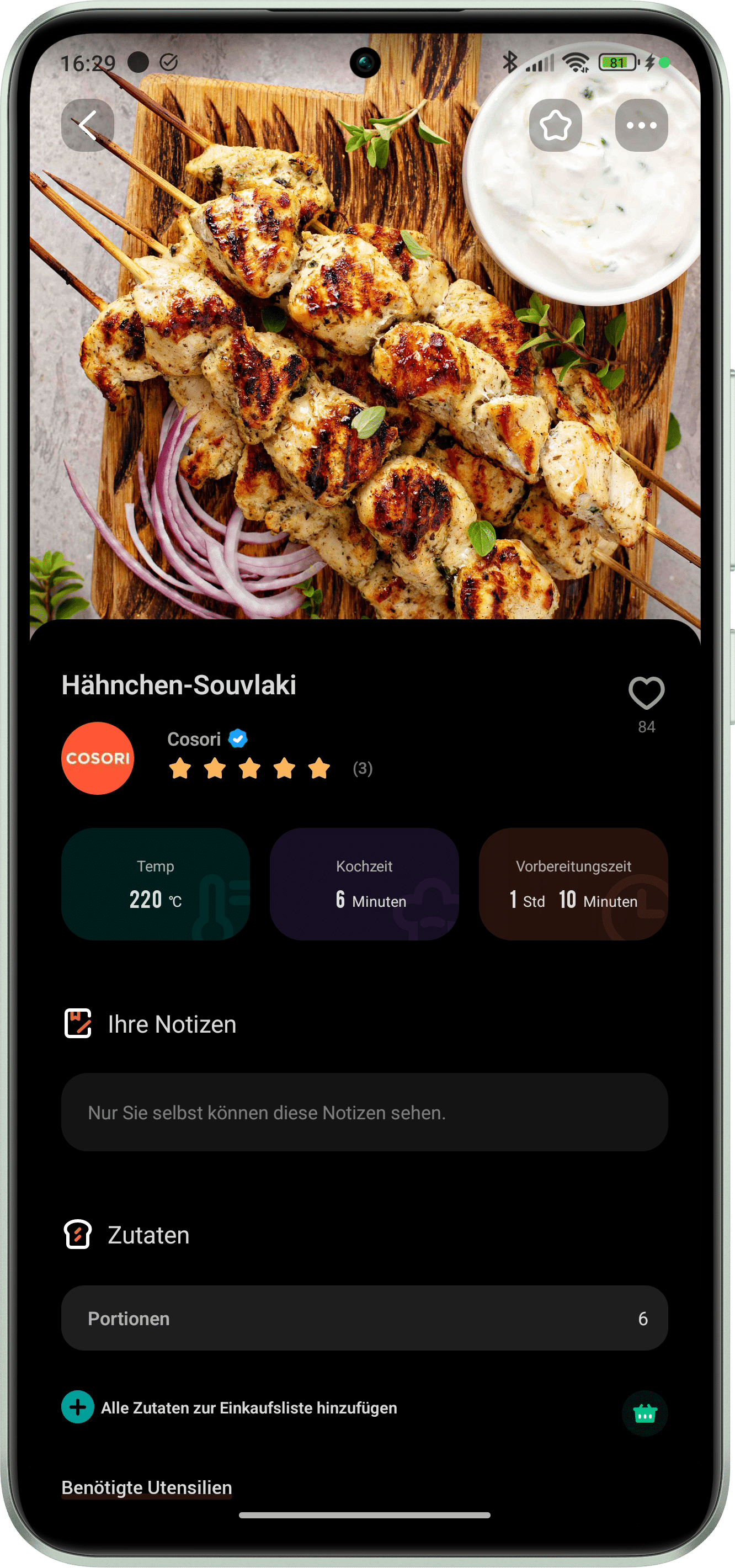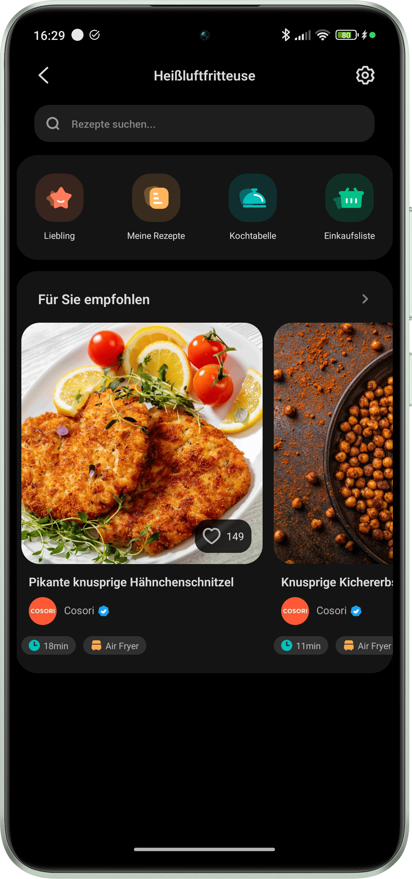 Die COSORI TurboBlaze 6L stellt keine smarte Heißluftfritteuse dar. Entsprechend kann die Fritteuse auch nicht mit VeSync gesteuert werden. Vielmehr ist die App als smarter Begleiter zu verstehen. Via VeSync lässt sich die COSORI TurboBlaze 6L im Account hinterlegen und individuelle Rezepte aufrufen. Dazu bietet COSORI eine reichhaltige Palette an Gerichten an, die entweder in der Kochtabelle direkt ausgewählt oder per Suche ausfindig zu machen sind. Nach Auswahl eines Rezeptes erscheint eine Übersicht der benötigten Zutaten sowie die Angabe der Gesamtkochzeit. Gleichzeitig erhält man eine detaillierte Schritt-für-Schritt-Anleitung inklusive Timerfunktion auf Knopfdruck.