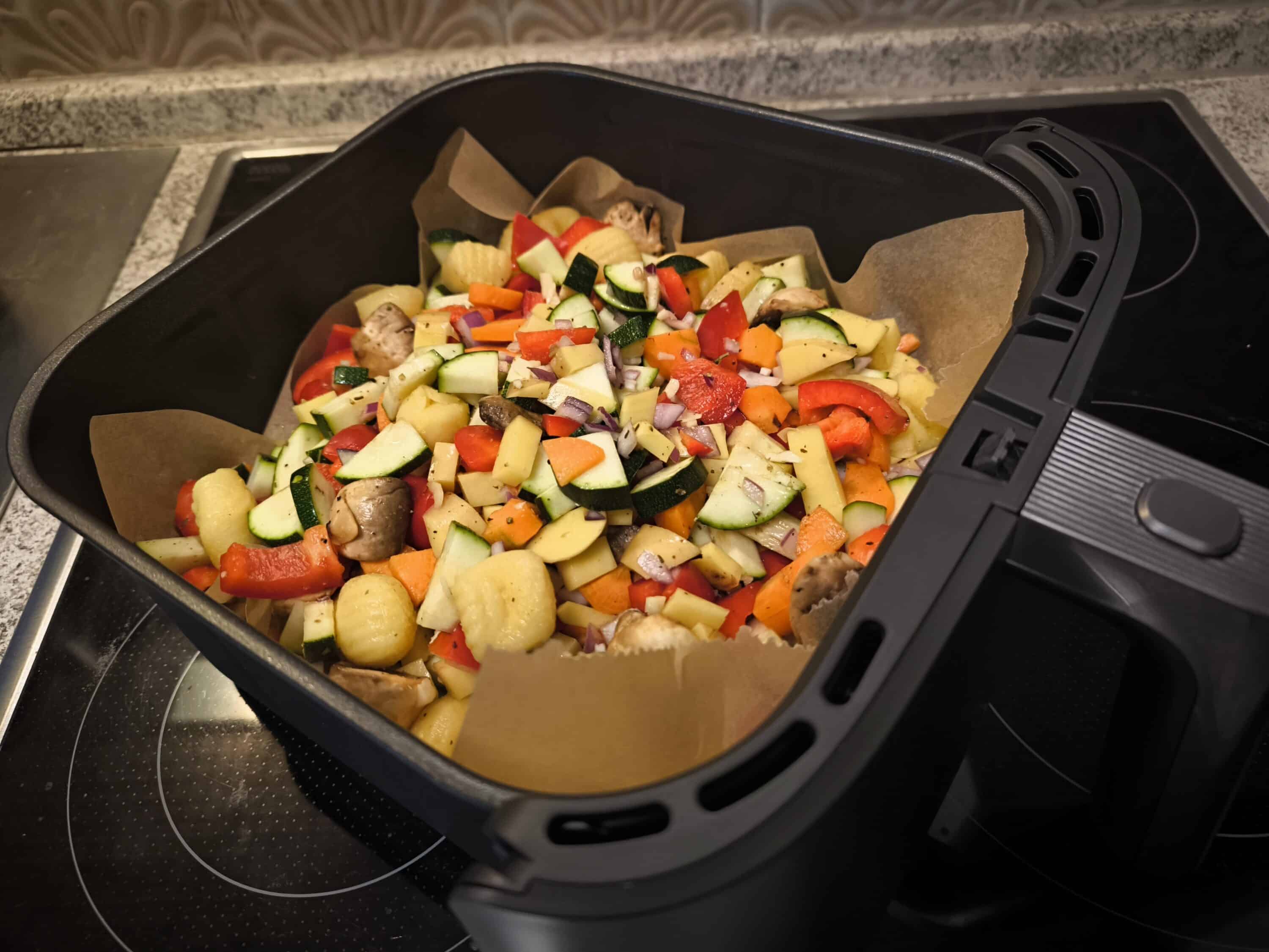 Im Praxistest erweist sich das Kochen mit der COSORI TurboBlaze 6L als äußerst komfortabel. Zum Auftakt haben wir frisches Gemüse geschnitten und in der Heißluftfritteuse als Gemüsepfanne zubereitet. Dabei nutzten wir den Modus „Braten“, wodurch sich das Resultat wirklich sehen lassen konnte. Übrigens: Um die anschließende Reinigung zu erleichtern, haben wir den Boden vorher mit Backpapier ausgelegt. Das heißt aber nicht, dass das Backpapier auch beim Vorheizen drin bleiben kann – hier besteht Brandgefahr!