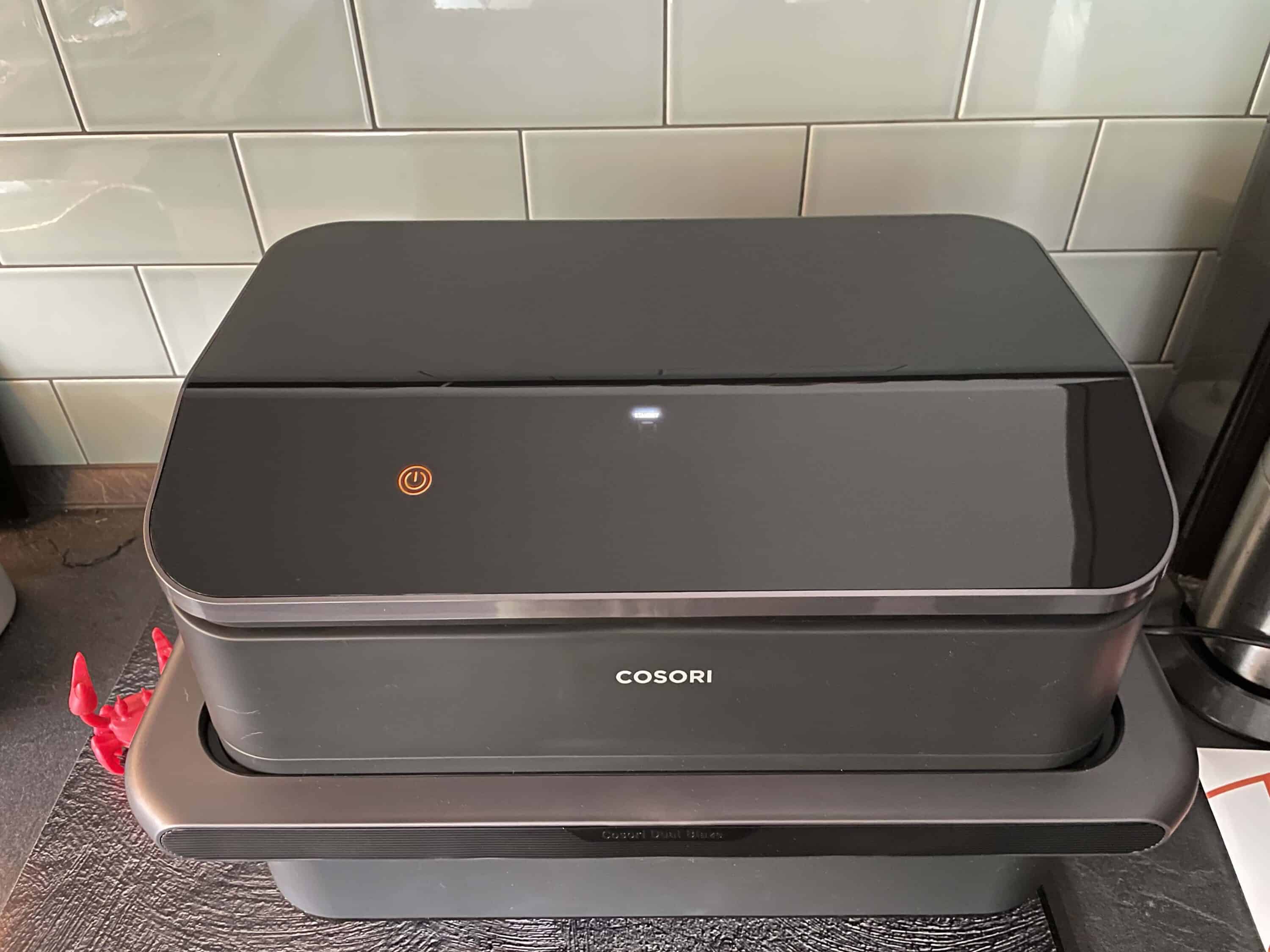 Die Inbetriebnahme der COSORI geht blitzschnell von der Hand. Bevor ihr die beiden Einlegeböden und die Trennwand erstmalig einsetzt, solltet ihr alles nochmal kurz im Waschbecken abspülen. Nun könnt ihr sie einsetzen und das Gerät in eine passende Steckdose einstecken. Dabei störte mich eigentlich nur das recht kurze Netzkabel. Solltet ihr keine Steckdose in unmittelbarer Nähe haben, kommt ihr um ein Verlängerungskabel nicht umhin.