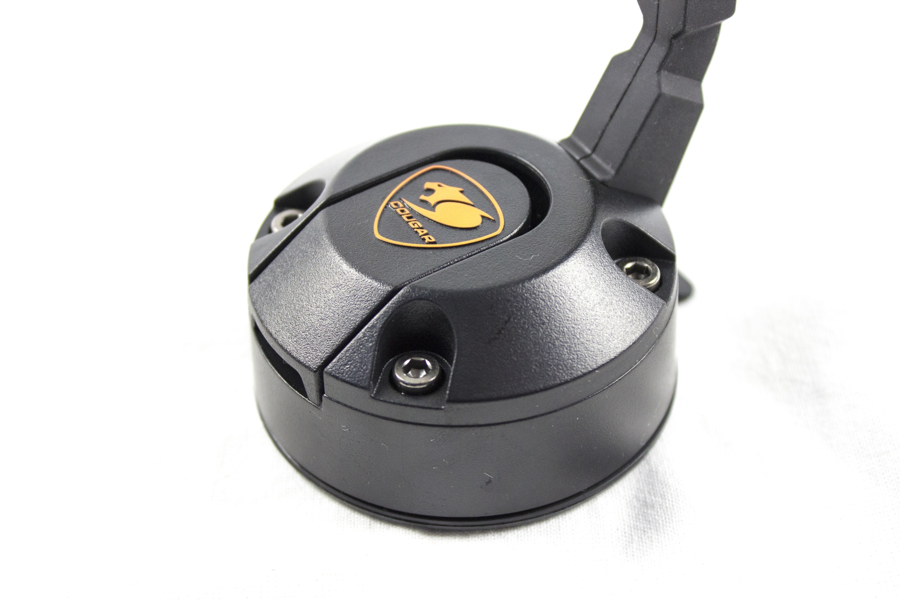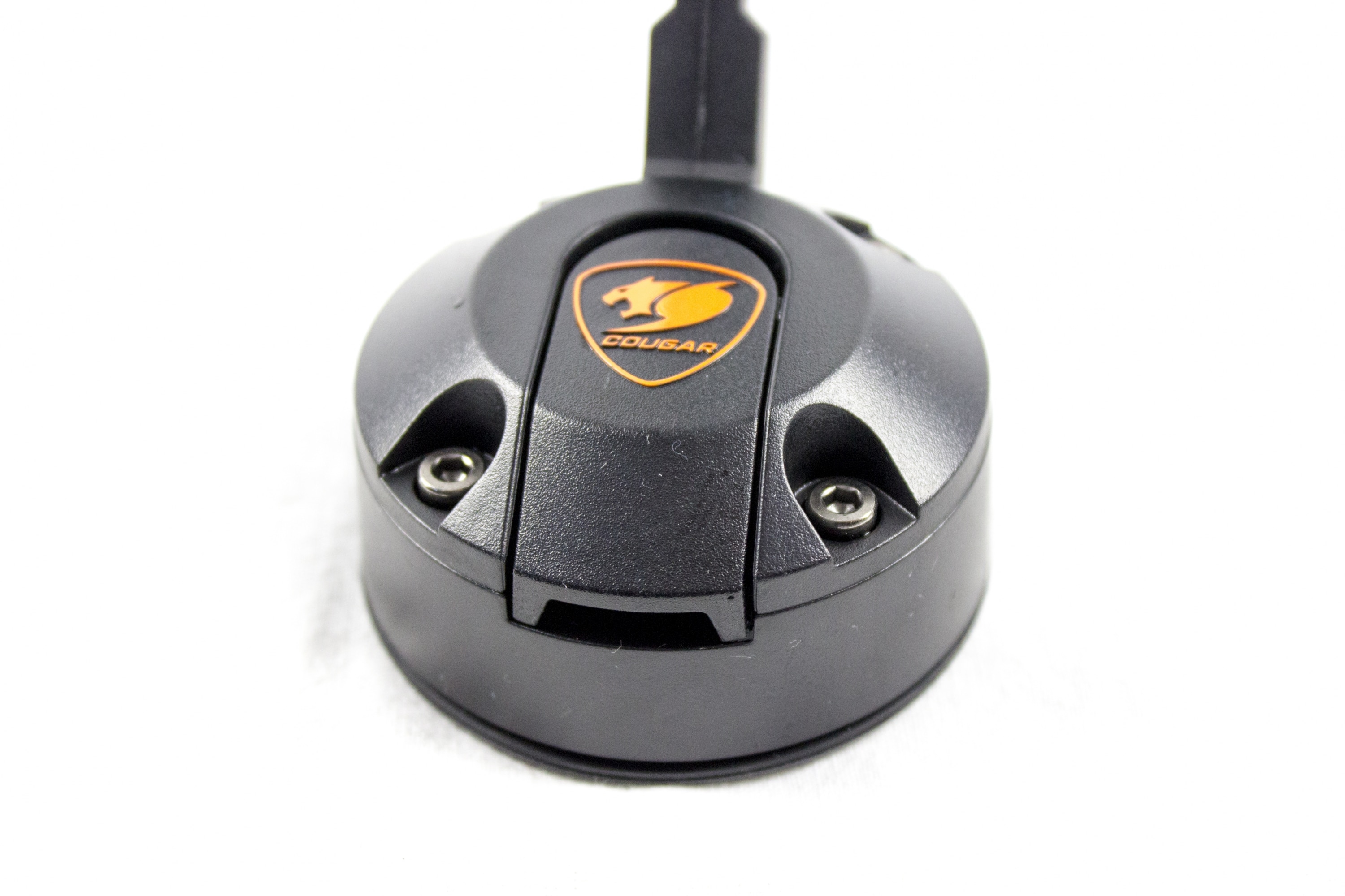 Farblich ist das Maus Bungee von Cougar sehr schlicht gehalten, denn neben der schwarzen Grundfarbe ist lediglich das orangene Cougar-Logo angebracht. Es finden sich auch vier Schrauben am Gehäuse, die den Cougar Bunker optisch aufwerten.