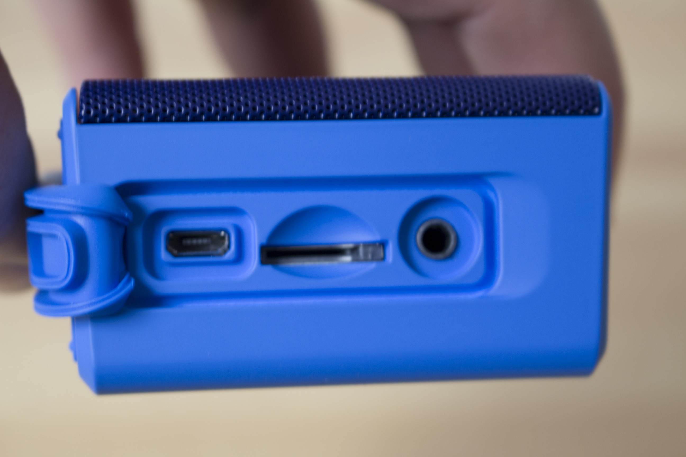 Hinter einer Gummilasche befinden sich die Anschlüsse zum Aufladen und Ansteuern der kompakten Boxen. Beide Geräte bieten hier den universalen Micro-USB-Port sowie einen analogen Mini-Klinkeneingang und einen Slot für eine Micro-SD-Karte. Letzterer ist insofern eine interessante Option, da sich damit relativ schnell und unkompliziert Musik abrufen lässt, auch wenn kein Pairing-fähiges Gerät oder eine andere Datenquelle in der Nähe sein sollte. Für die drahtlose Kommunikation wird der weit verbreitete Bluetooth 4.2-Standard genutzt und das Pairing geht Mithilfe der Schnellstartanleitung leicht von der Hand. Signaltöne und zwei LEDs zeigen eine erfolgreiche Verbindung beziehungsweise den Betriebsstatus und die Betriebsmodi an. Fortschrittliche Aptx-Konnektivität bieten die Boxen nicht, können dafür aber hochauflösende Audio-Formate wie FLAC oder WAV wiedergeben.