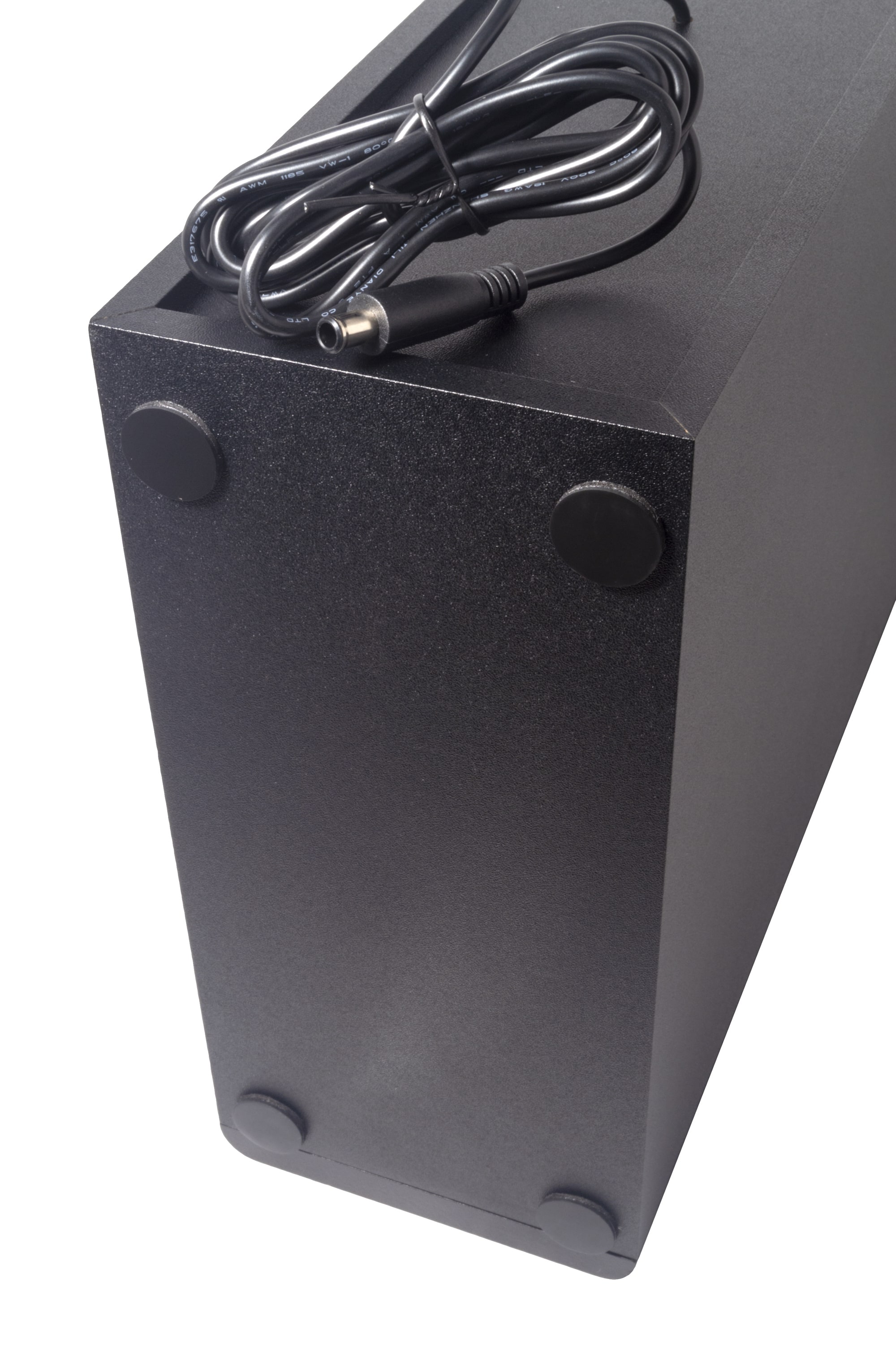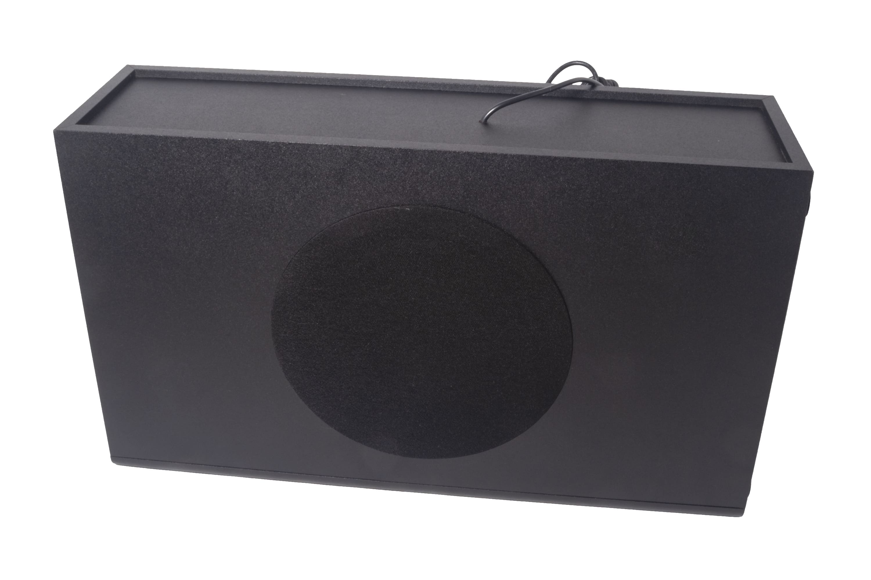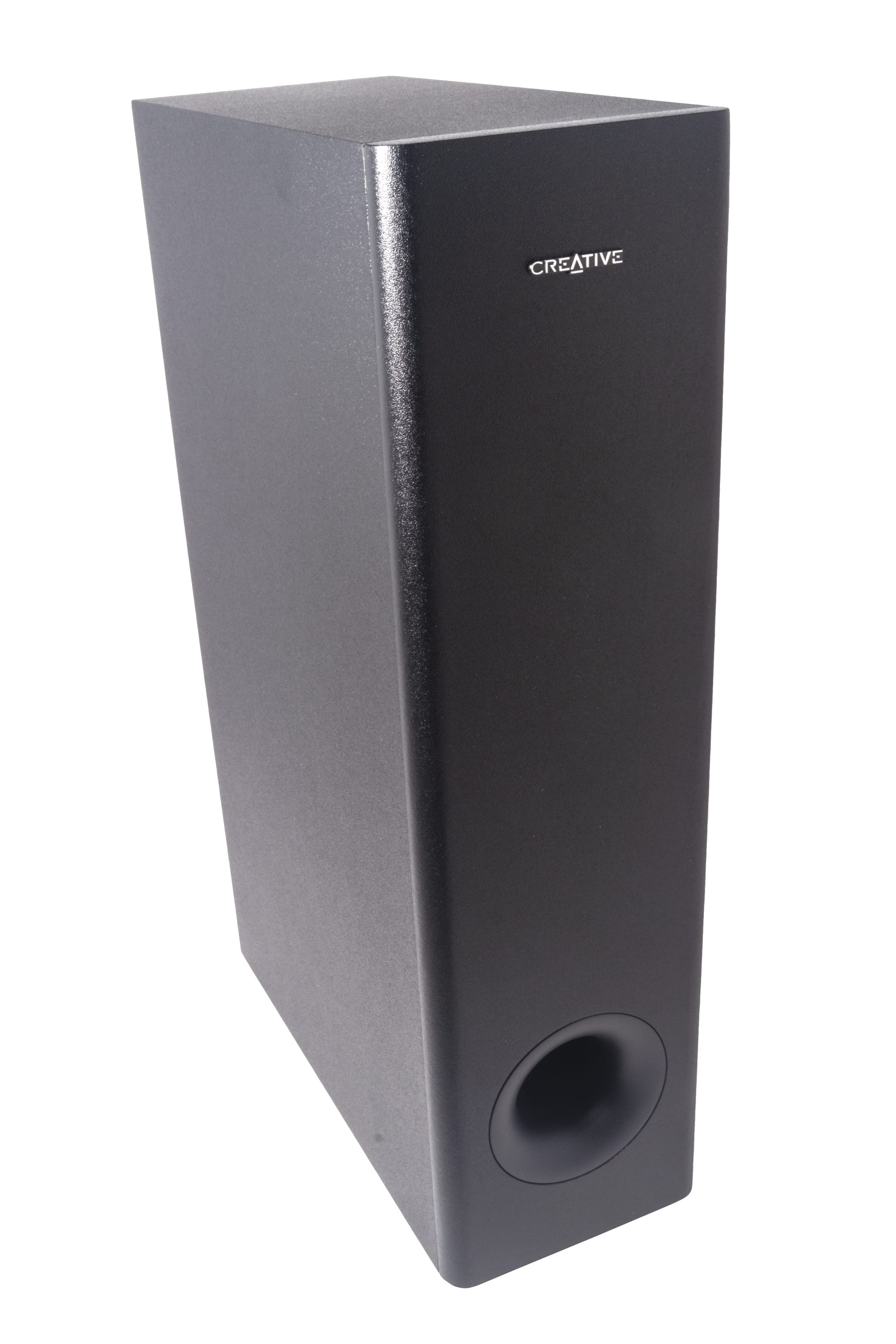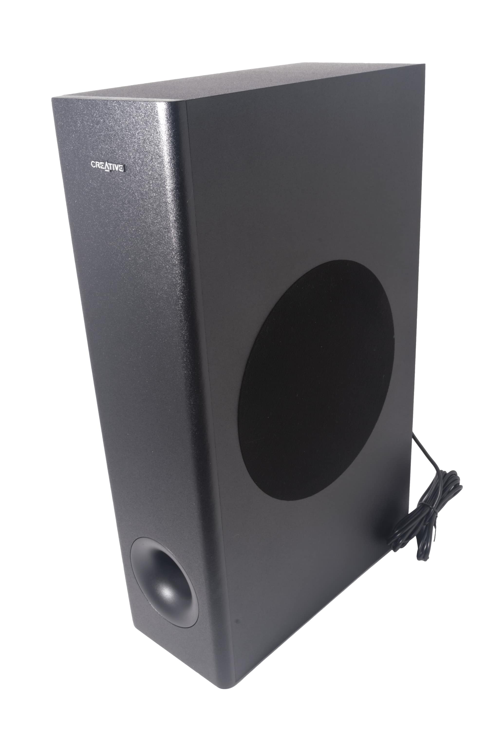 Der Subwoofer, ein Bassreflexsystem, kommt in gewohnter Optik daher. Die Oberfläche ist rundum körnig strukturiert, der seitlich angebrachte Tieftöner ist mit Stoff überspannt. Das Verbindungskabel zur Soundbar ist mittig auf der Rückseite fest mit dem Gehäuse verbunden. Am Boden sorgen vier rutschfeste Standfüße für festen Halt.