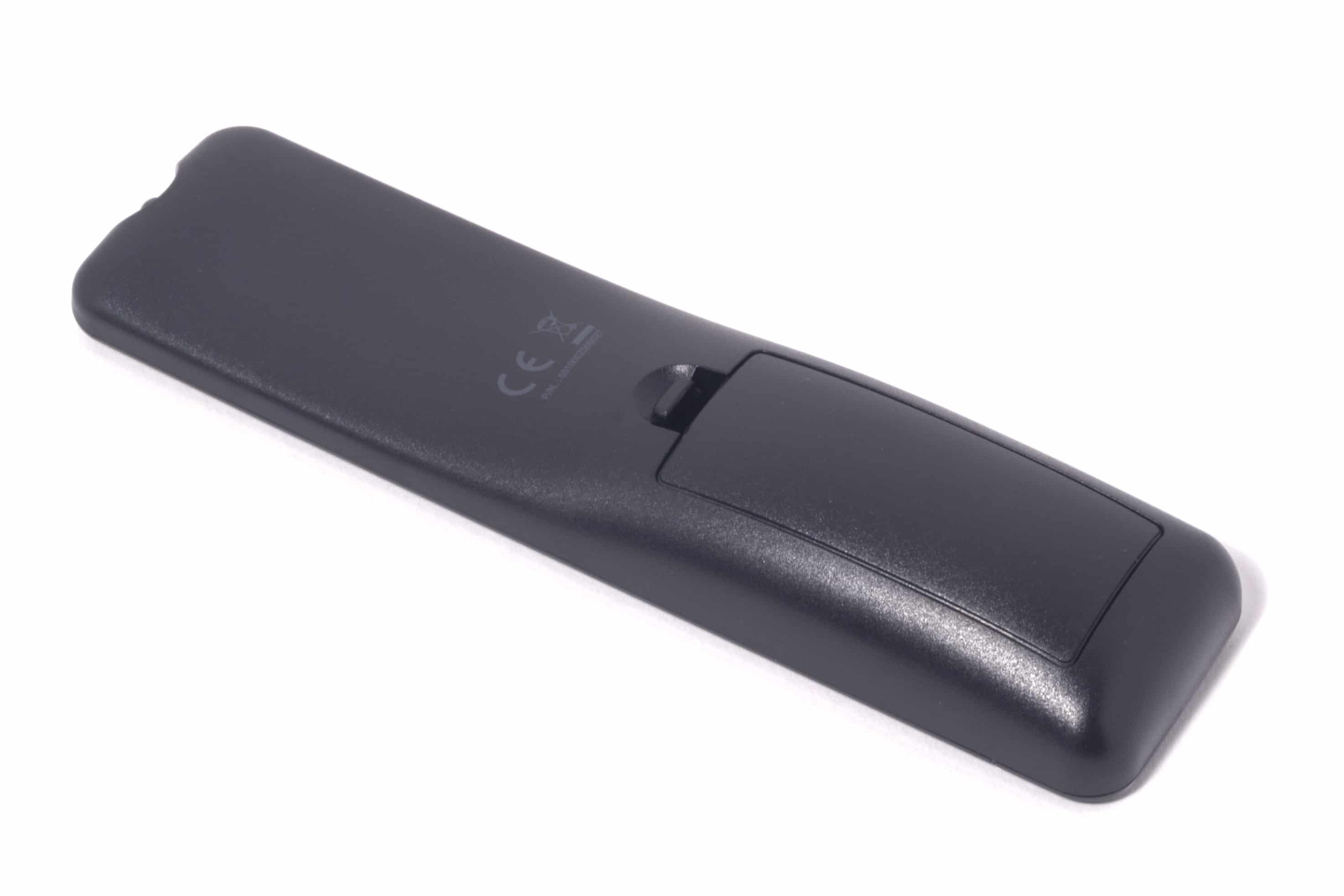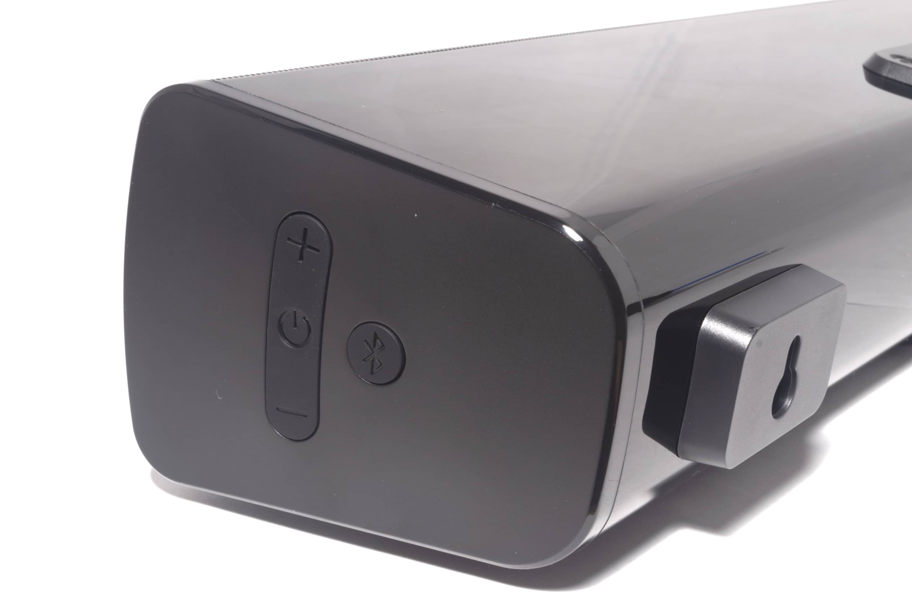 Zu guter Letzt ist da noch die Infrarot-Fernbedienung, deren Gehäuse gänzlich aus Kunststoff besteht. Ihre Bedienknöpfe sind allesamt gummiert, was für eine sehr gute Tastbarkeit sorgt. Die Vorderseite ist hochkant strukturiert, was sich stilistisch von den übrigen Elementen abhebt. Für den Betrieb sind zwei AAA-Batterien erforderlich. Mit ihr lassen sich zusätzlich zu den Basisfunktionen der Soundbar, auch noch alle übrigen Einstellungen vornehmen, wie die Surround- und Dialogfunktion, Bass, Treble und Stummschaltung und darüber hinaus auch, bei geeigneten Geräten und Programmen, das Abspielen des nächsten oder vorherigen Tracks oder das Pausieren der Wiedergabe.