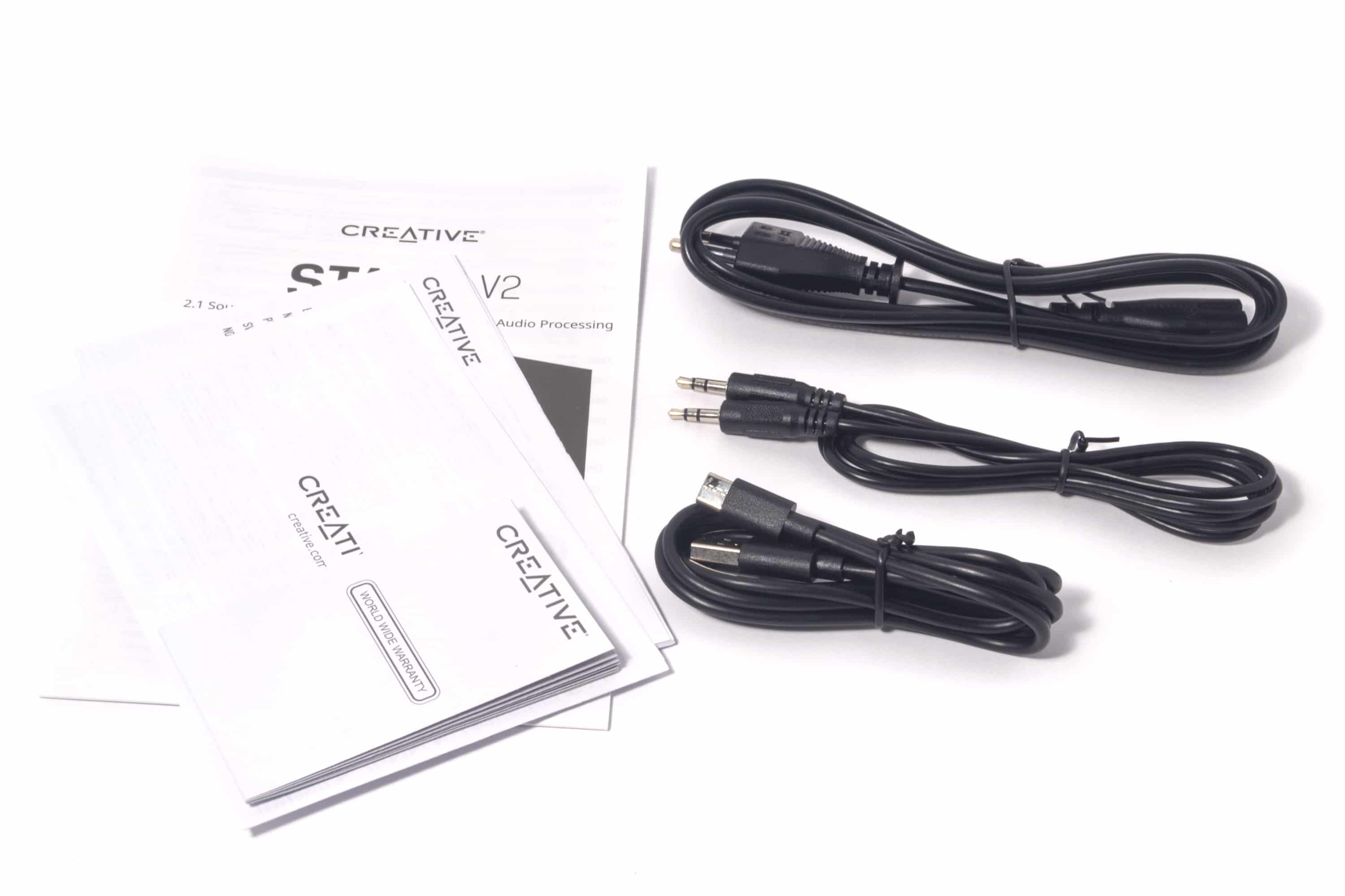 Neben der Stage V2, die aus zwei Teilen, Soundbar und Subwoofer, besteht, enthält der Produktkarton noch ein 3,5-mm-Aux-Kabel, ein USB-C-auf-USB-A-Konverter-Kabel, Informationsblätter und eine Infrarot-Fernbedienung.