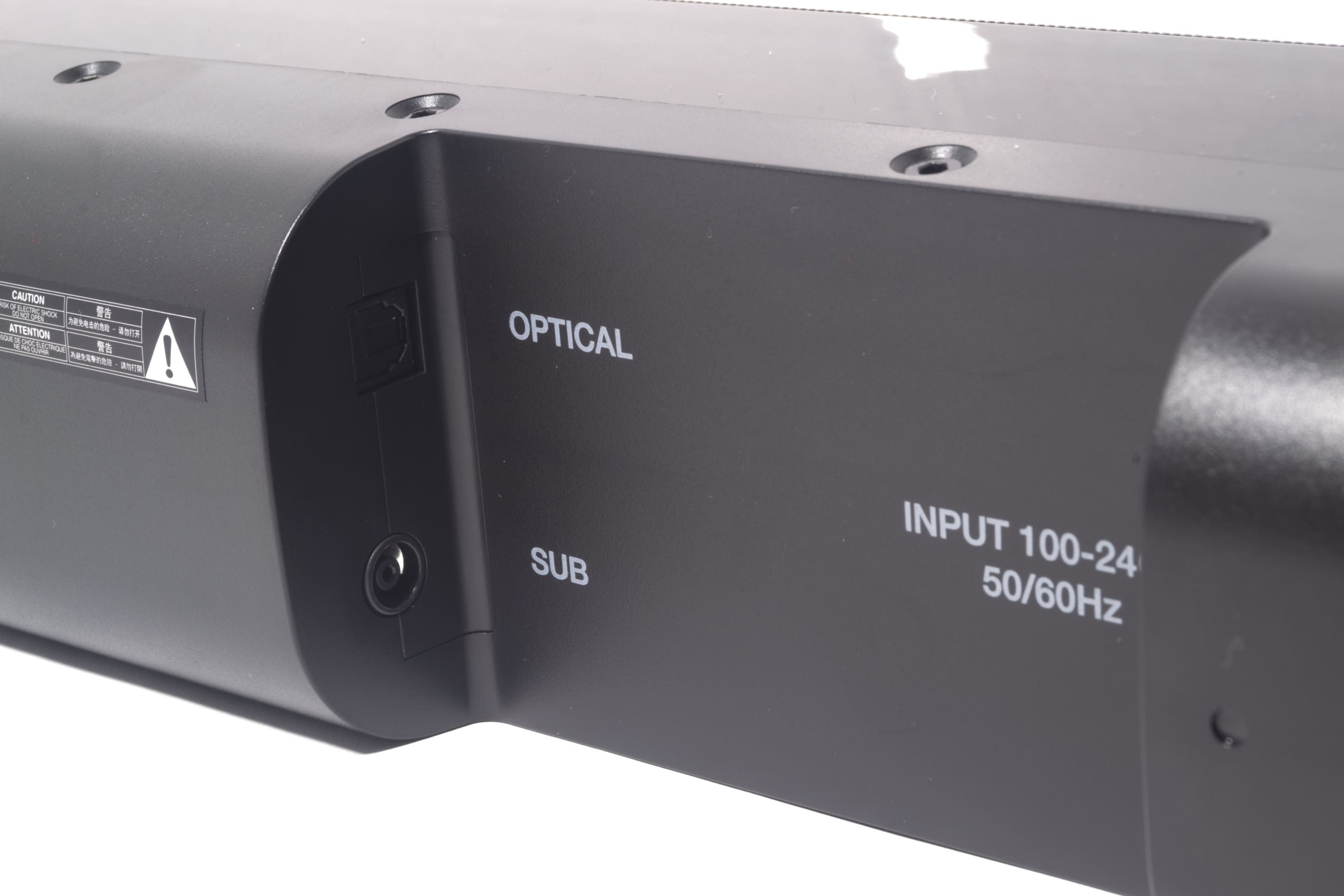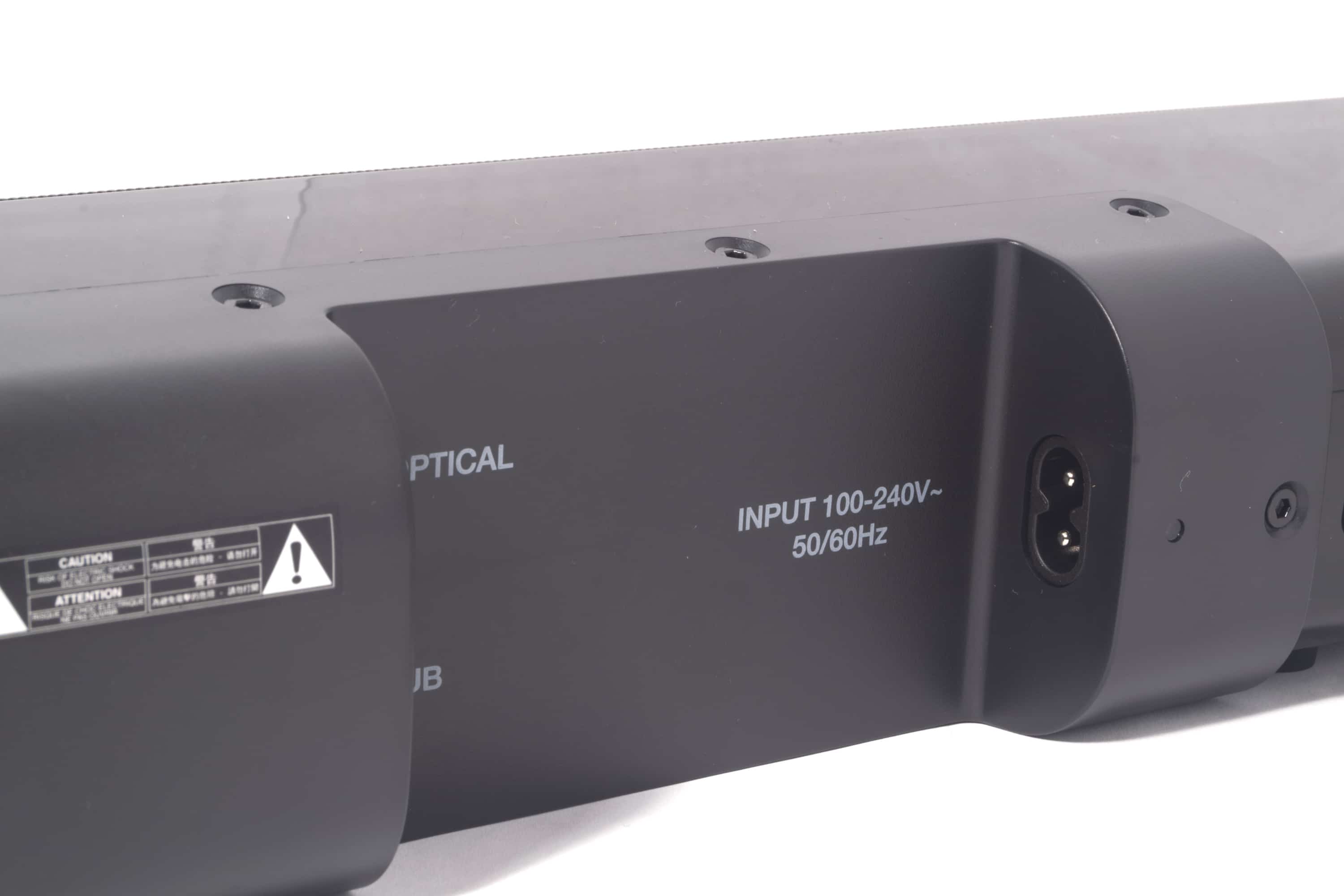 An der Rückseite der Soundbar befinden sich die diversen kabelbasierten Anschlussmöglichkeiten. Diese sind längs im Gehäuse eingelassen, wodurch das Kabelmanagement bei einer an einer Wand angebrachten Soundbar elegant gelöst werden kann.