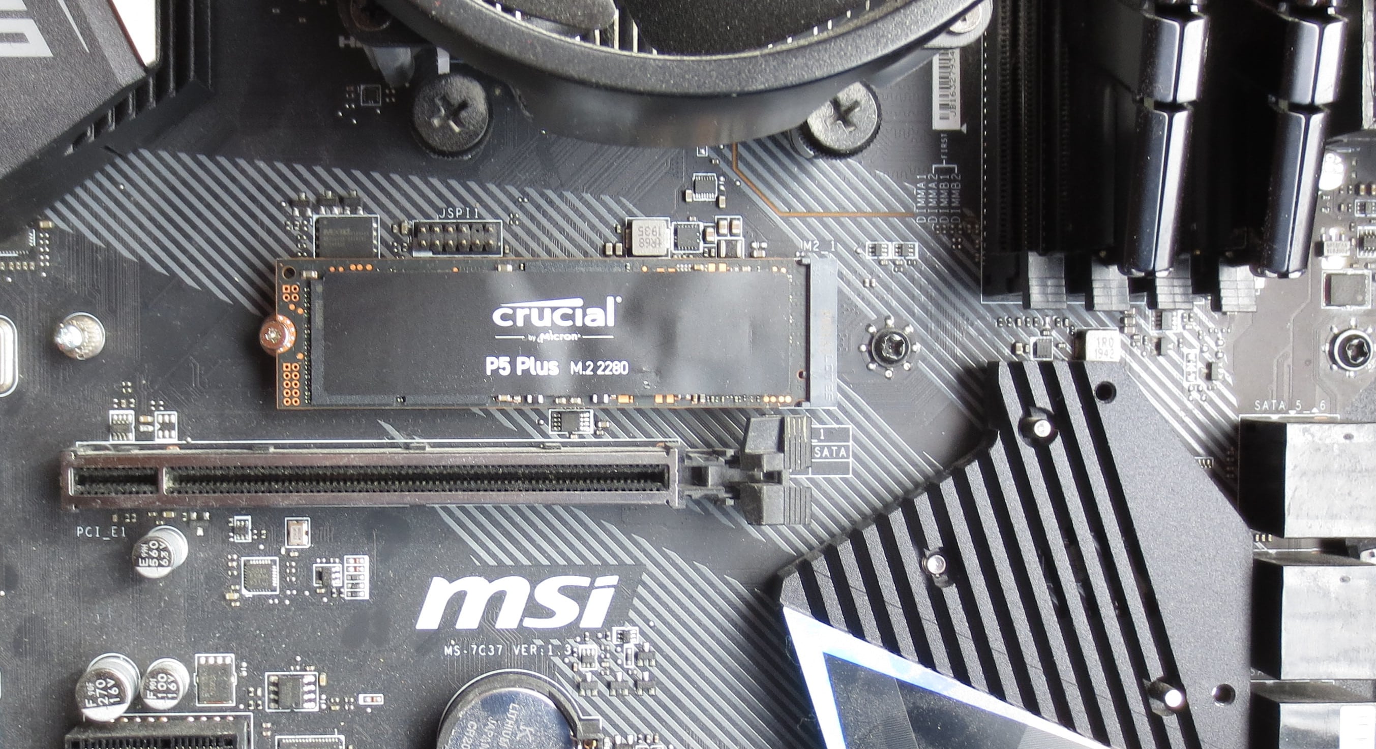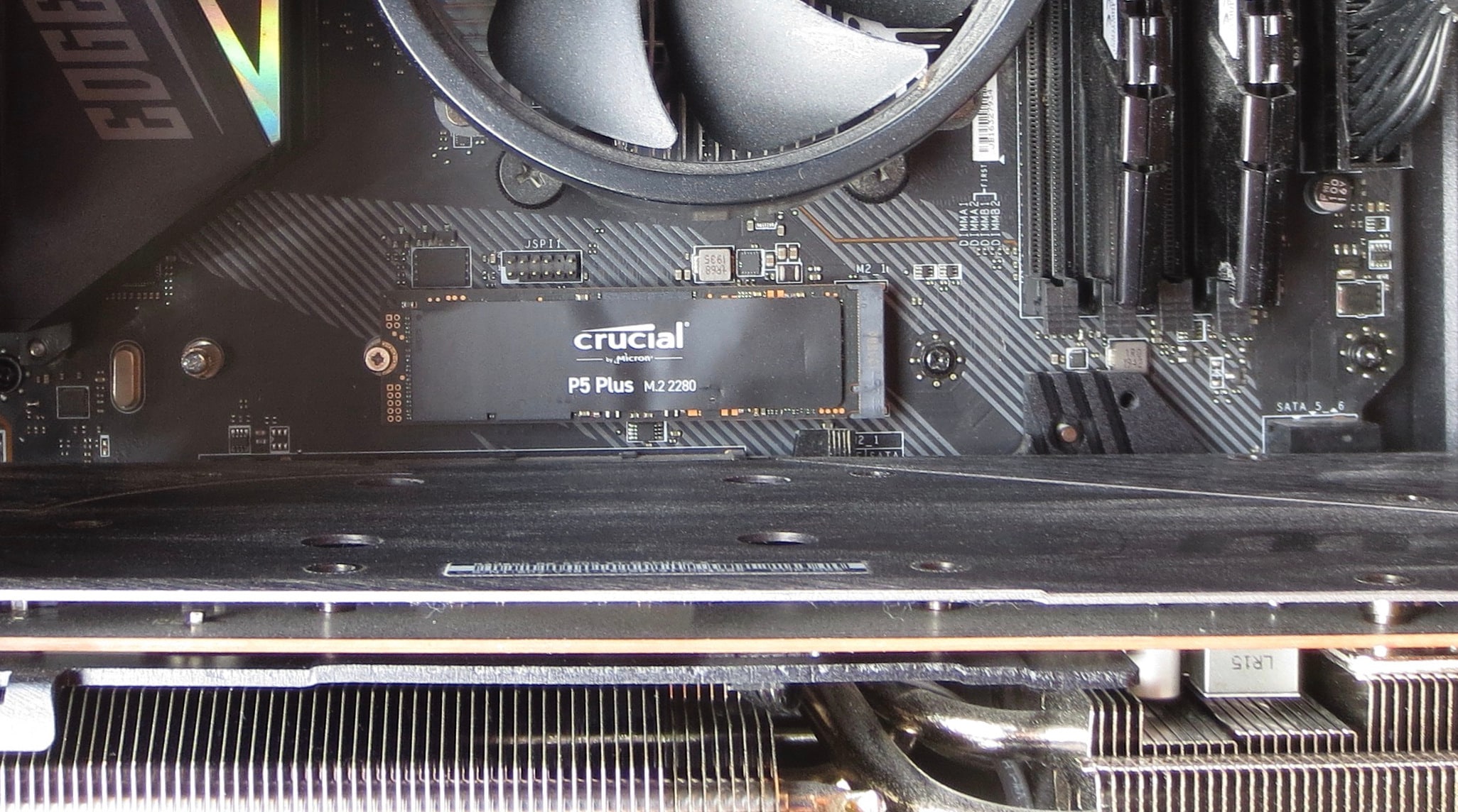 Der Einbau der P5 Plus erfolgt zuallererst auf den zweiten M.2 Slot des Mainboards, da auf dem ersten die 980 Pro installiert ist. Das Kühlkörpersystem, welches sich bei MSI „Shield Frozr“ nennt, ist von Werk am Mainboard verbaut. Ich entferne den Kühlkörper unter welchem der Abstandhalter schon auf die perfekte Länge eingestellt ist und neben dem sich noch eine gummierte Auflage befindet. Die P5 Plus wird im 30° Winkel installiert und kann einfach heruntergedrückt werden. Anschließend befestige ich die M.2 SSD mit der im Blister enthaltenen Schraube für den Abstandhalter. Im nächsten Schritt entferne ich dann noch die Schutzfolie der Wärmeleitpads vom Kühlkörper, welche natürlich ebenfalls schon im Auslieferungszustand auf dem Kühlkörper fest installiert sind. Nachdem der Kühlkörper installiert wurde, ist der Einbau damit abgeschlossen. Ebenfalls auf dem Board zu sehen ist der kleine Lüfter, welcher neben dem Chipsatz auch die Kühlkörper der M.2 SSDs mit kühler Luft versorgt.