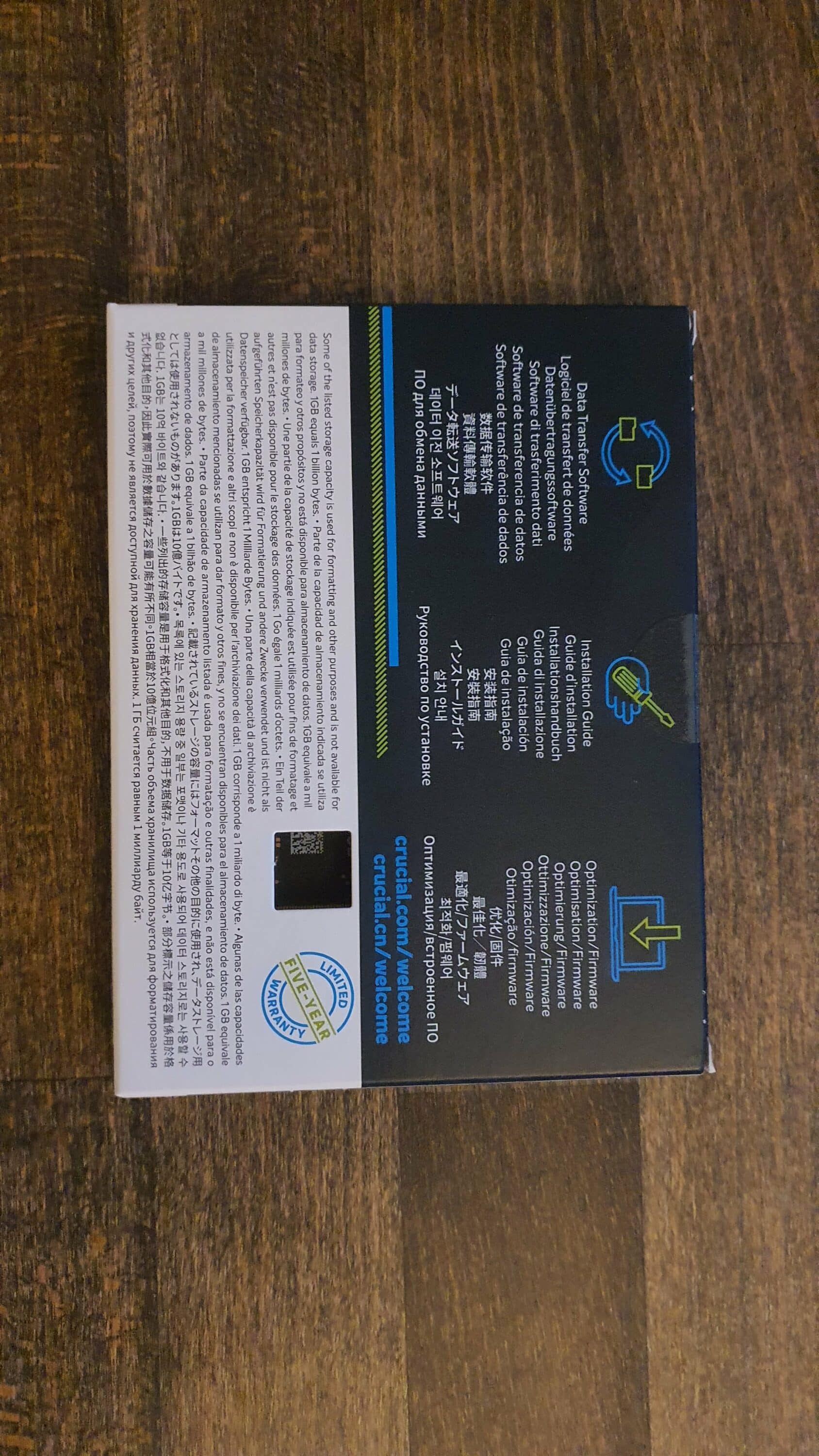 Im Zubehör befindet sich auch noch ein mehrsprachiger Flyer. In diesem wird jedoch nur auf die Garantie über 5 Jahre, die Installationsanleitung und Software (SSD Verwaltungstool und Migrationssoftware) auf der Webseite von Crucial hingewiesen.